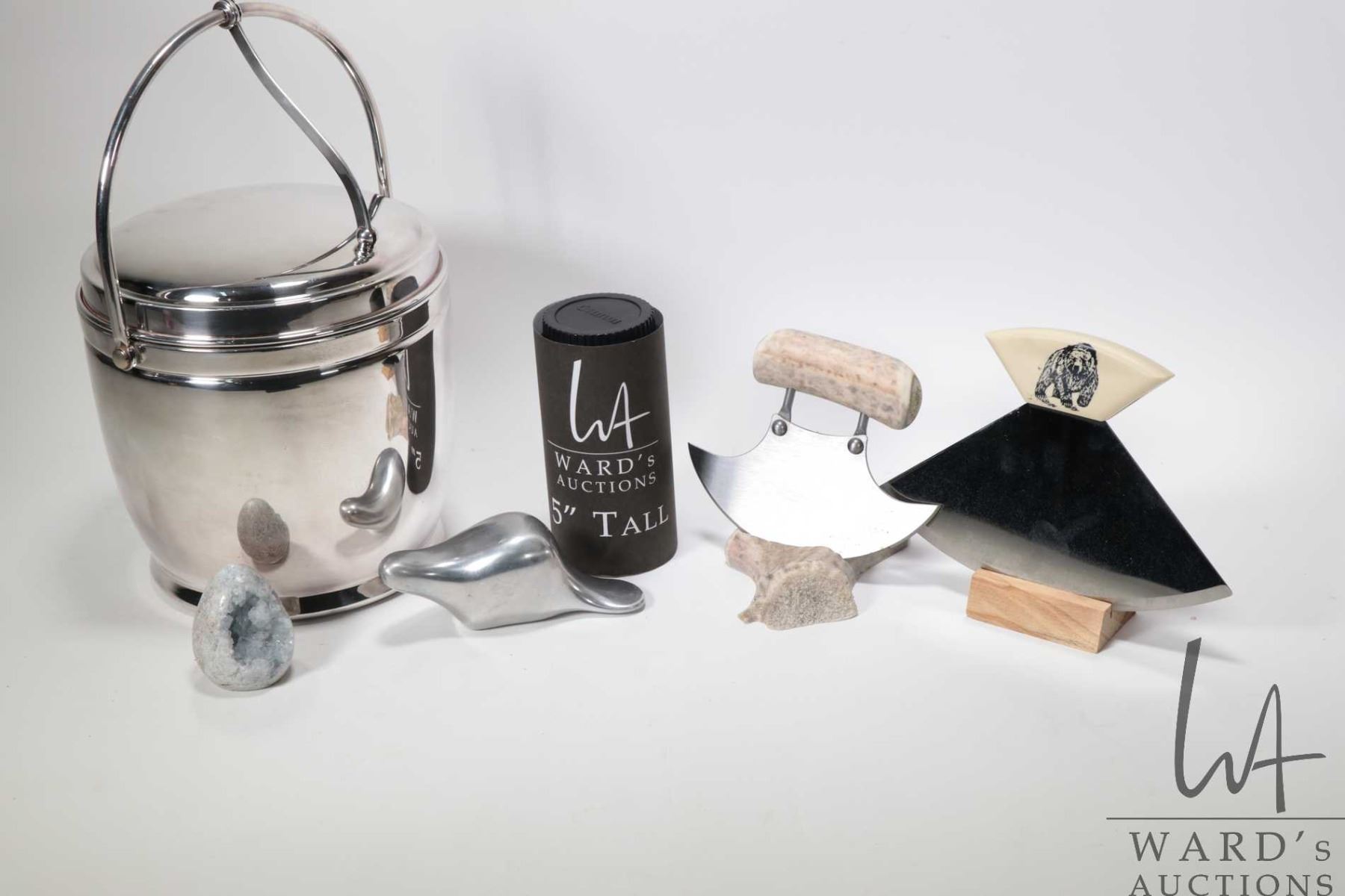 Twp Ulu Maker knives by Mike Moore, chrome ice bucket, pewter beaver paperweight and a egg shaped geode