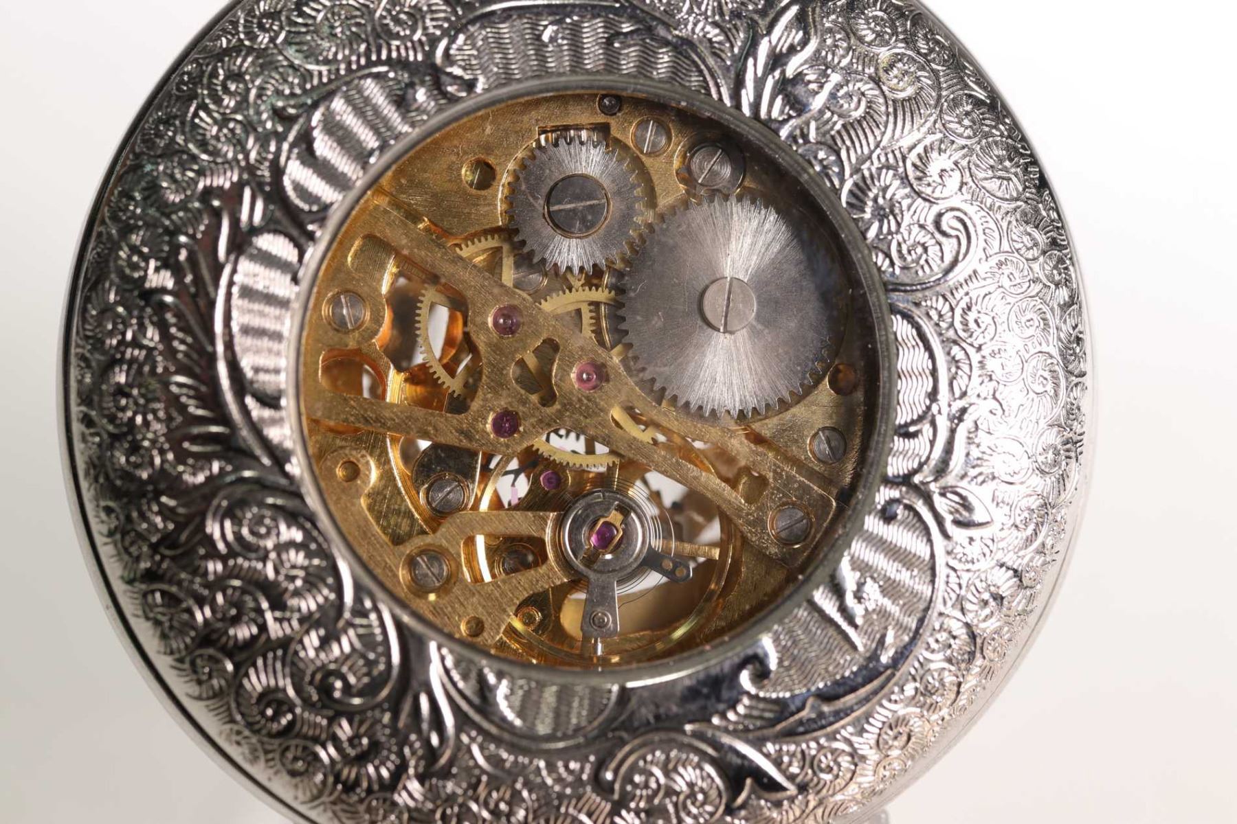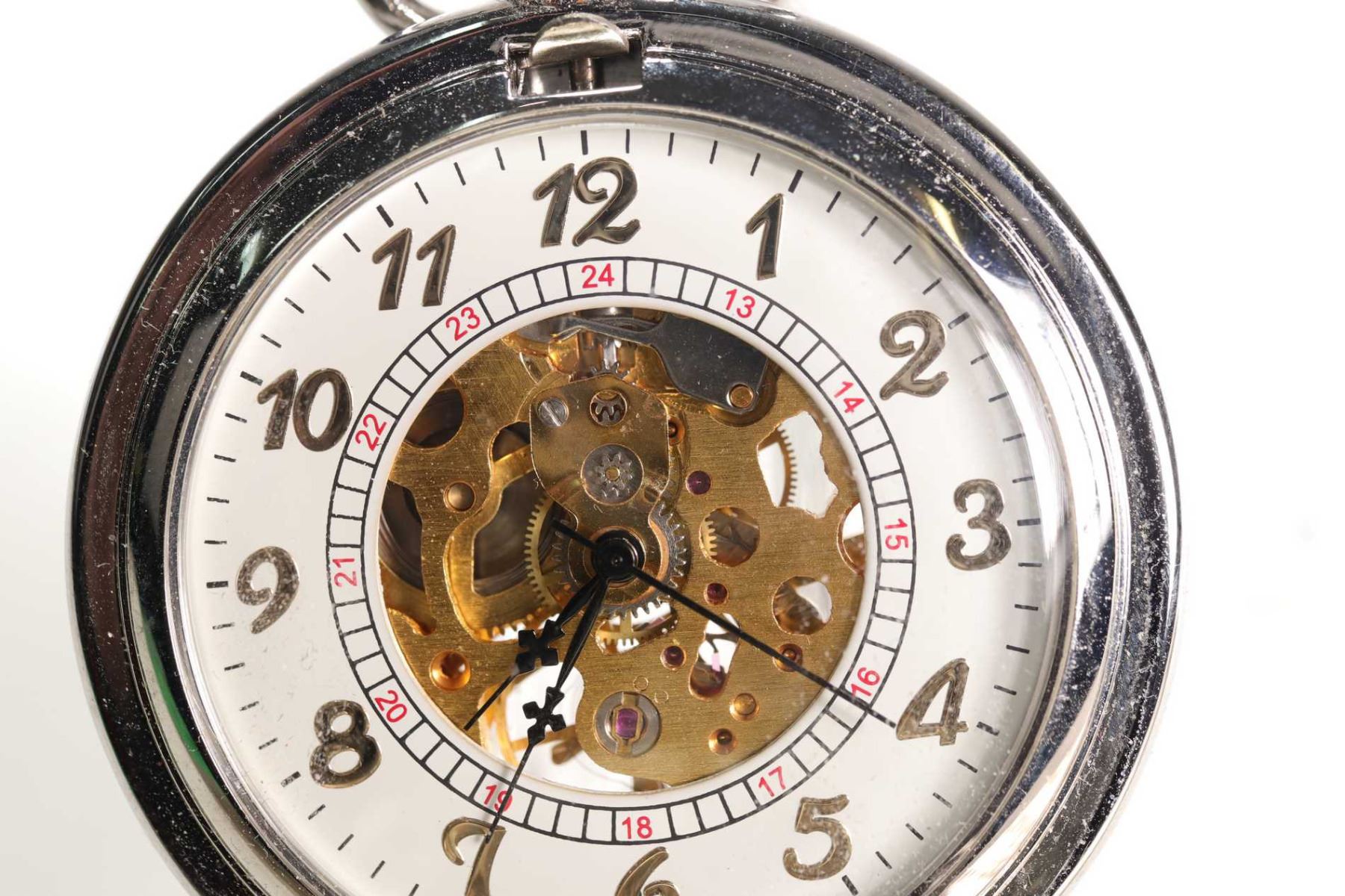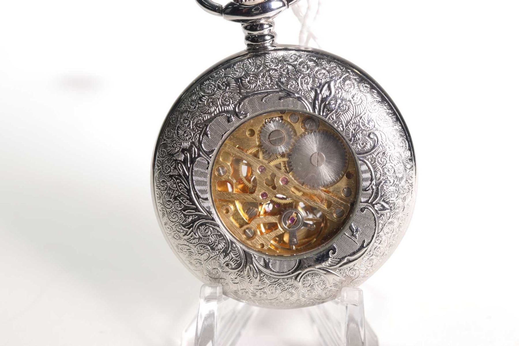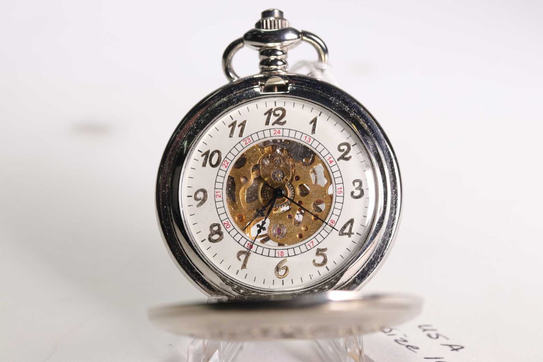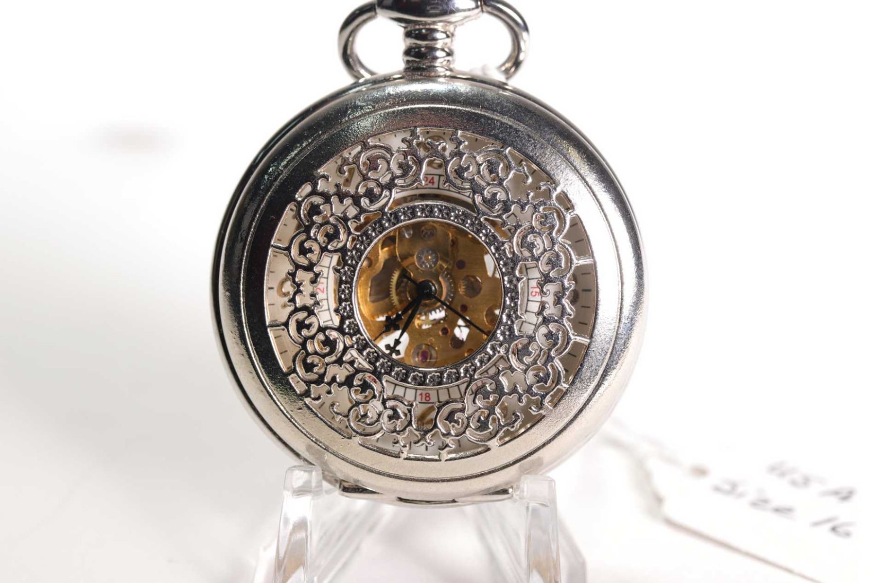USA 1/2 hunter mechanical size 16, jewelled vintage style pocket watch. Stem wind and set movement with white porcelain dial and gold Arabic number with fancy matching hands. Housed in a hinged 1/2 hunter stainless steel salesman's style case. This watch has an open skeletal style concept showing the movement through the front and back covers and the case is ornately engraved. Working at time of cataloguing