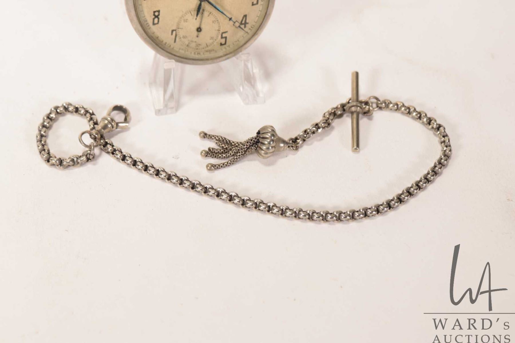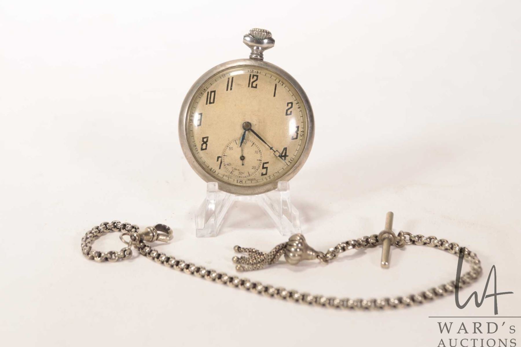 Umarked Swiss made pocket watch in silver/ silver like case, single sunk second sweep and Arabic numerals, working at time of cataloguing, includes pocket watch chain