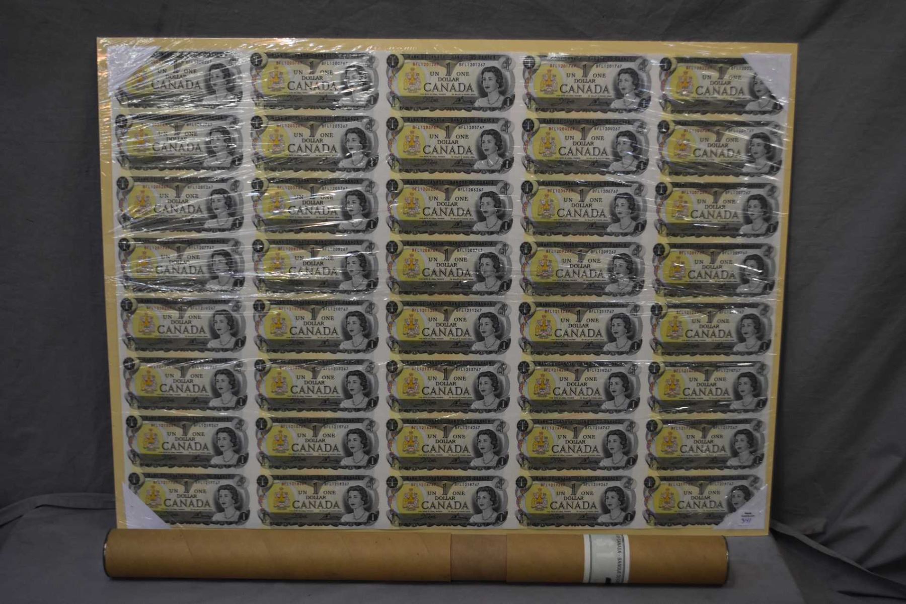 Uncut sheet of twenty five1973Canadian one dollar bills with original shipping tub