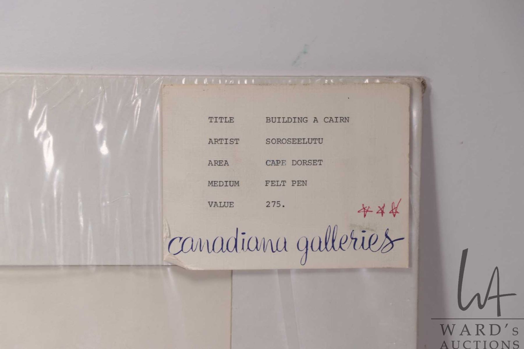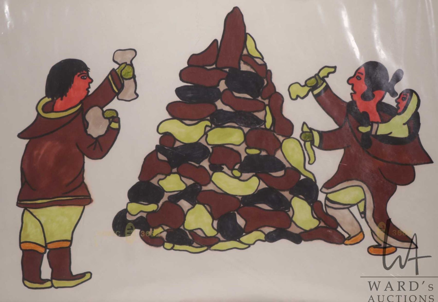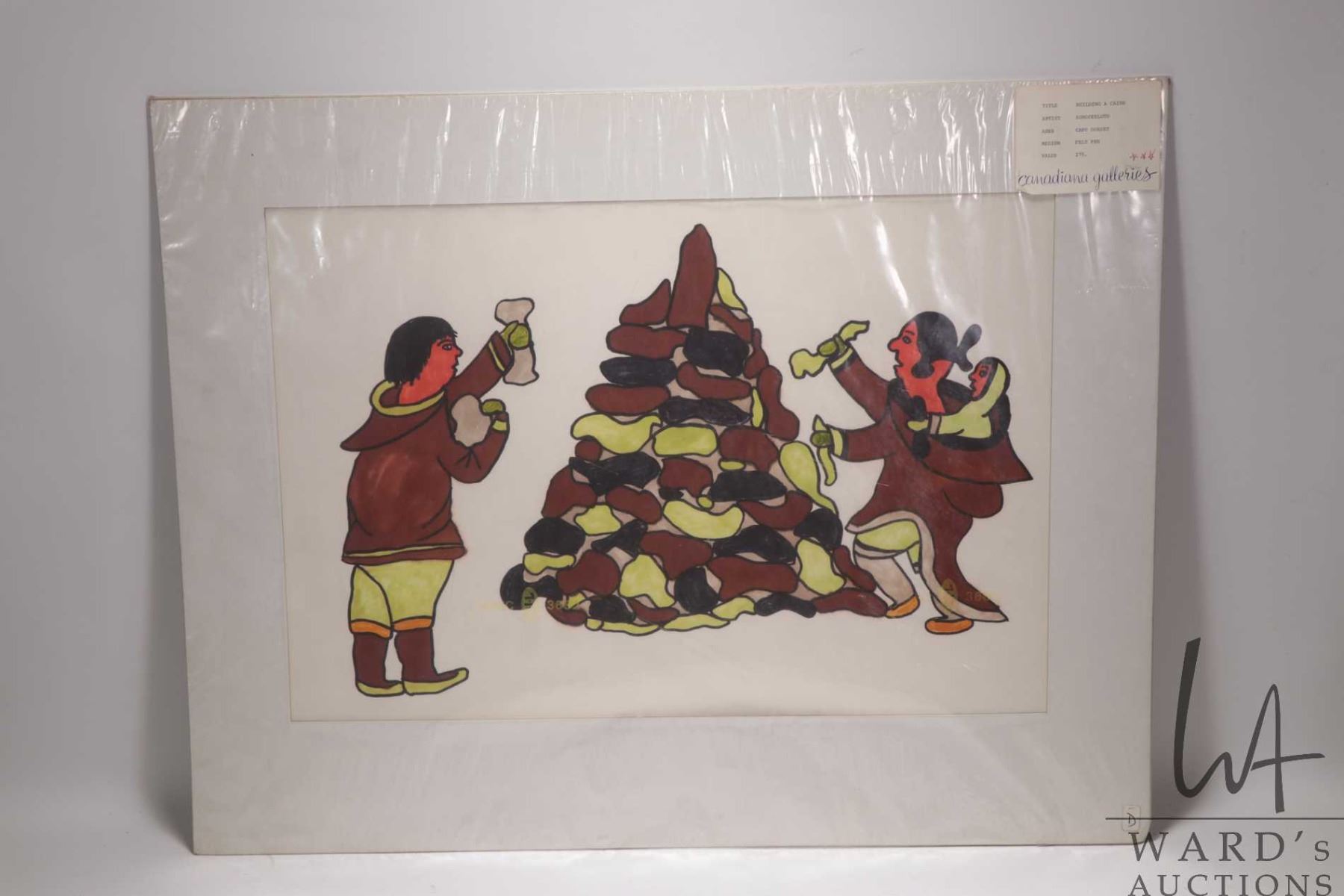 Unframed coloured felt pen drawing titled " Building A Cairn", signed in syllabics by artist Soroseelutu, Cape Dorset, 15" X 22"