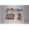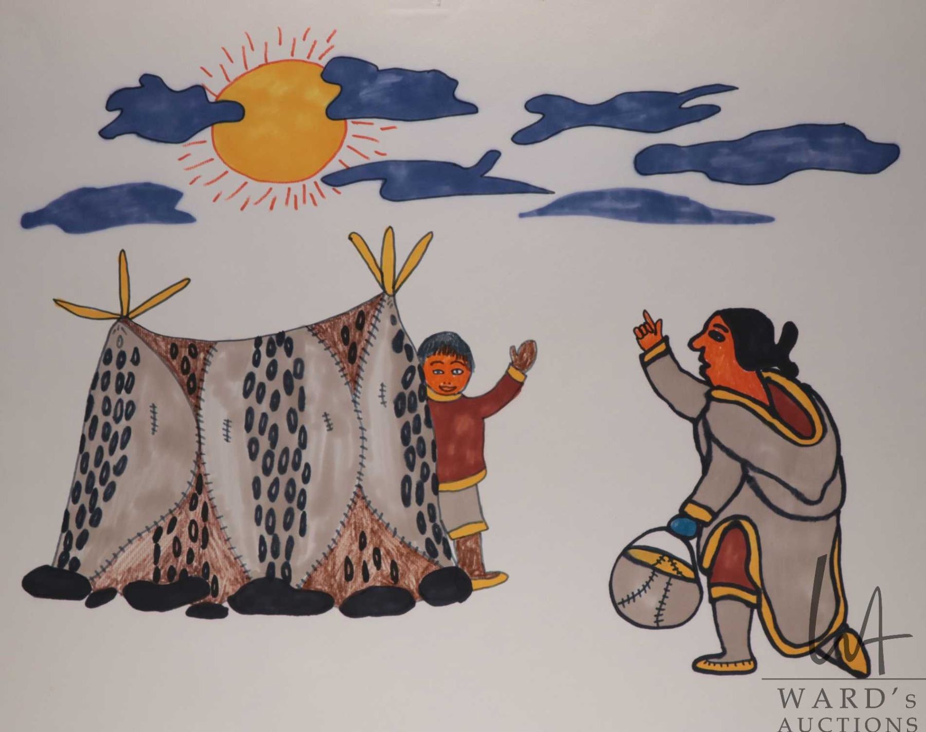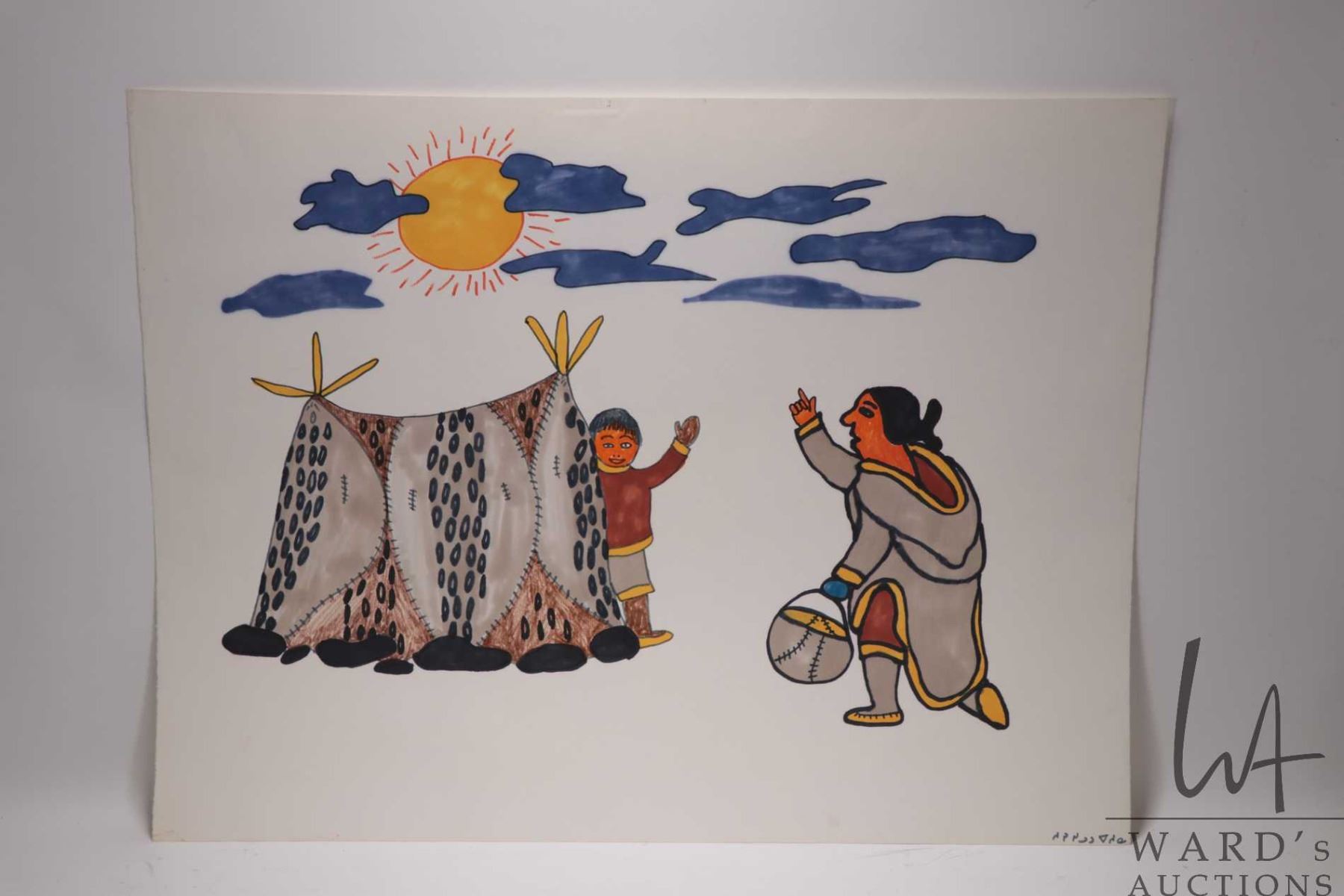 Unframed coloured felt pen drawing titled "Good Morning" and signed in syllabics by artist Pitseolak, Cape Dorset, 20" X 26"
