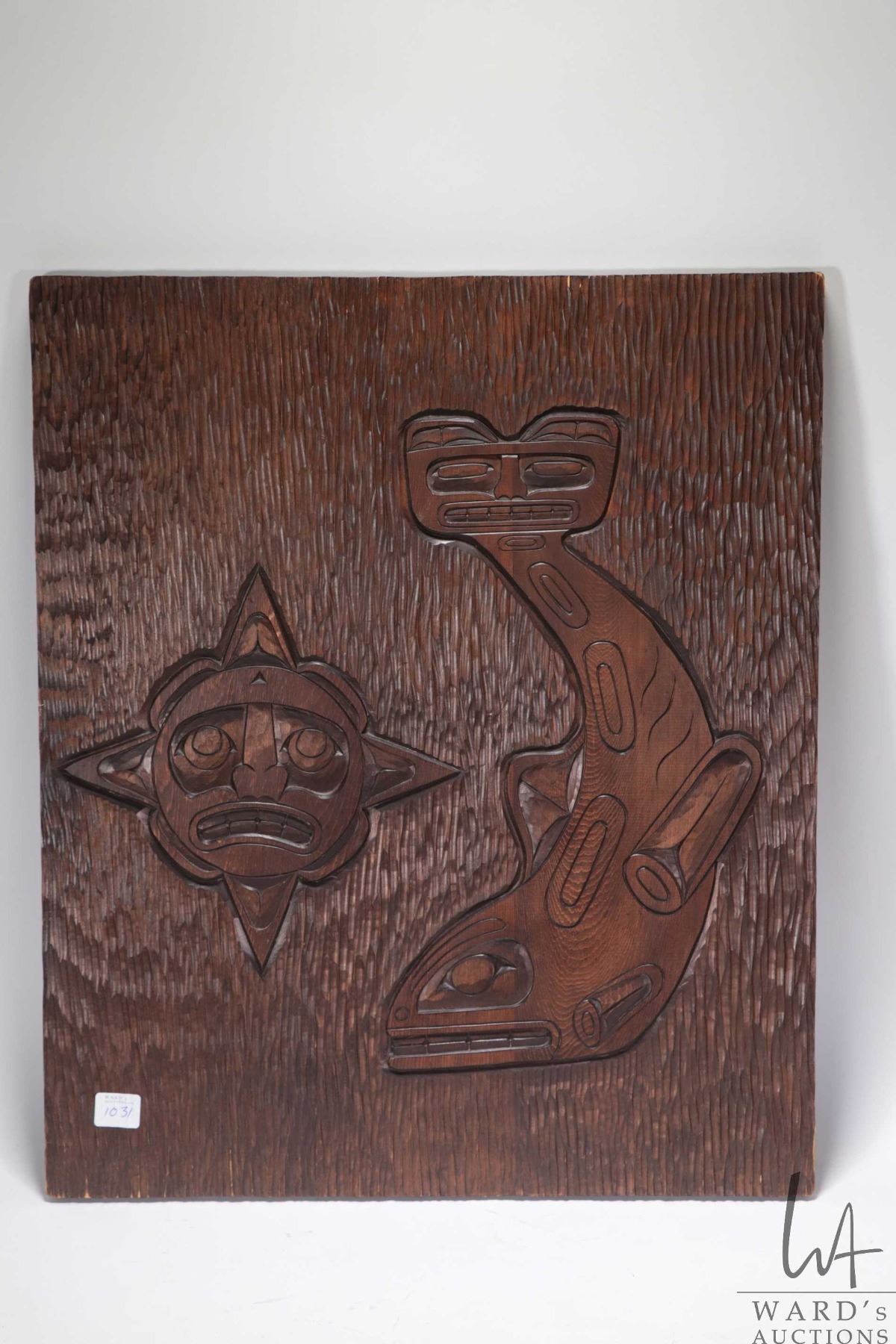 Unframed, hand carved Haida panel, signed on verson in syllabics and retains original Indian Affairs and Northern Development Canada label, 20 1/2" X 17". Shipping Note: Artwork cannot be insured by any shipping or courier companies in Canada. Ward's Auctions will endeavor to adequately pack these items but the risk falls to the buyer in the event of damage. Local pickup is recommended