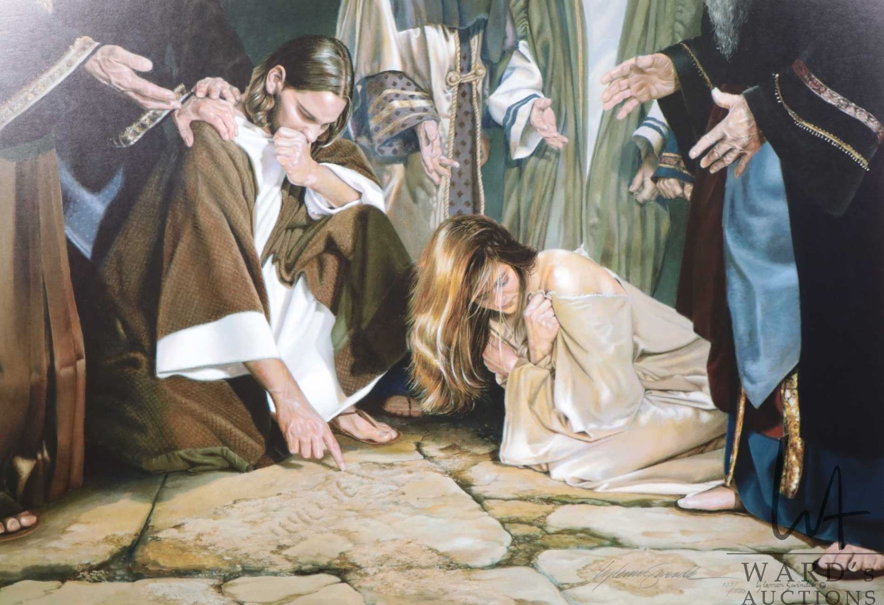 Unframed limited edition, artist signed print "He that is without sin" pencil signed Liz Lemon Swindle, 137/750, 15" X 23"