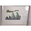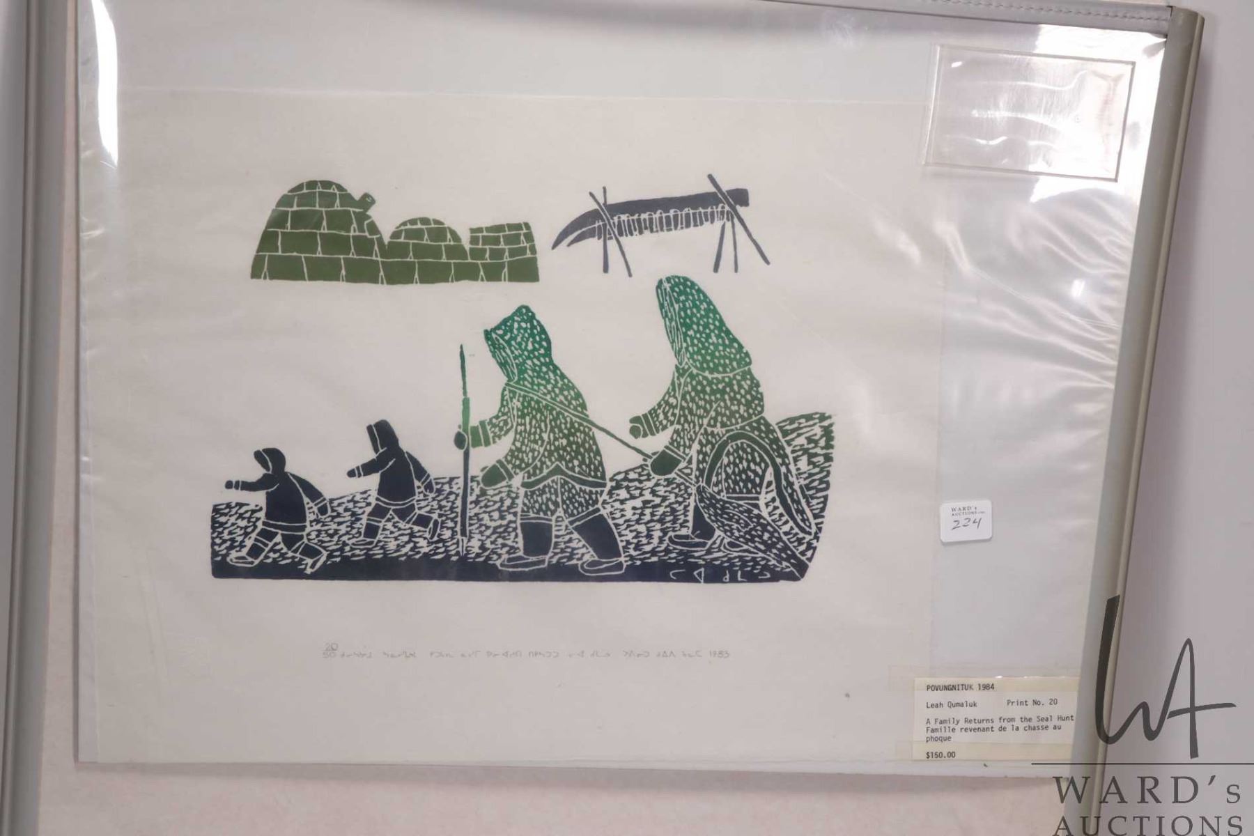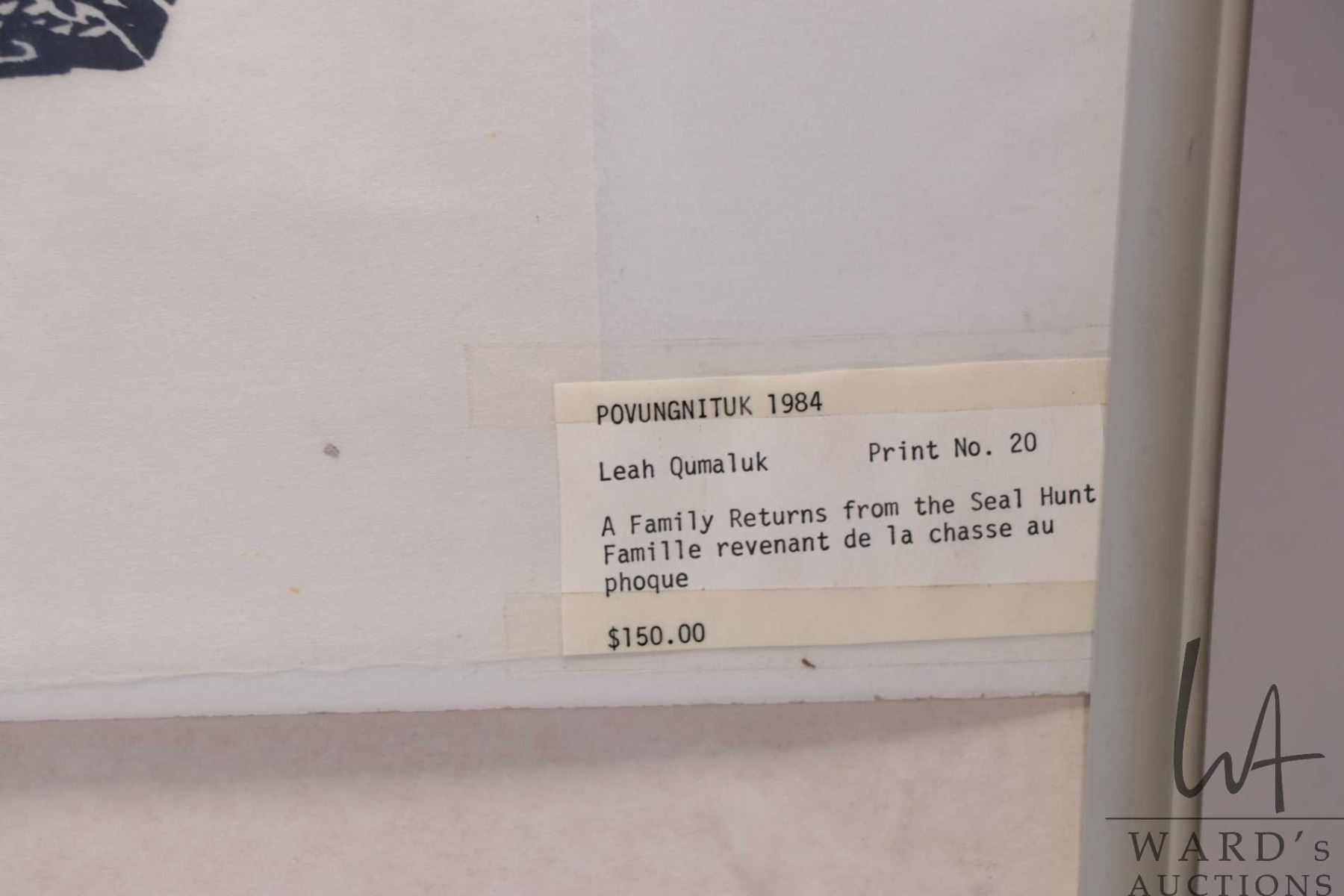 Unframed limited edition stencil print, titled "A Family Returns from Seal Hunt", signed in syllabics by artist Leah Quamulak, Povungnituk, 20/50, 12" X 16"