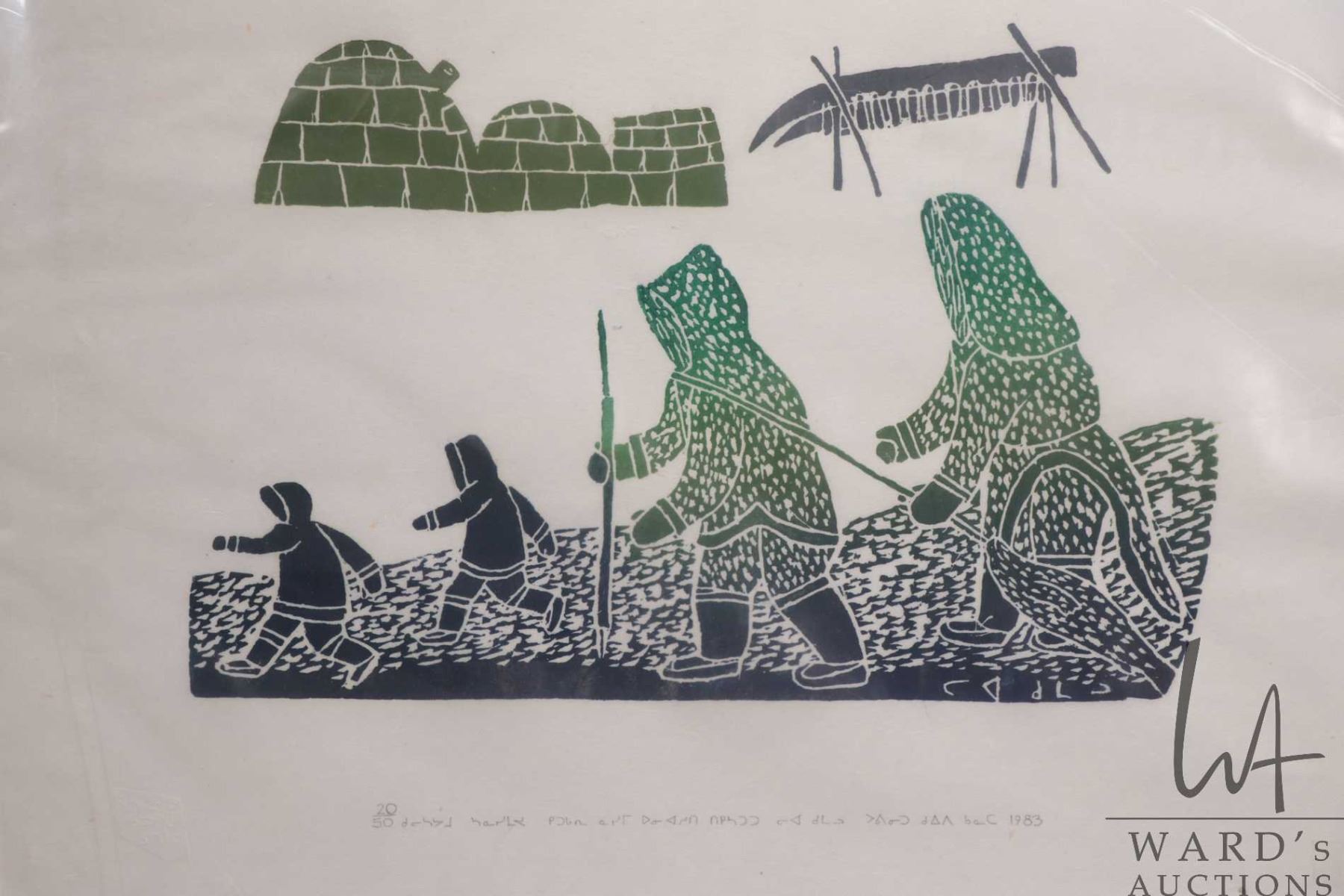 Unframed limited edition stencil print, titled "A Family Returns from Seal Hunt", signed in syllabic