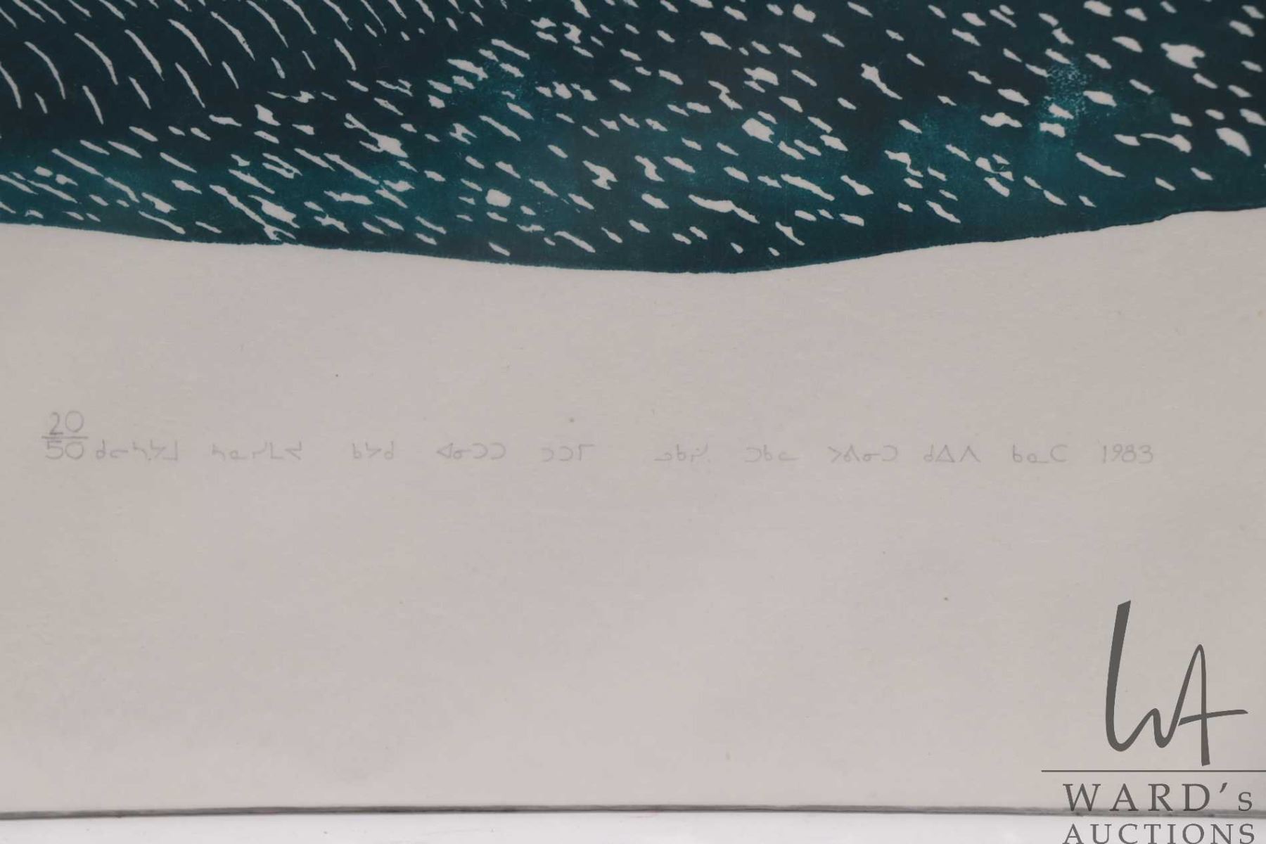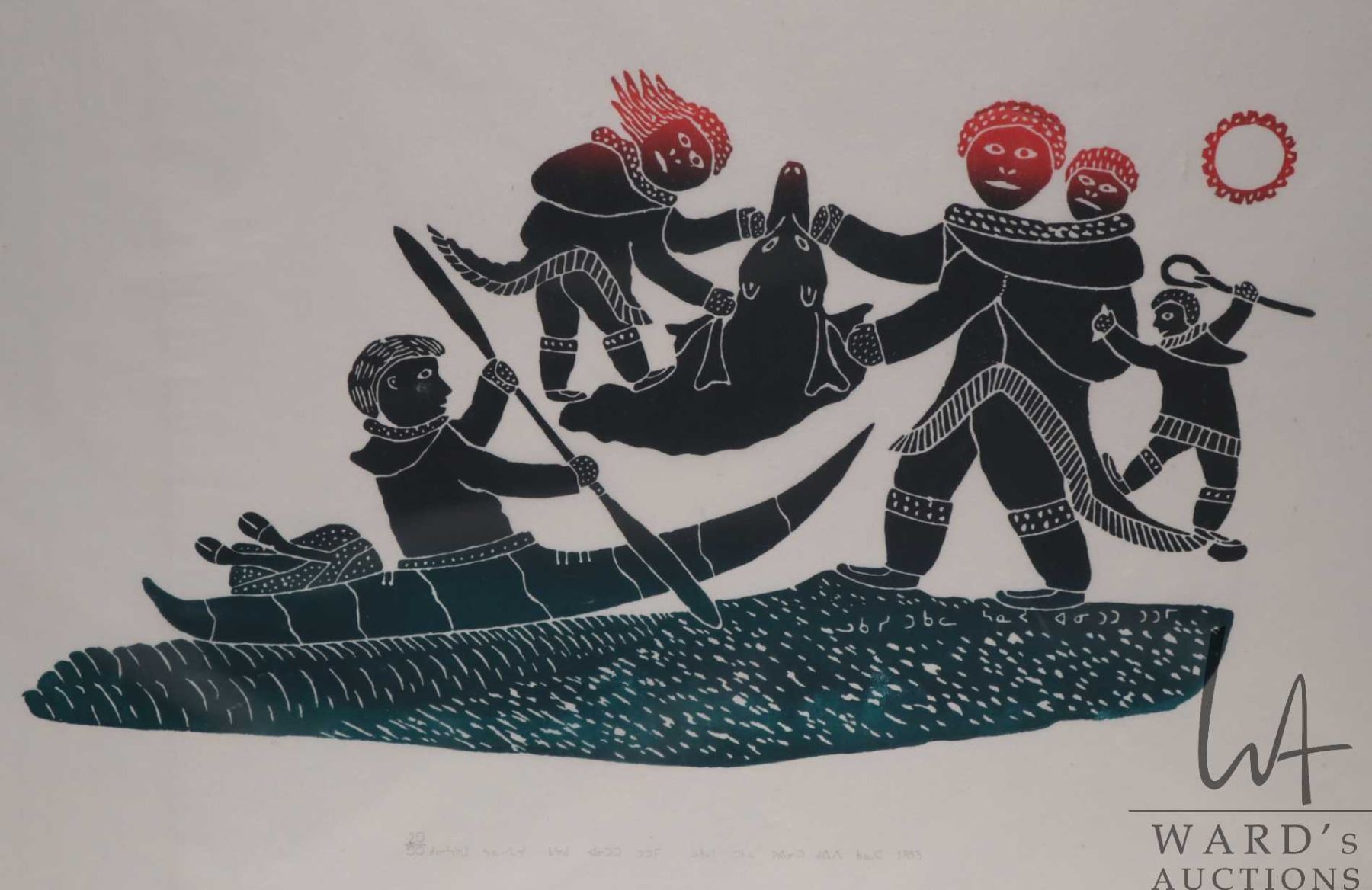 Unframed limited edition stencil print titled "Caribou Hunting by Kayak", pencil signed in syllabics