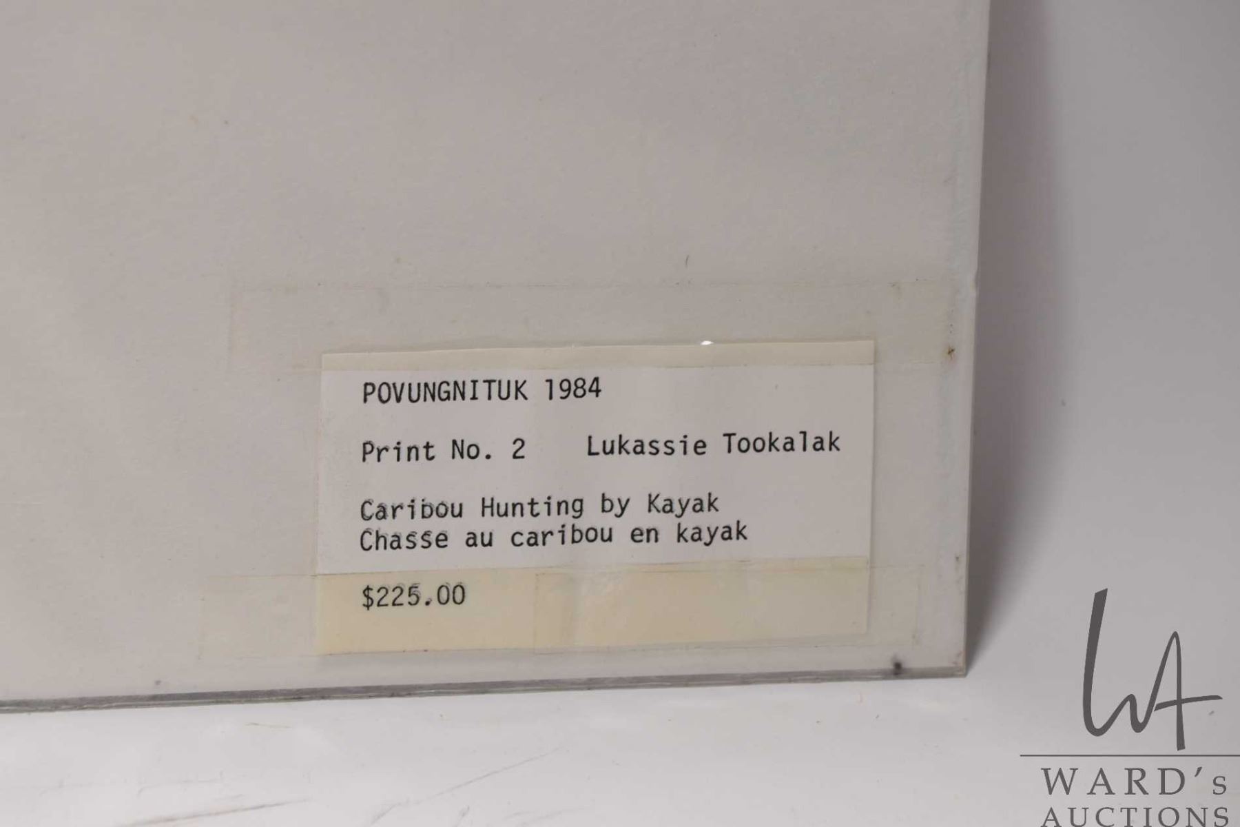 Unframed limited edition stencil print titled "Caribou Hunting by Kayak", pencil signed in syllabics by artist Lukassie Tookalak, 1983, Povungnituk, 20/50, 18" X 24"