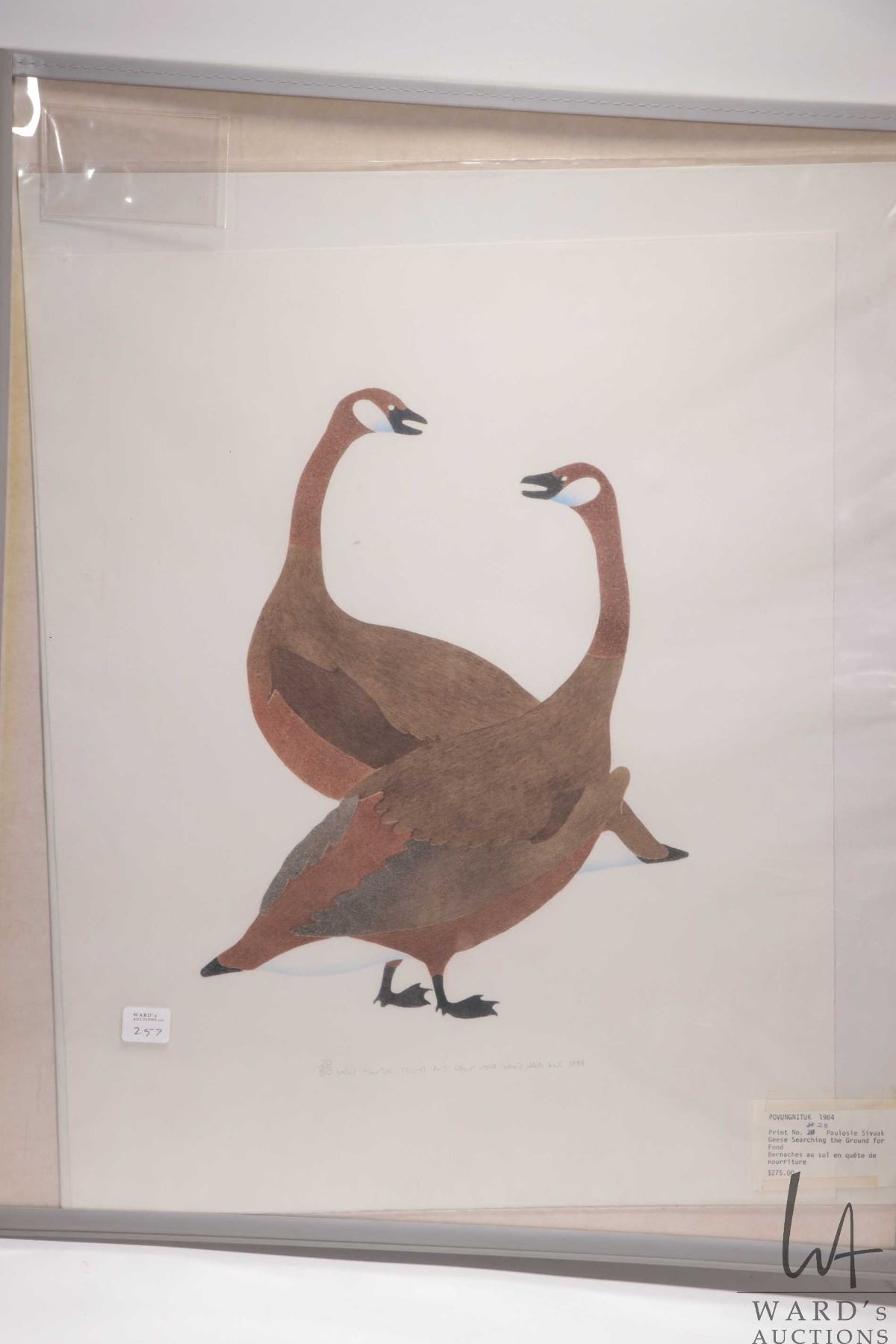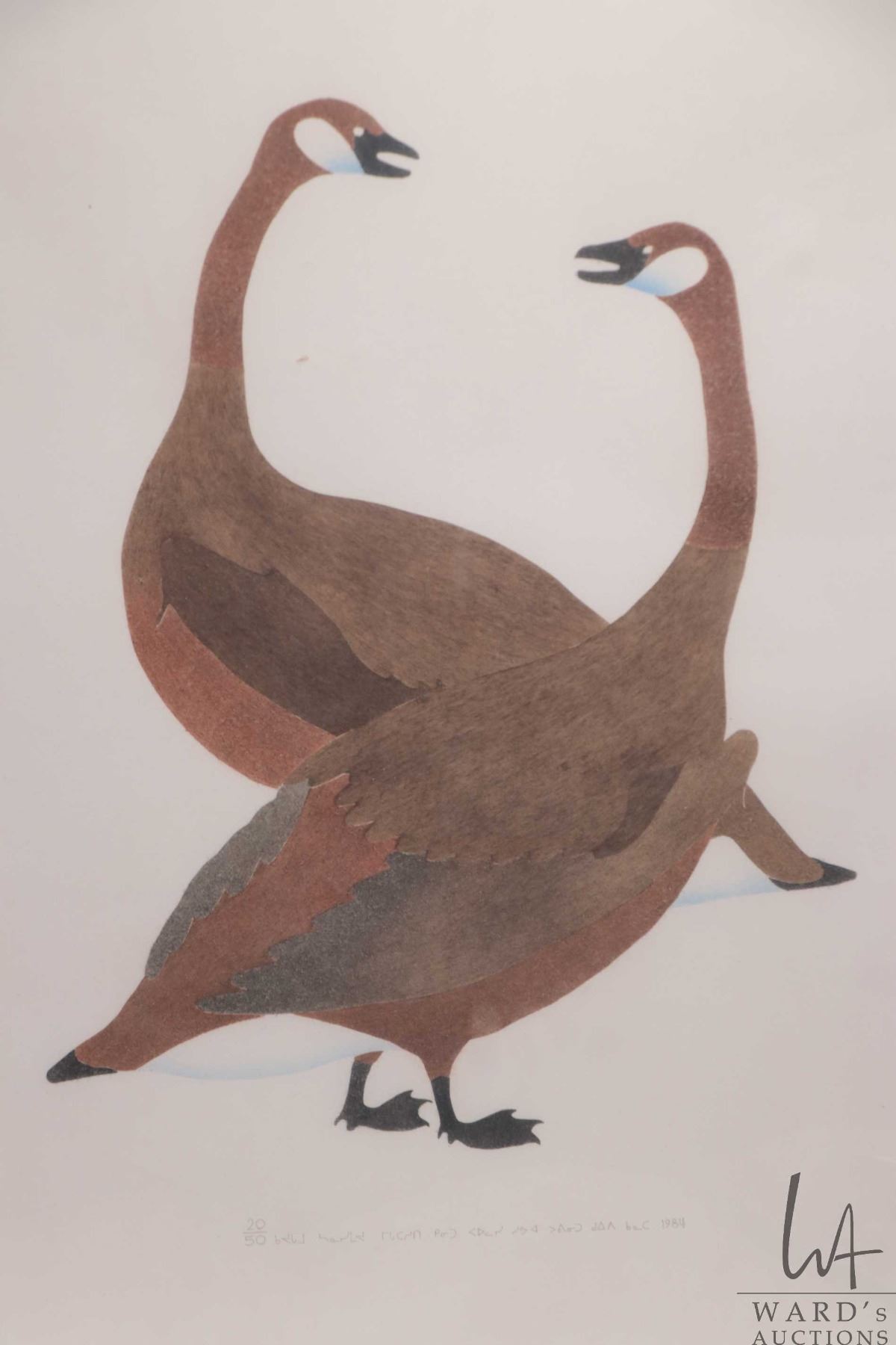Unframed limited edition stencil print, titled "Geese Searching for Food", signed in syllabics by ar