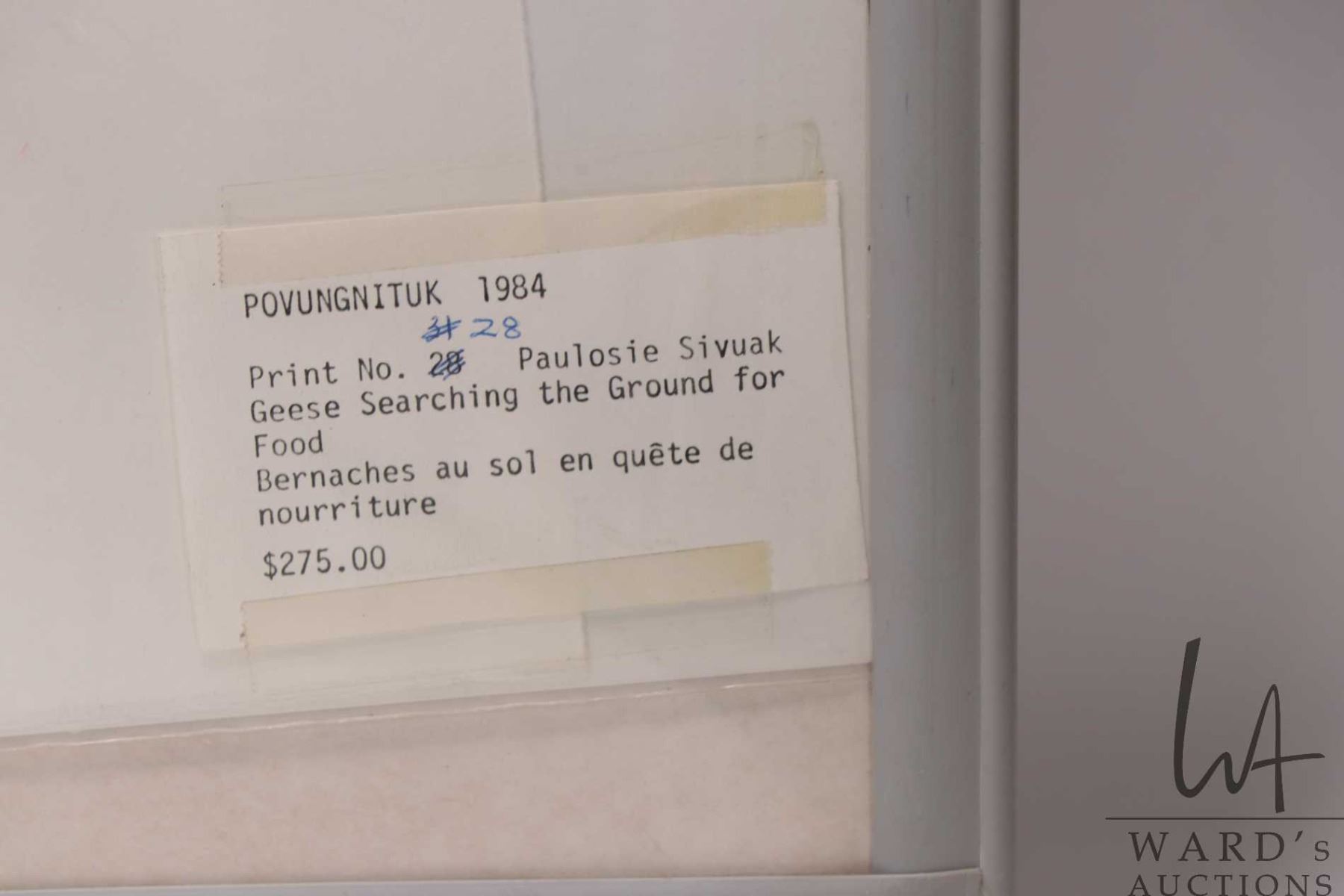 Unframed limited edition stencil print, titled "Geese Searching for Food", signed in syllabics by artist Paulosie Sivuak, 1984, Povungnituk, 20/50, 20" X 16"