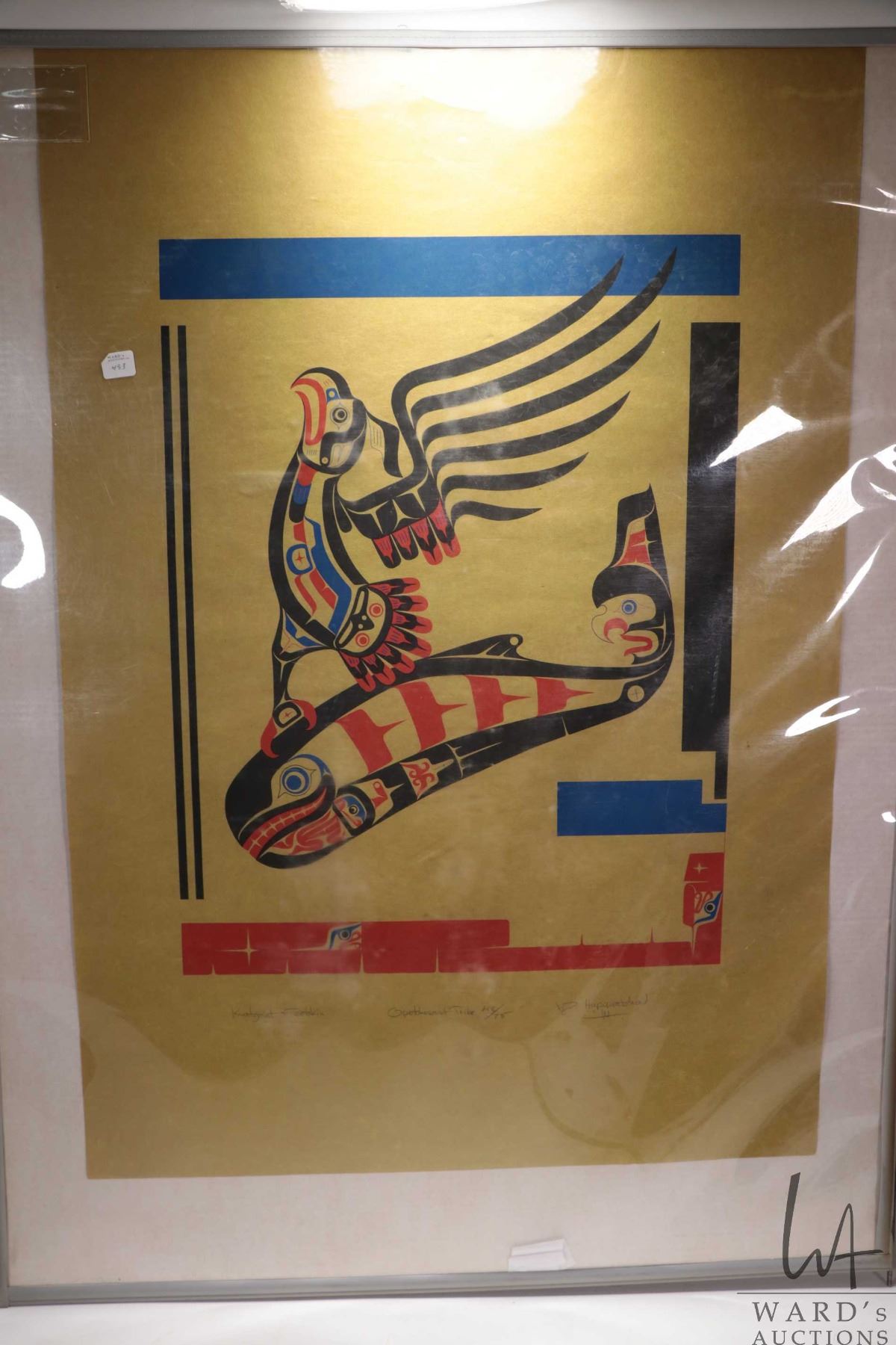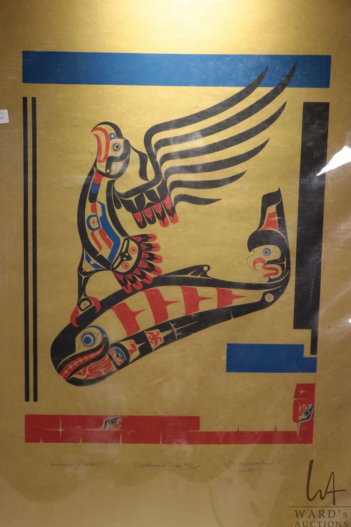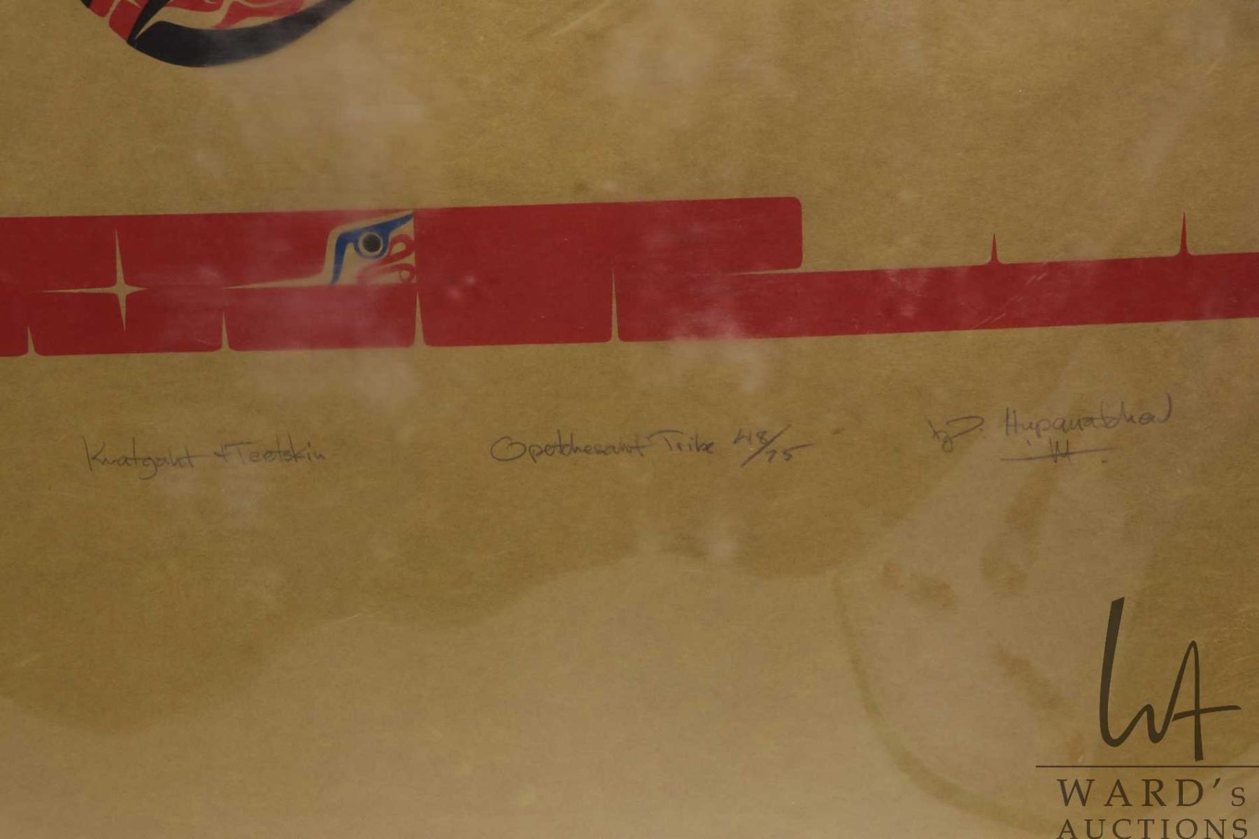 Unframed limited edition stencil print, titled " Opetchesaht Tribe", pencil signed by artists Knatgaht & Teetskins 48/75, By Hupquatchew 14, Northwest Coat Indian