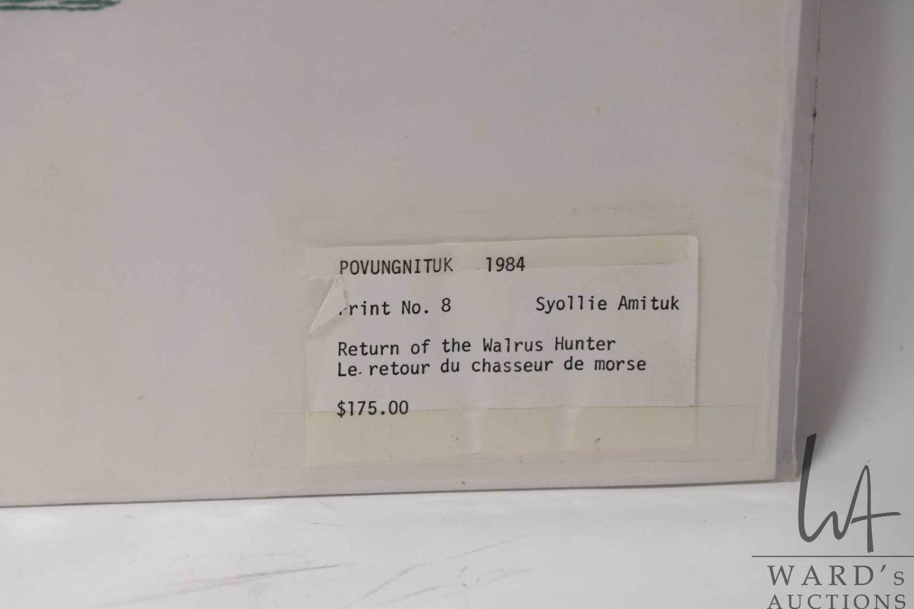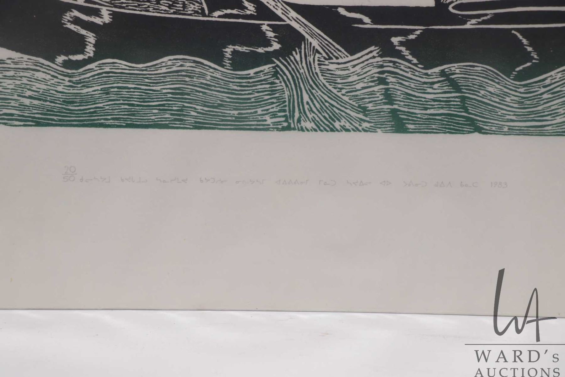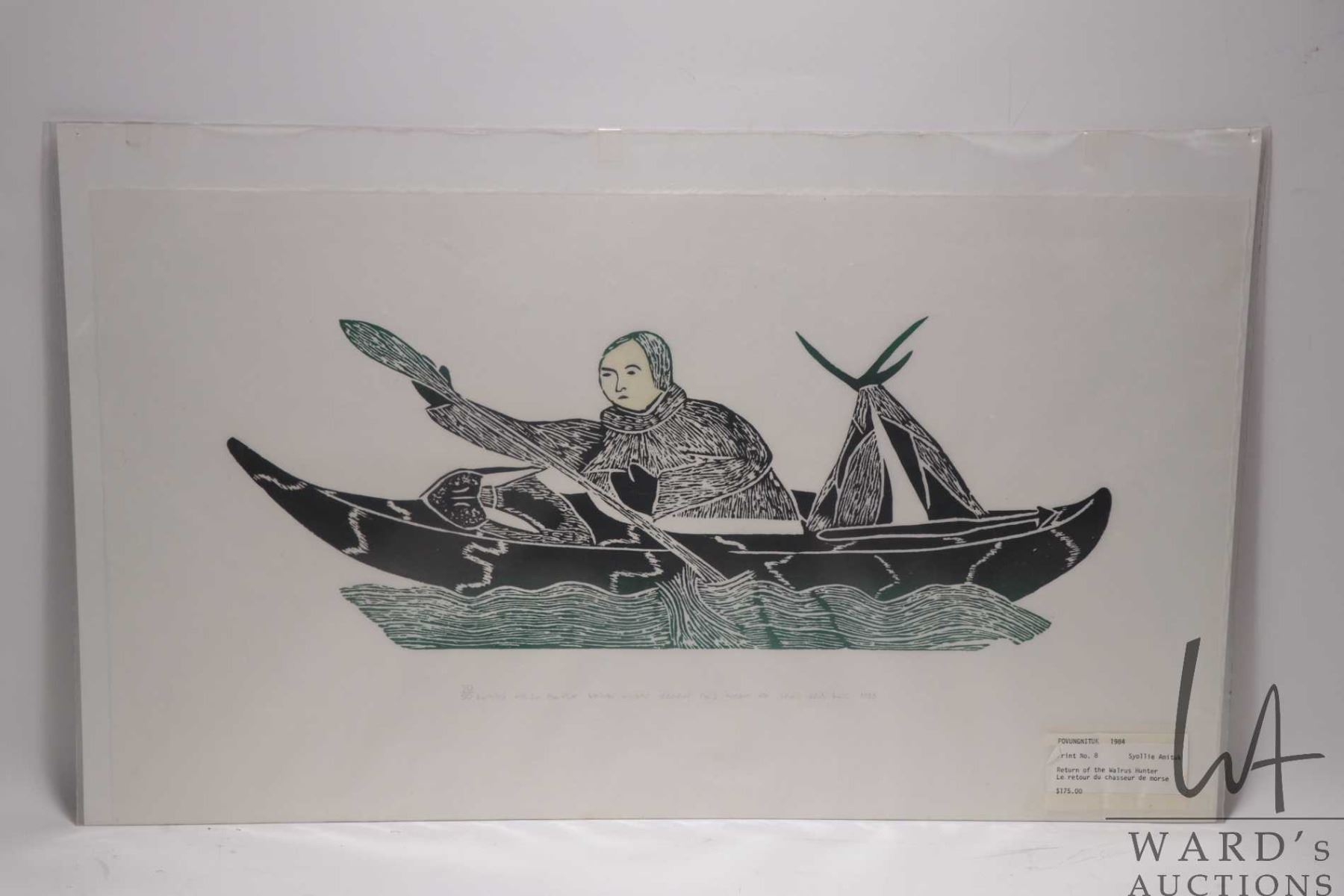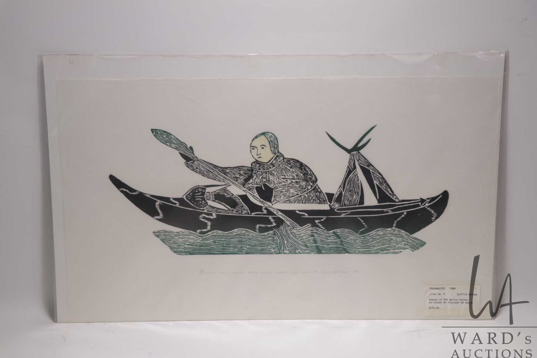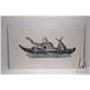 Unframed limited edition stencil print, titled "Return of the Walrus Hunter", pencil signed in syllabics by artist Syollie Anituk 1983, 20/50, 14" X 24"