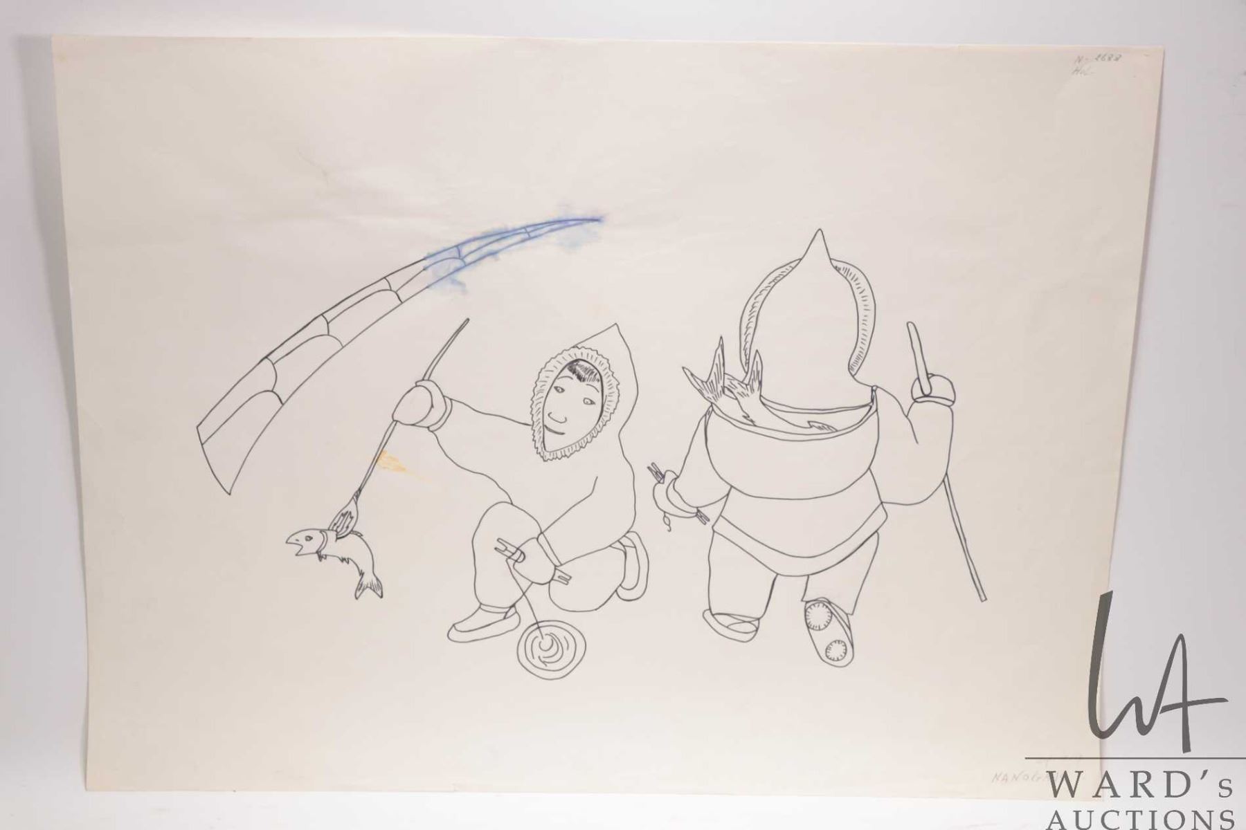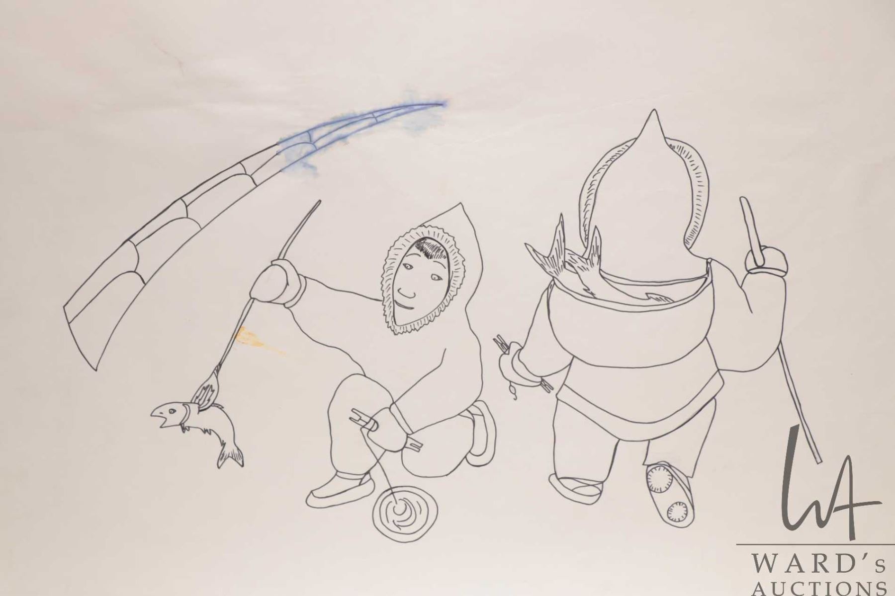 Unframed original coloured ink drawing, titled "Fishing Through The Ice" by artist Nanogak, 1969, Holman Island, 18" X 24"