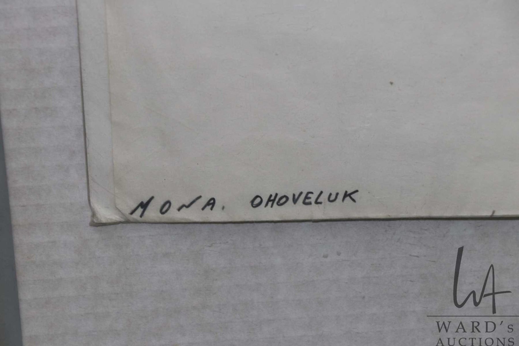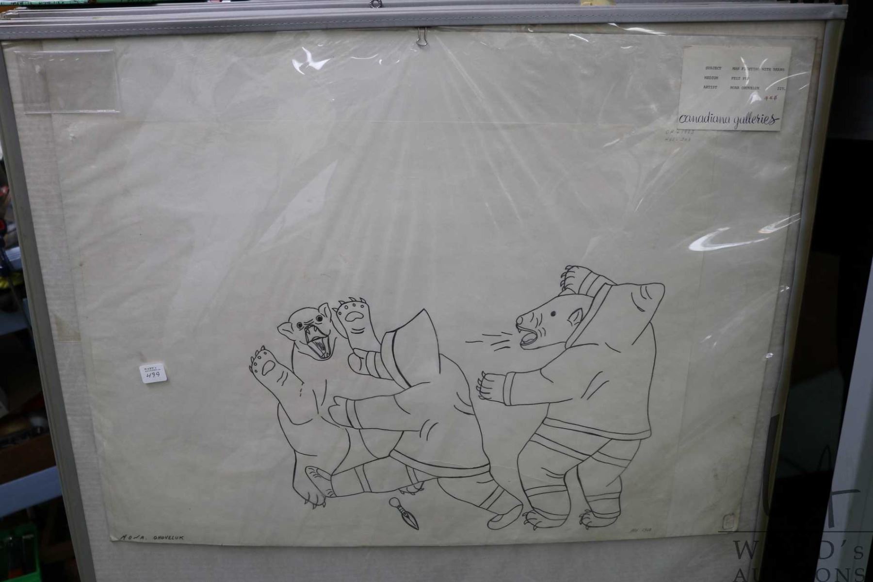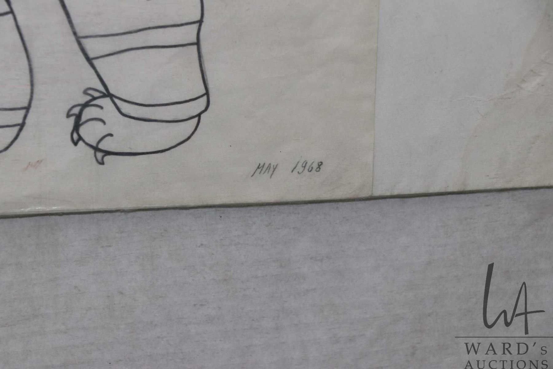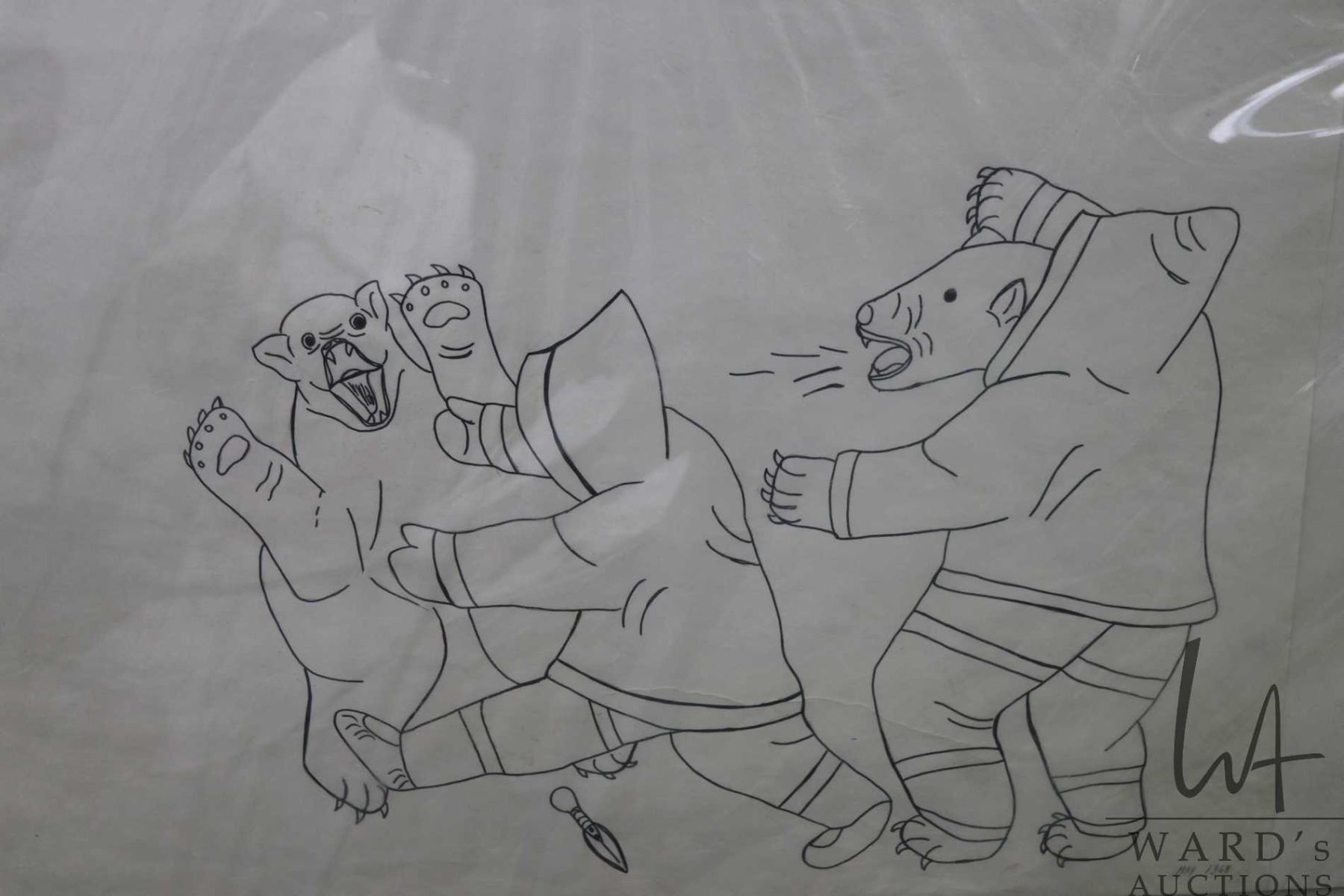 Unframed original coloured pen drawing, titled "Man Fighting with Bears" by artist Mono Ohoveluk, 1968, Holman Island, 18" X 24"