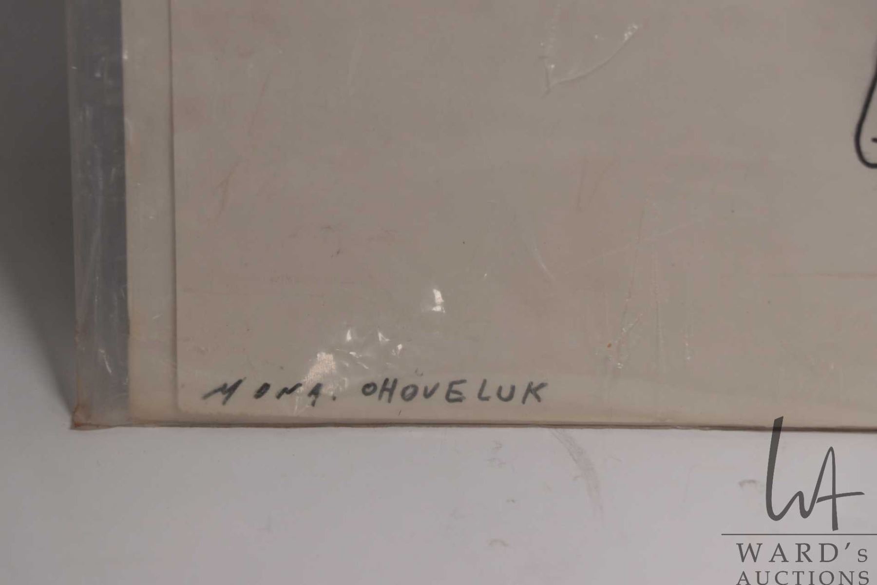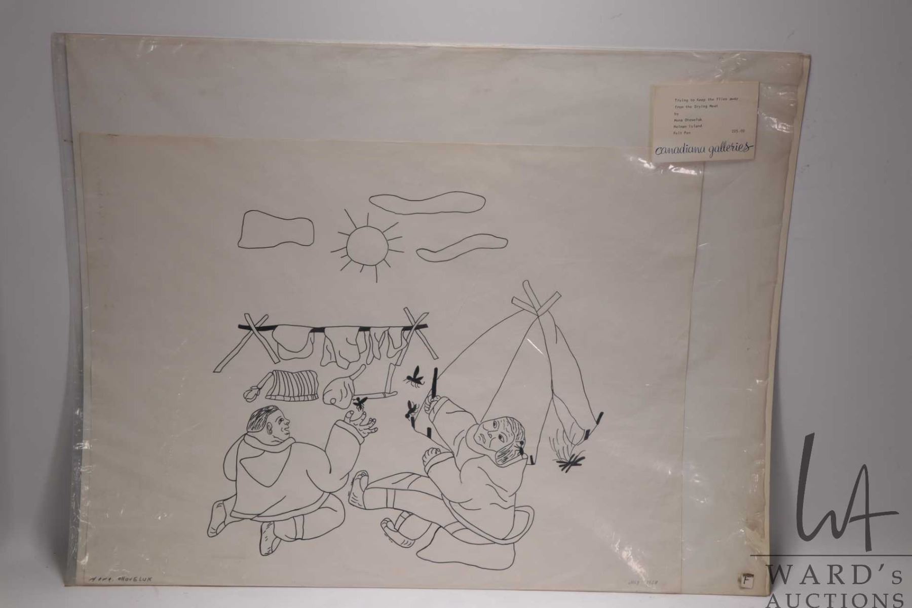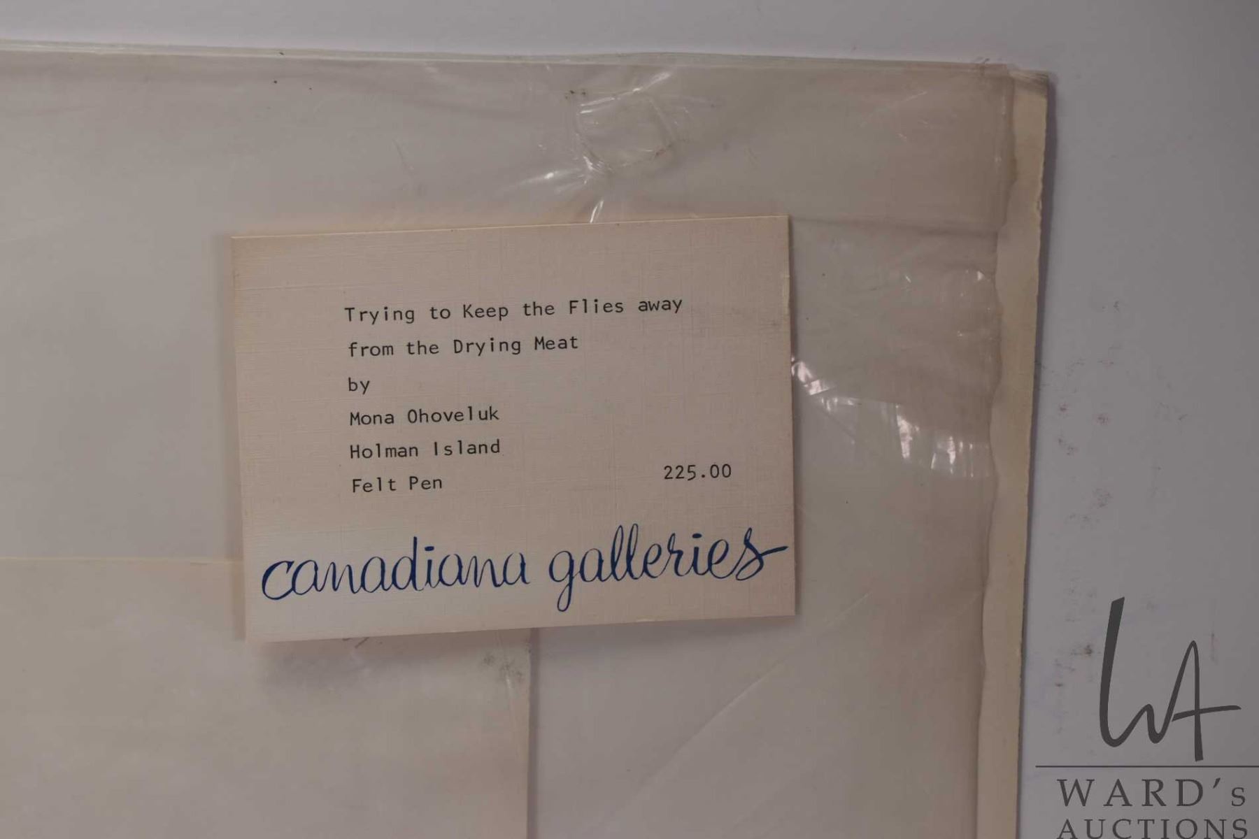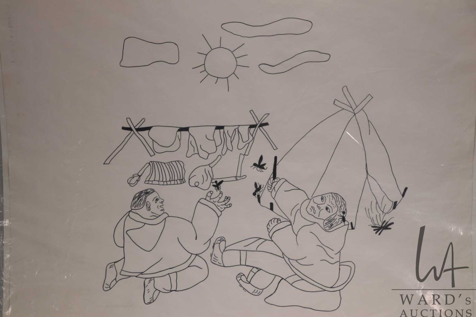 Unframed original pen and ink drawing titled "Trying to Keep the Flies Away From The Drying Meat" by artist Mona Ohoveluk, 1968, Holman Island, 18" X 24"