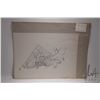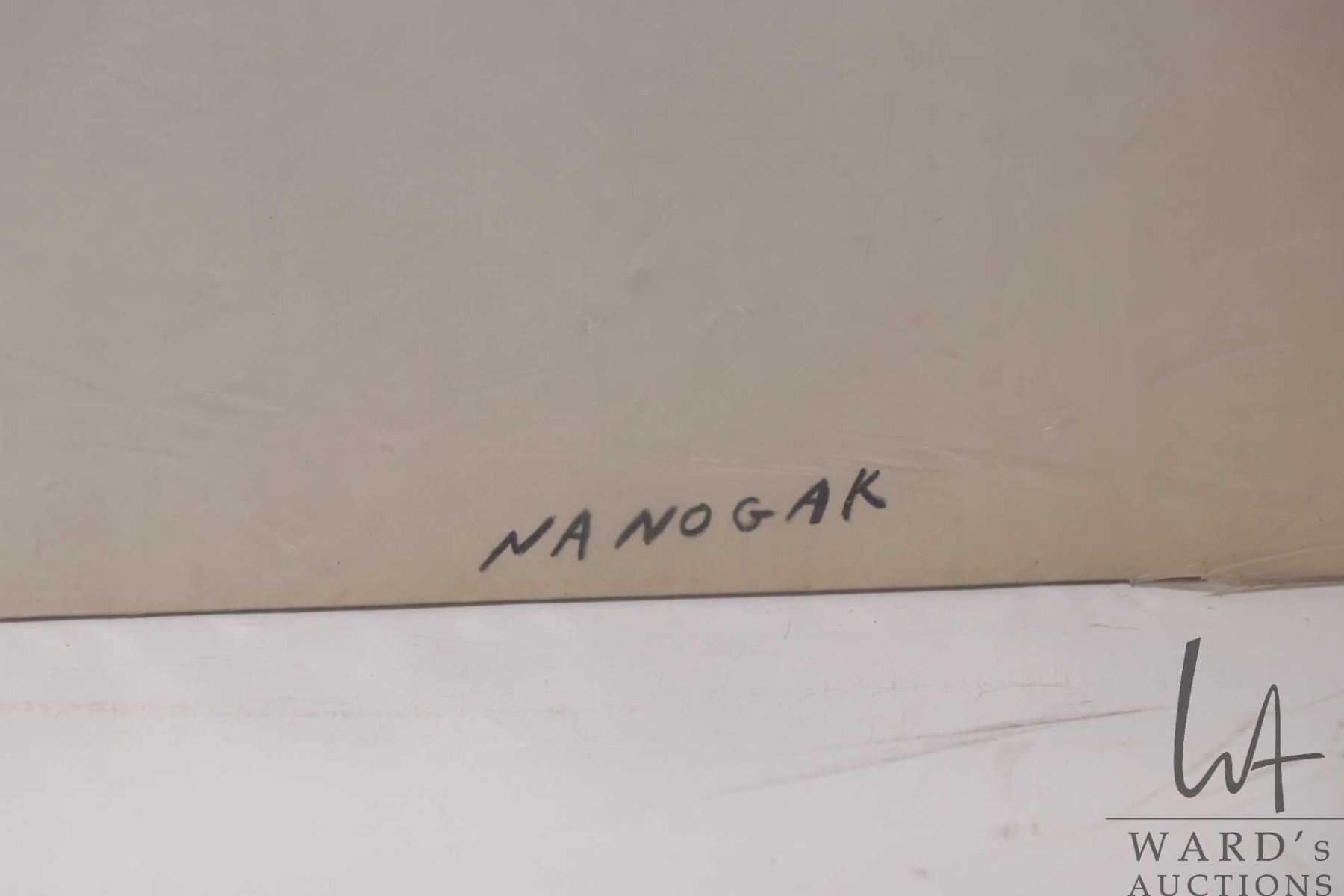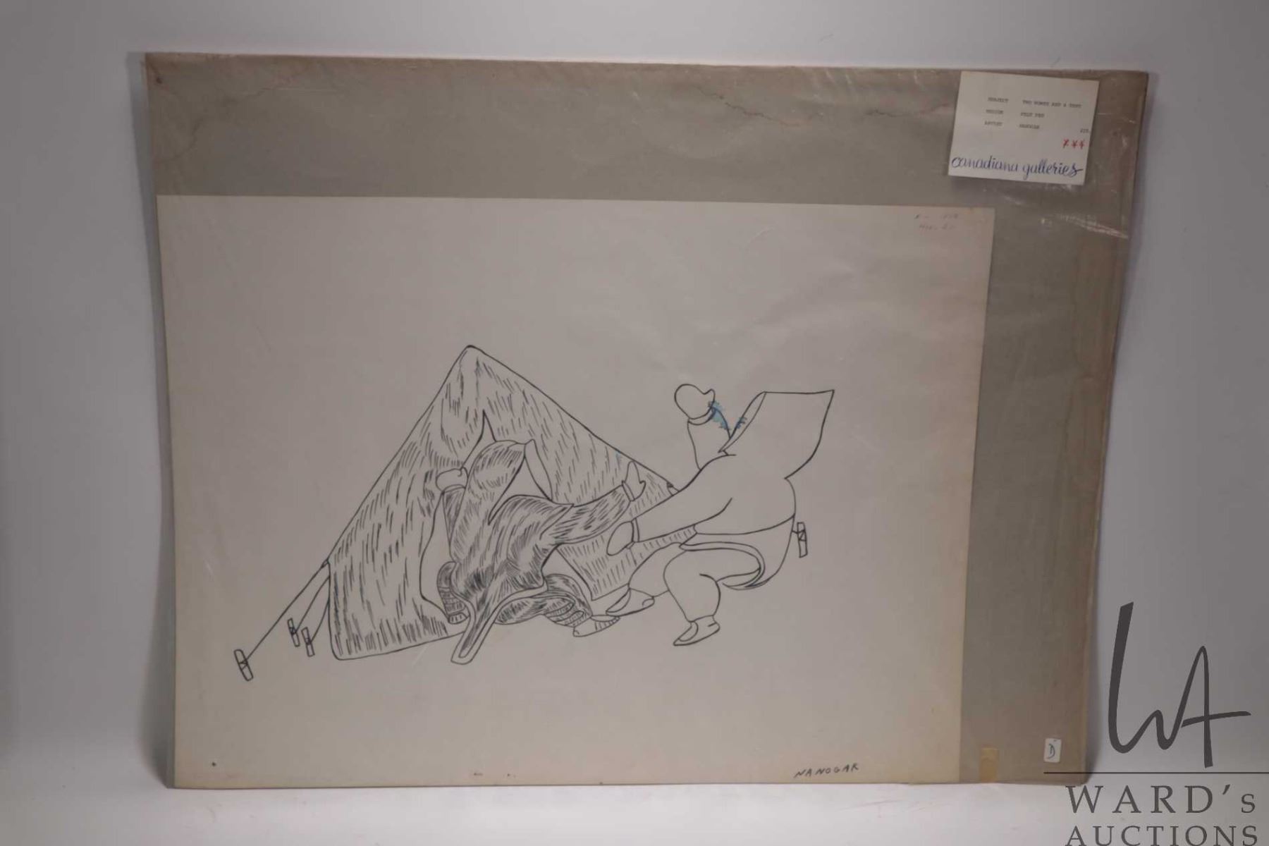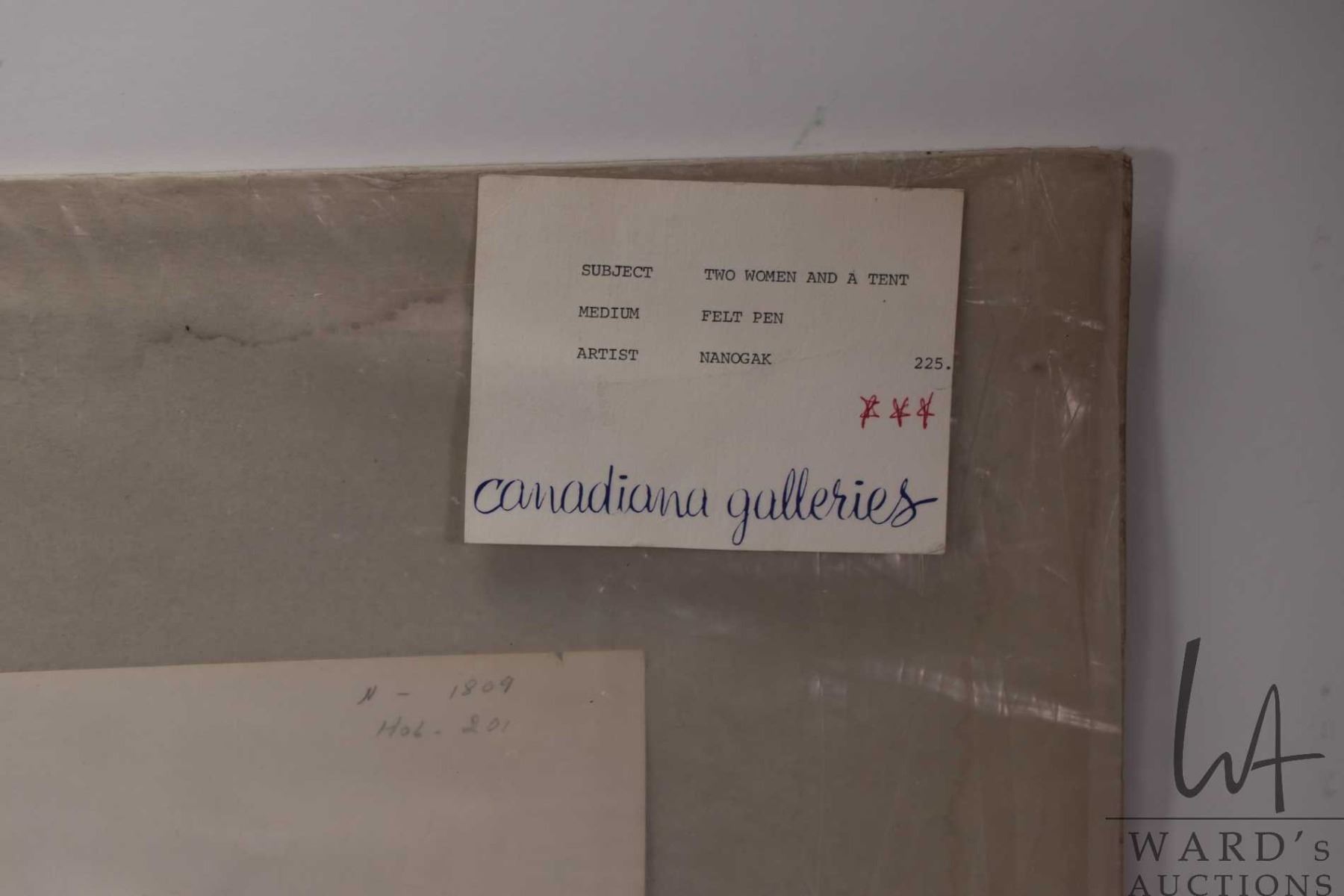 Unframed original pen and ink drawing titled "Two Woman And A Tent" by artist Nanogak, Holman Island, 18" X 24"