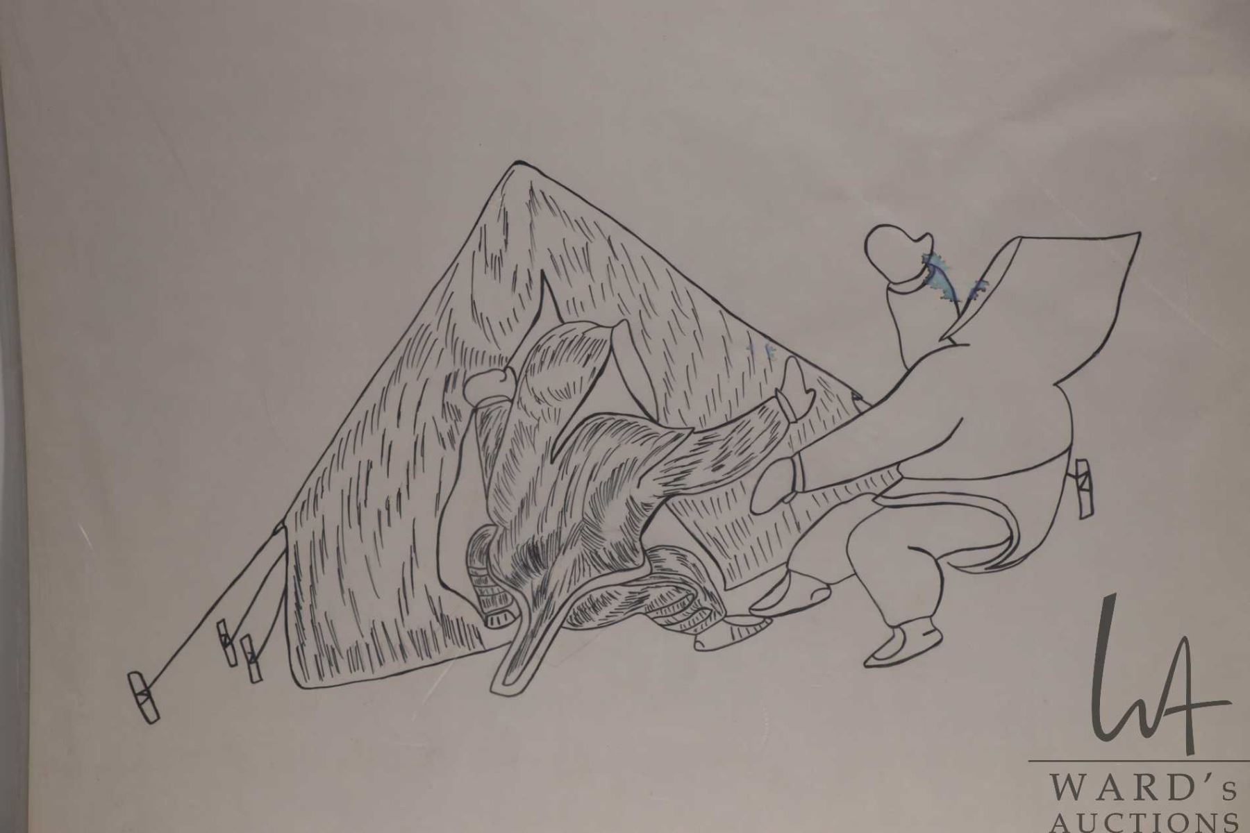 Unframed original pen and ink drawing titled "Two Woman And A Tent" by artist Nanogak, Holman Island