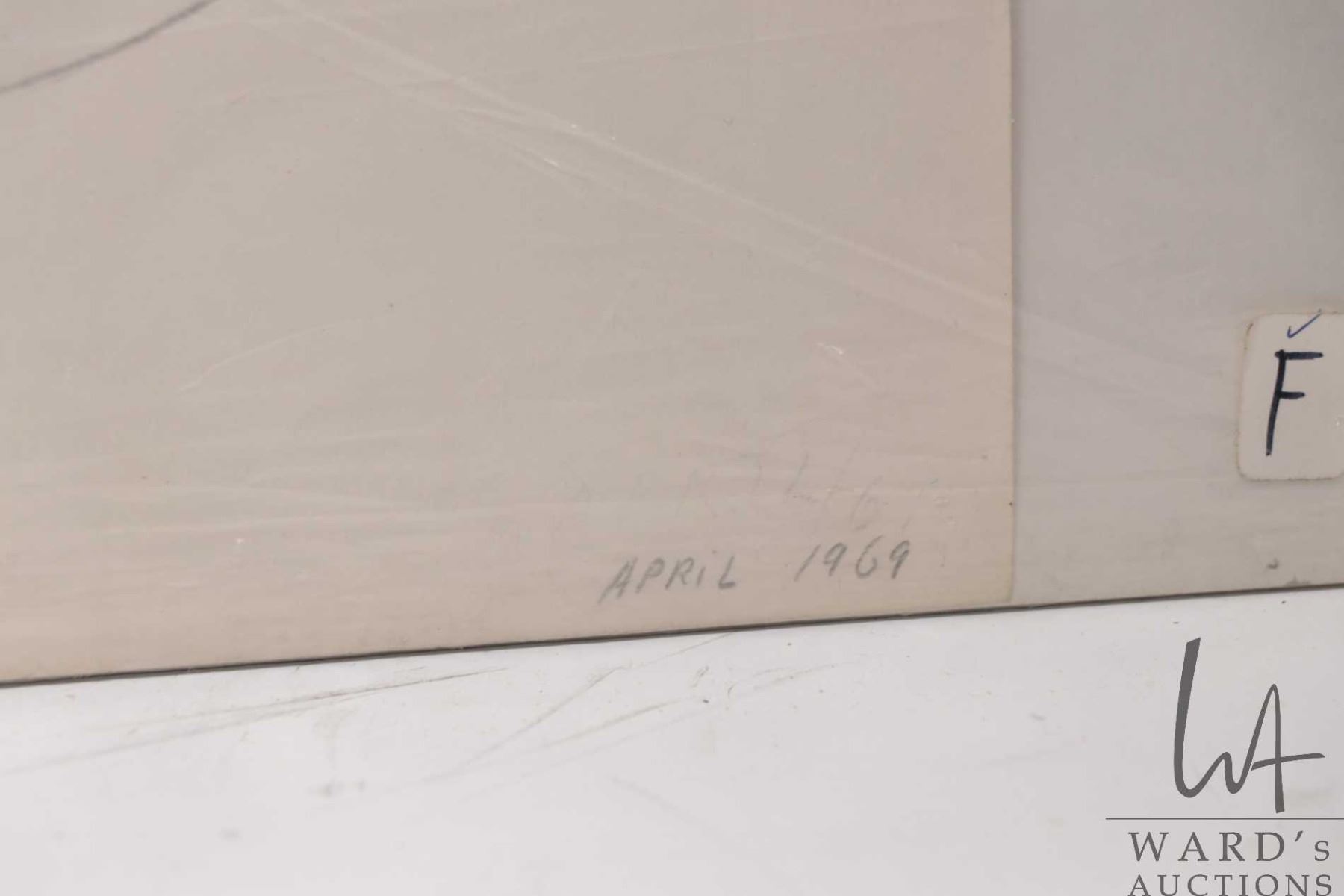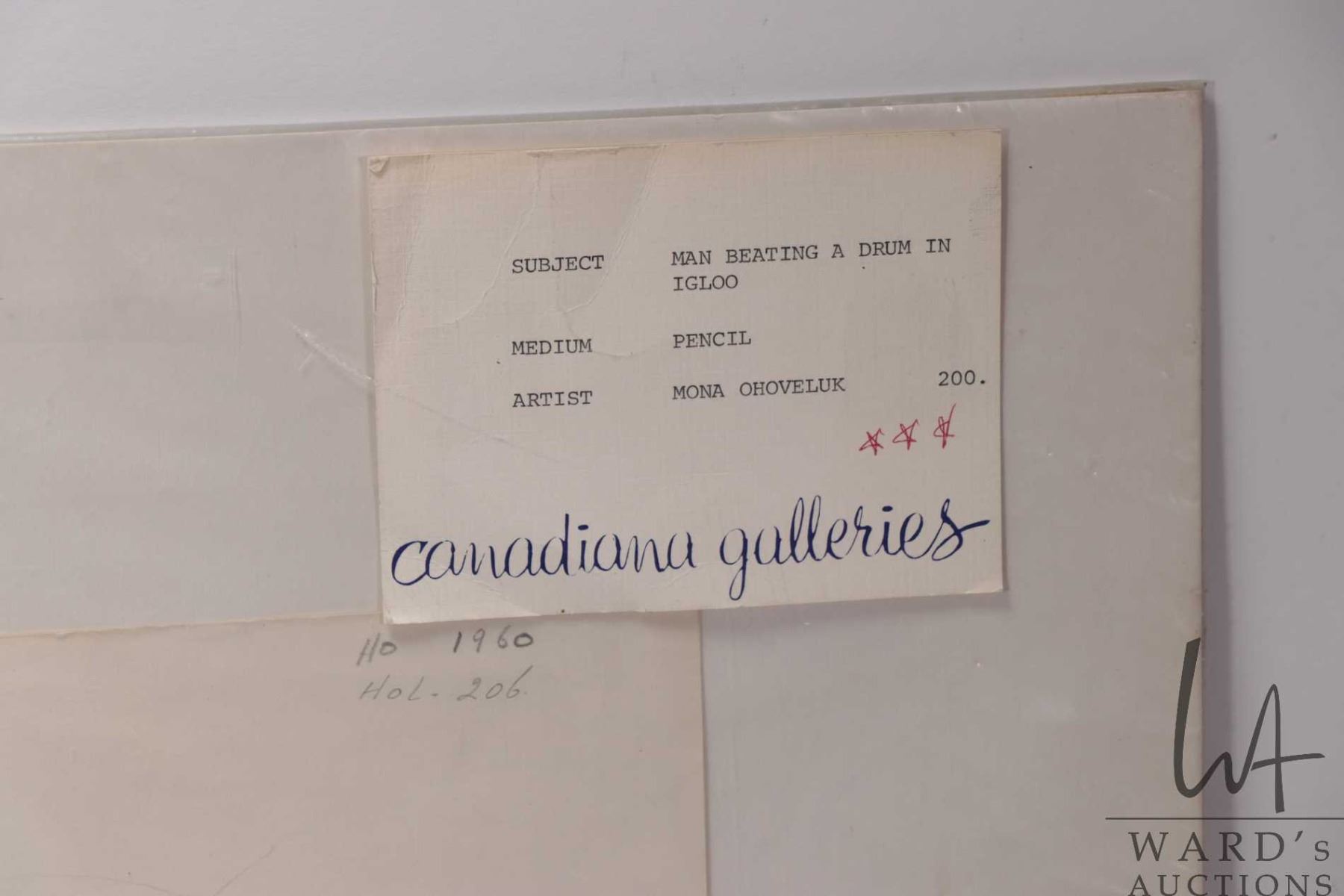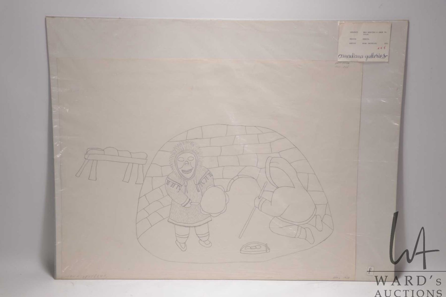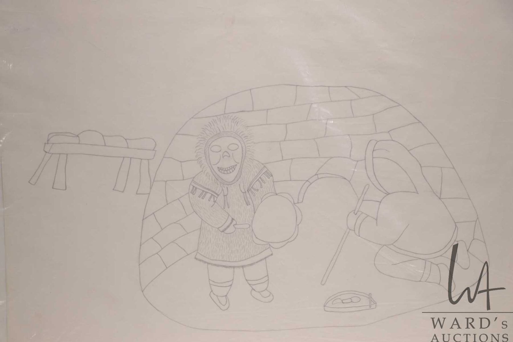 Unframed pencil drawing titled "Man Beating Drum in Igloo", signed by artist Mona Ohoveluk, April 1969, 18" X 24"