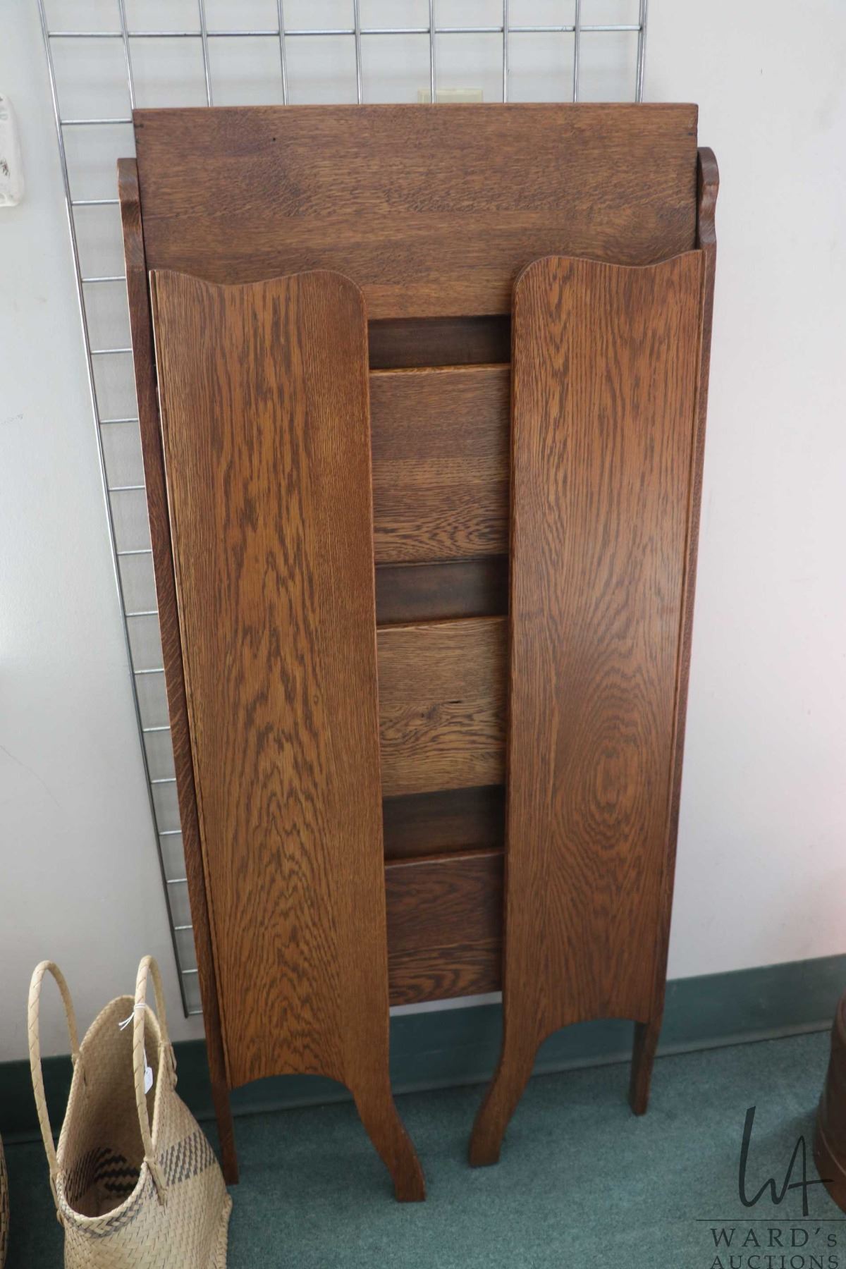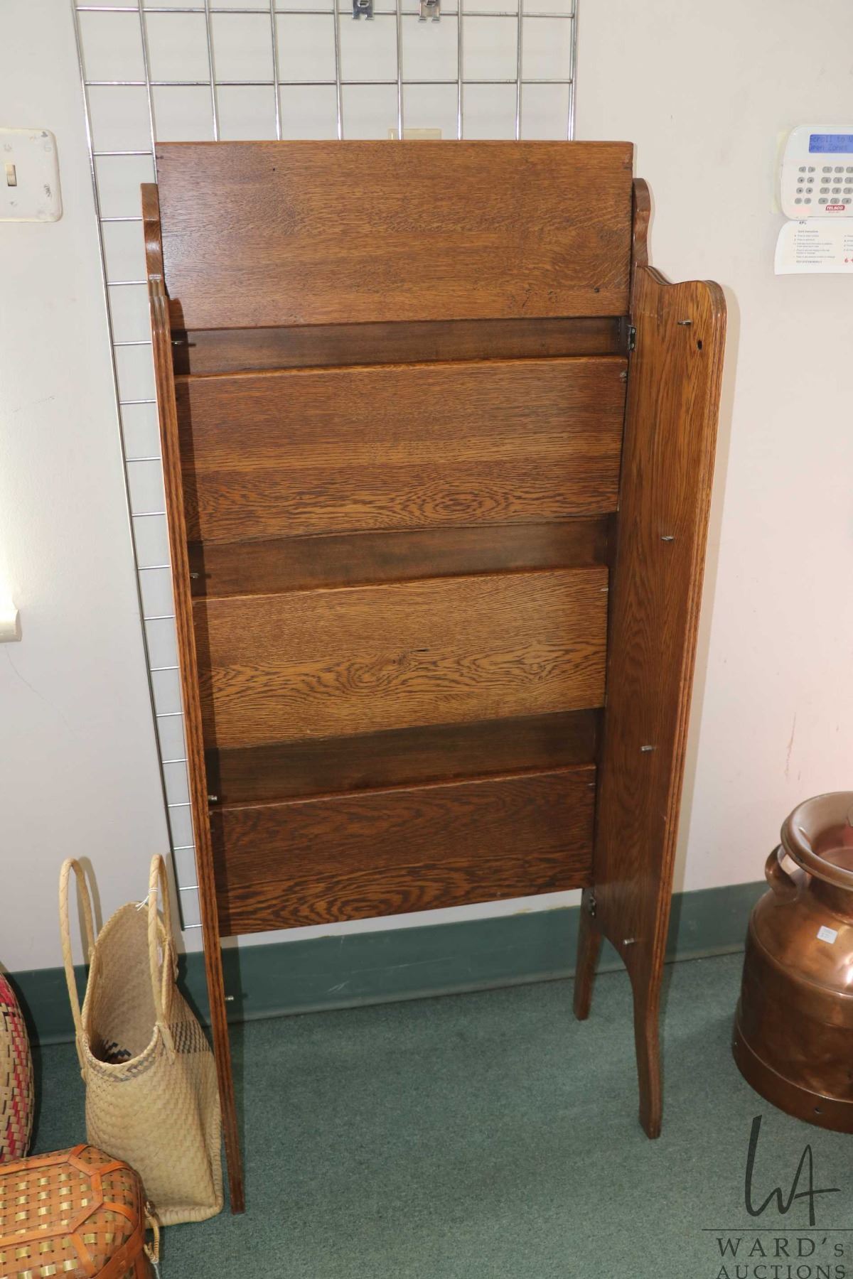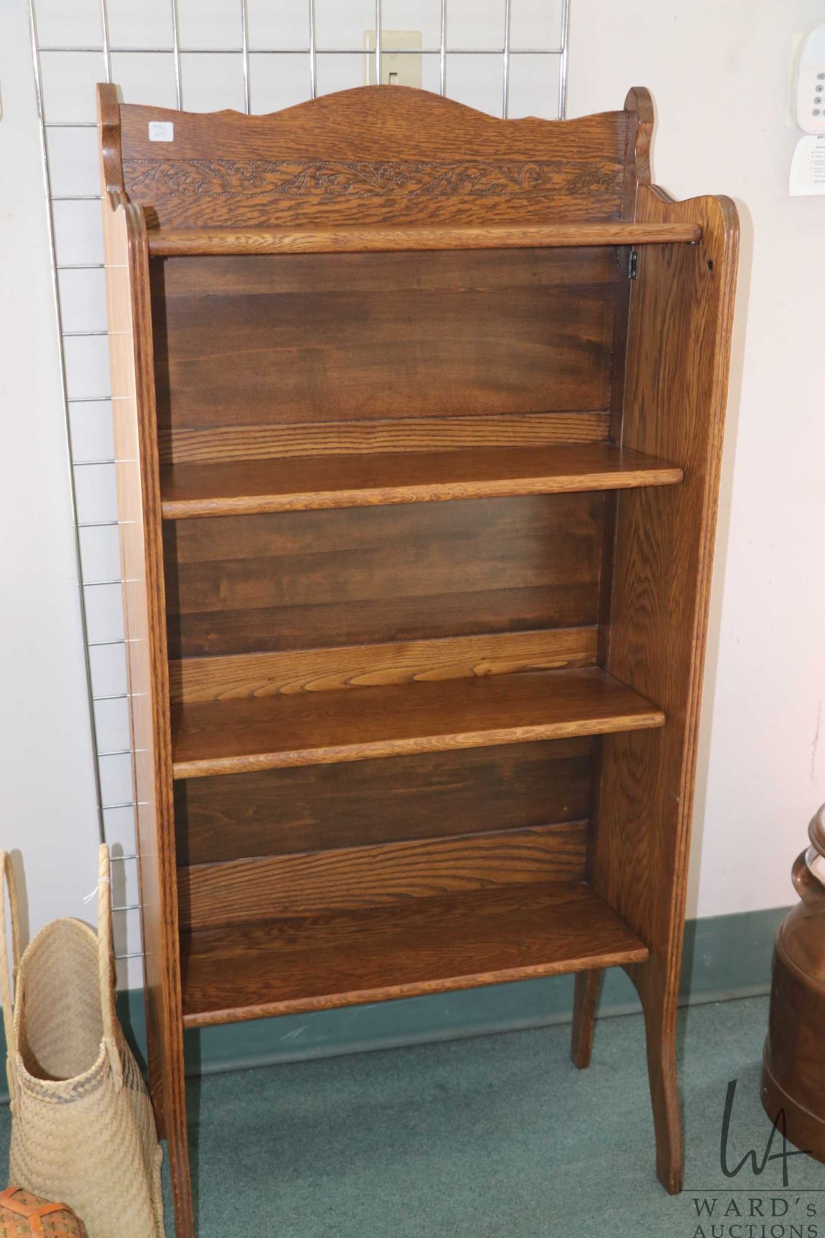 Unique oak folding four tier bookshelf with carved back, 51 1/2" in height, 24" W X 10 1/2" D