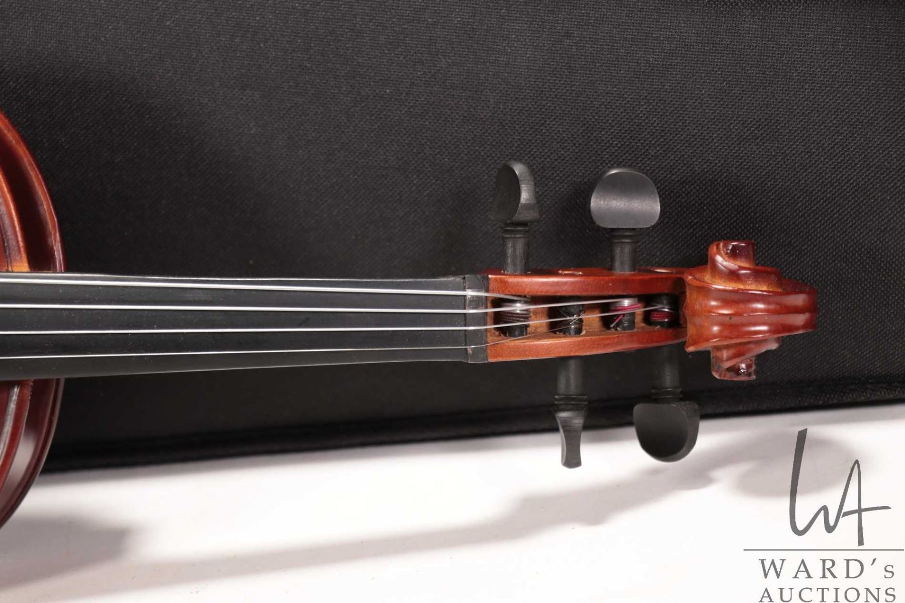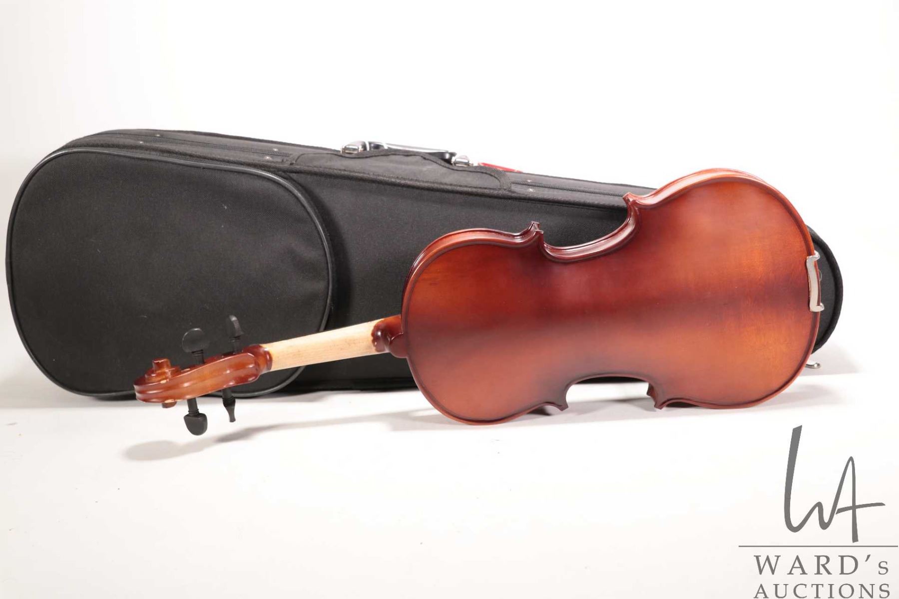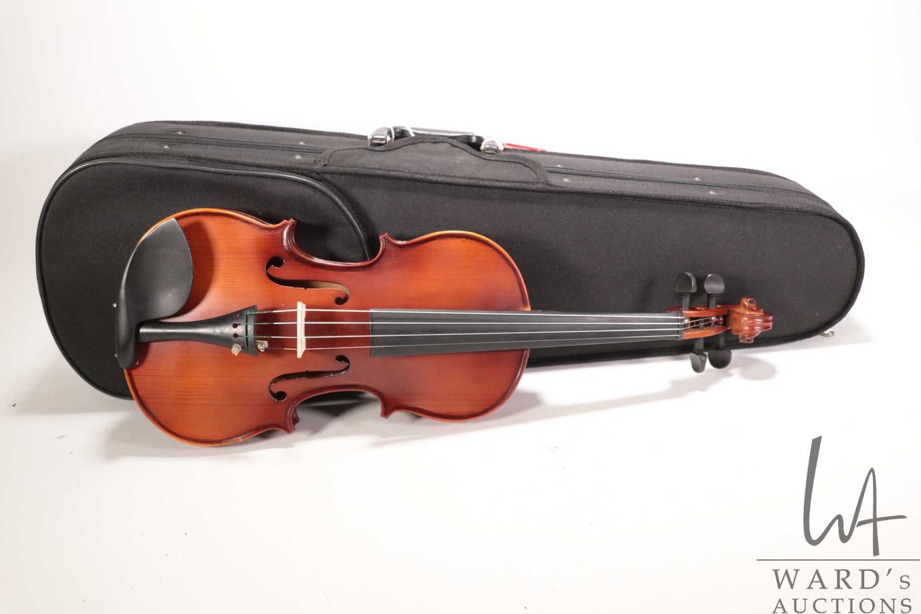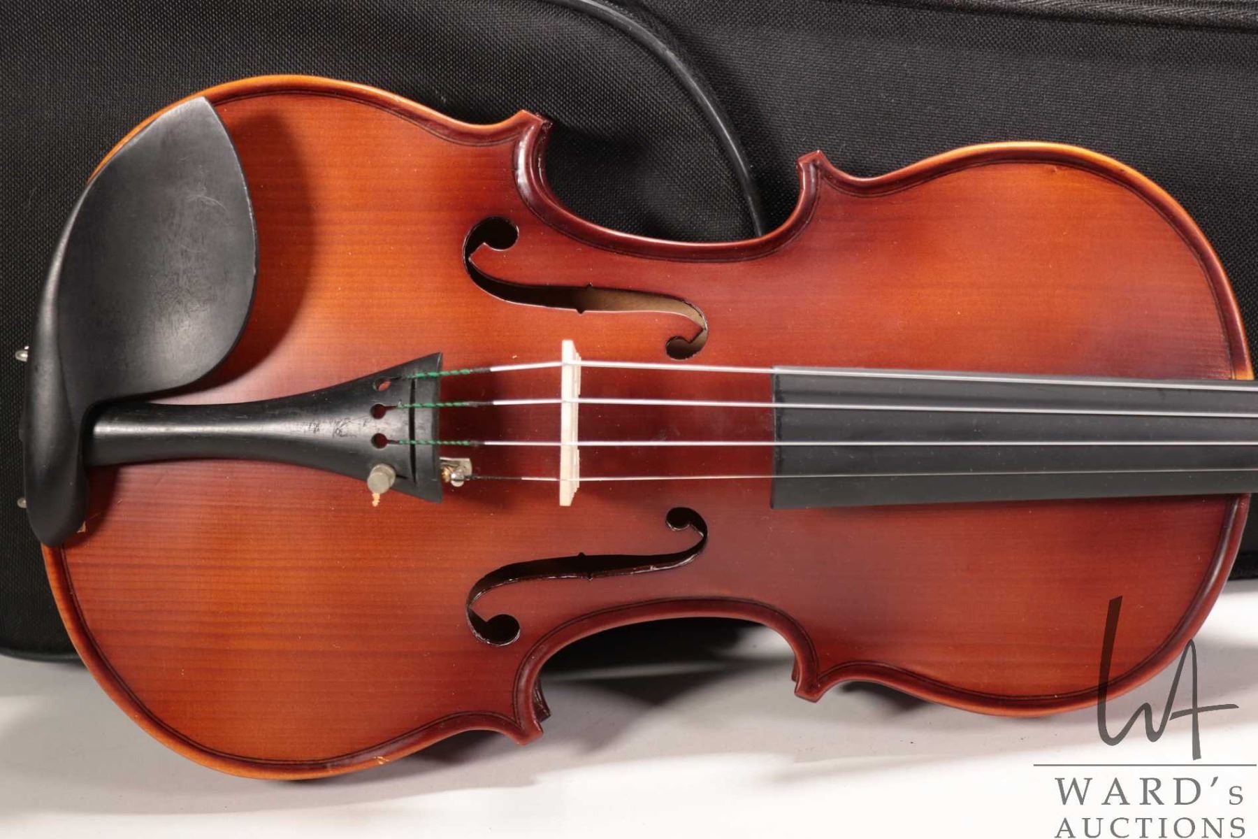 Unmarked 3/4 size violin. Recent work includes bridge installed and tuning. Includes black case, not