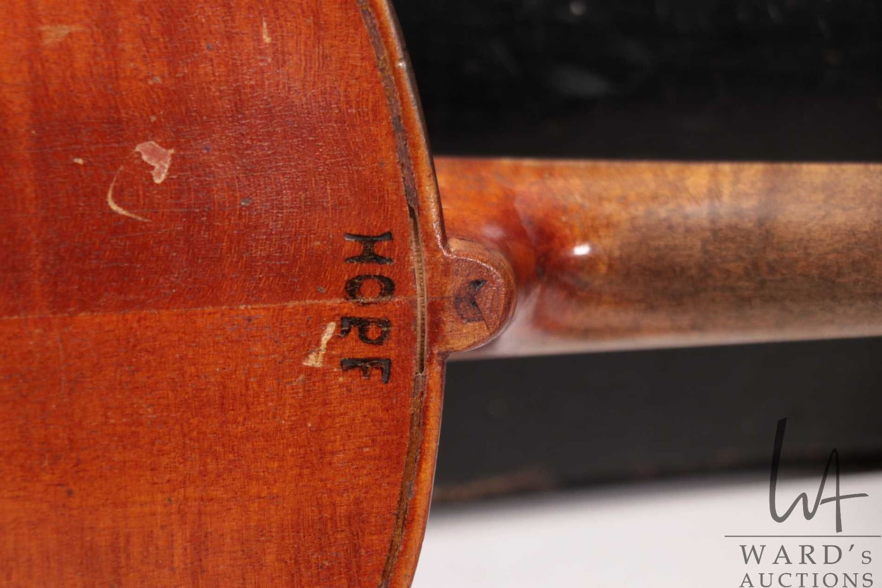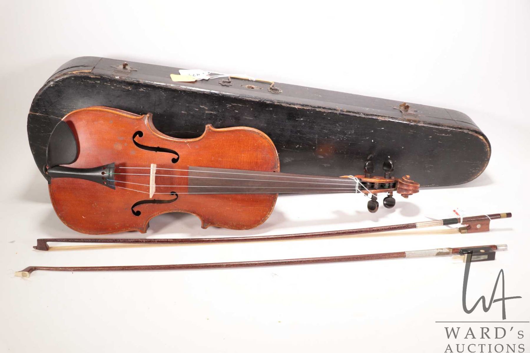 Unmarked 4/4 violin. Includes two bows, extra bridge and a black wooden case with blue felt lining. Note: distressed finish and one bow needs restringing