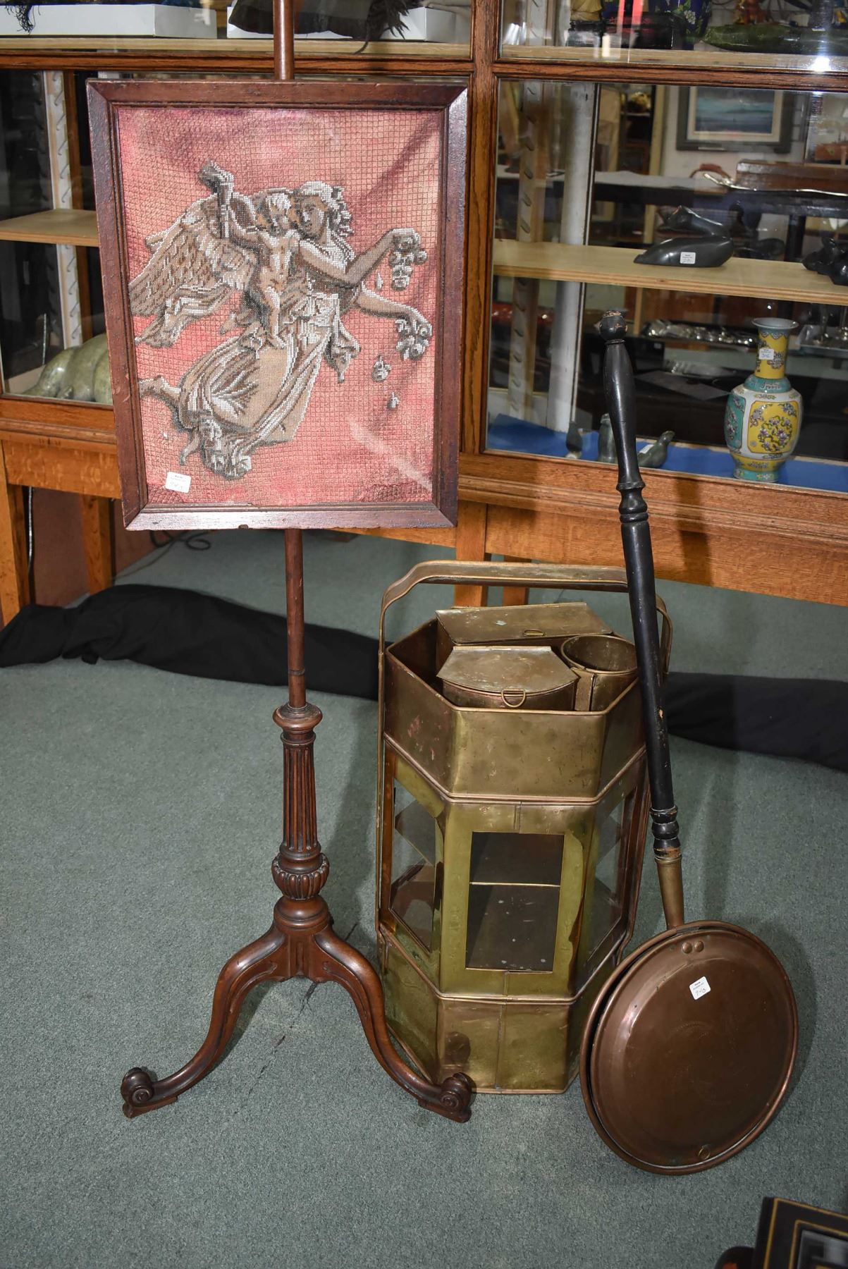 Victorian draft screen with scroll supports fitted with beaded angel panel, Asian brass noodle cooker and a copper bed warmer