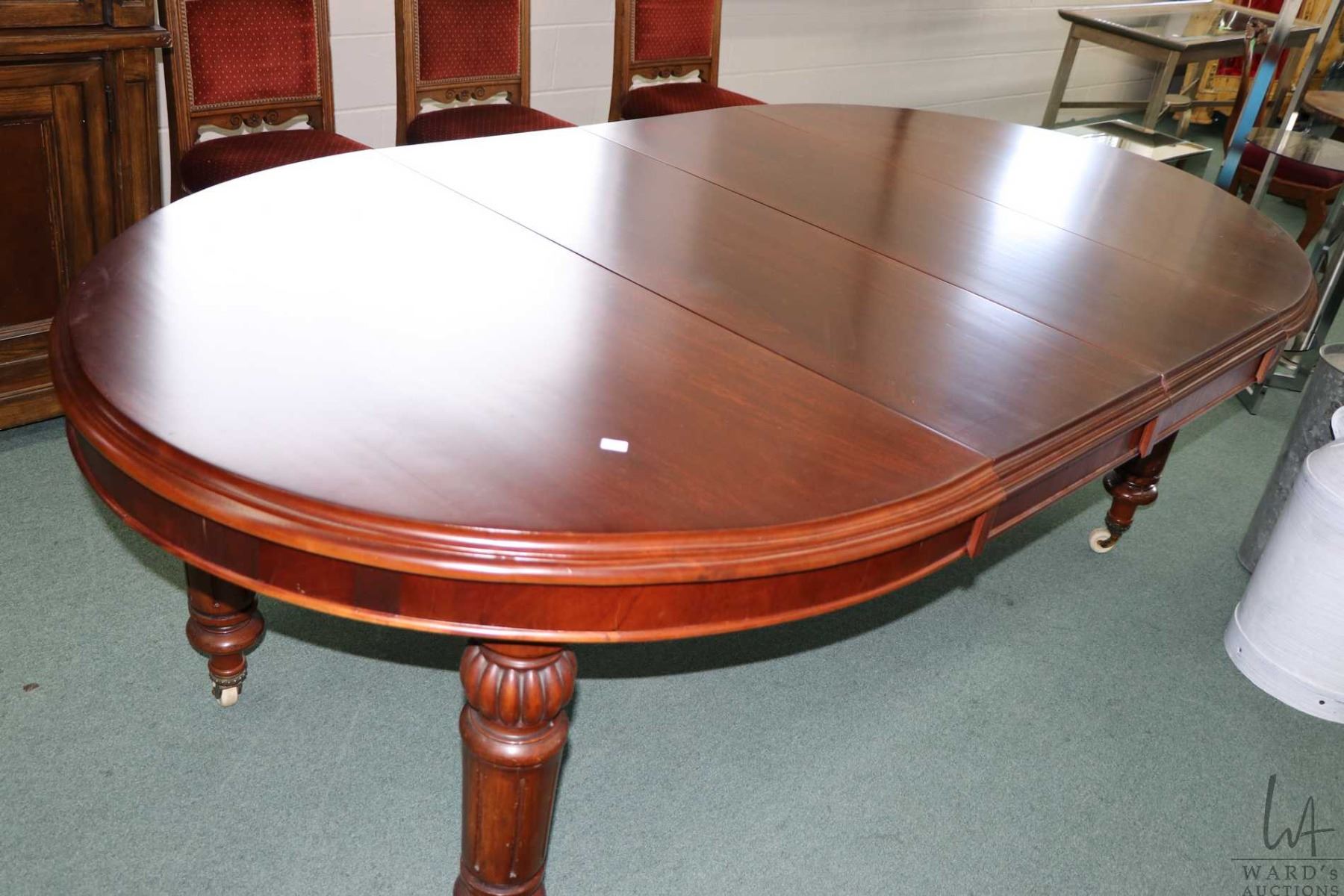 Victorian mahogany dining table on heavy bulbous and reeded supports with large porcelain castors, 56" X 46" when closed and includes two 17 1/2" insert leaves, table has been refinished and has been fitted with new table extenders, beautifully done and is room ready!