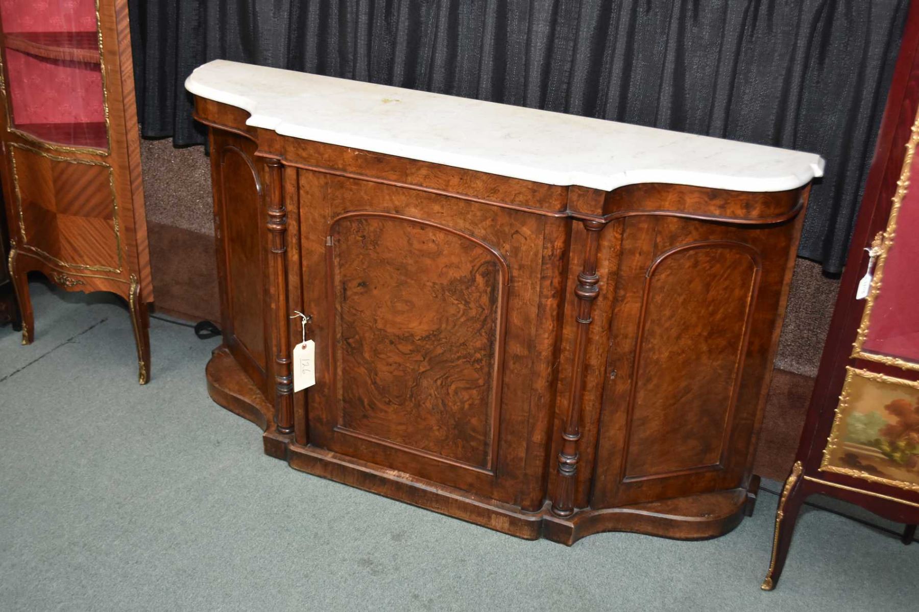 Victorian matched grain burl walnut, marble topped sideboard with three doors, turned and reeded simulated support columns, 60" wide