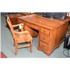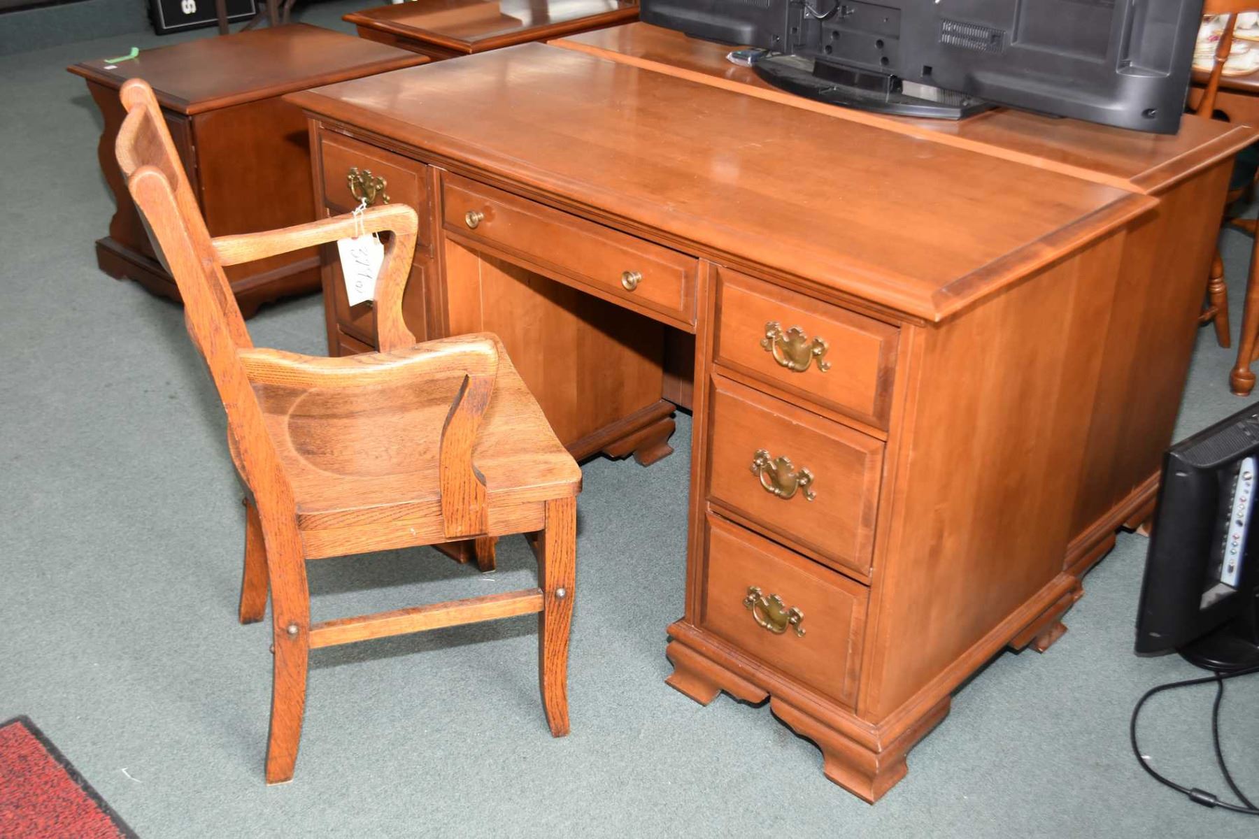 Vilas maple double pedestal desk and a vintage oak open arm parlour chair