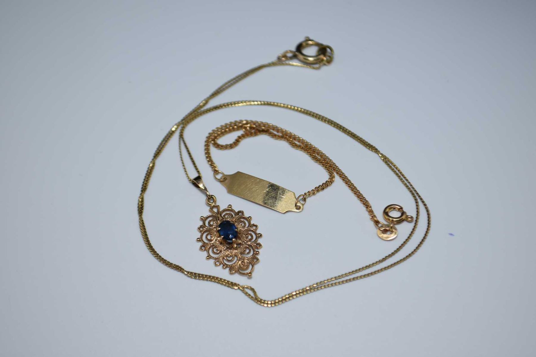 Vintage 10kt gold filigree pendant with gemstone on a gold chain with replaced clasp and a delicate 10kt gold engraveable bracelet