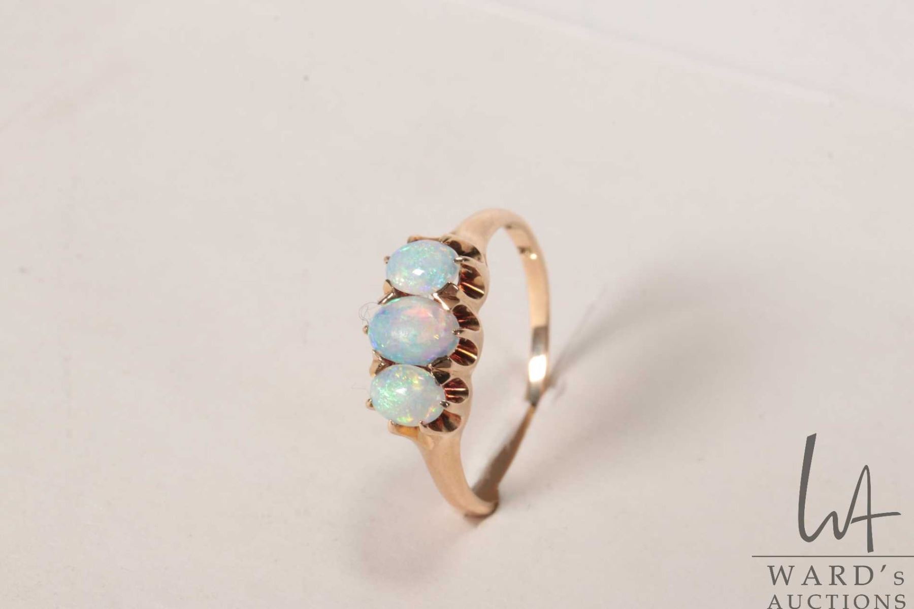 Vintage 14kt yellow gold ring set with three opals, size 6.5