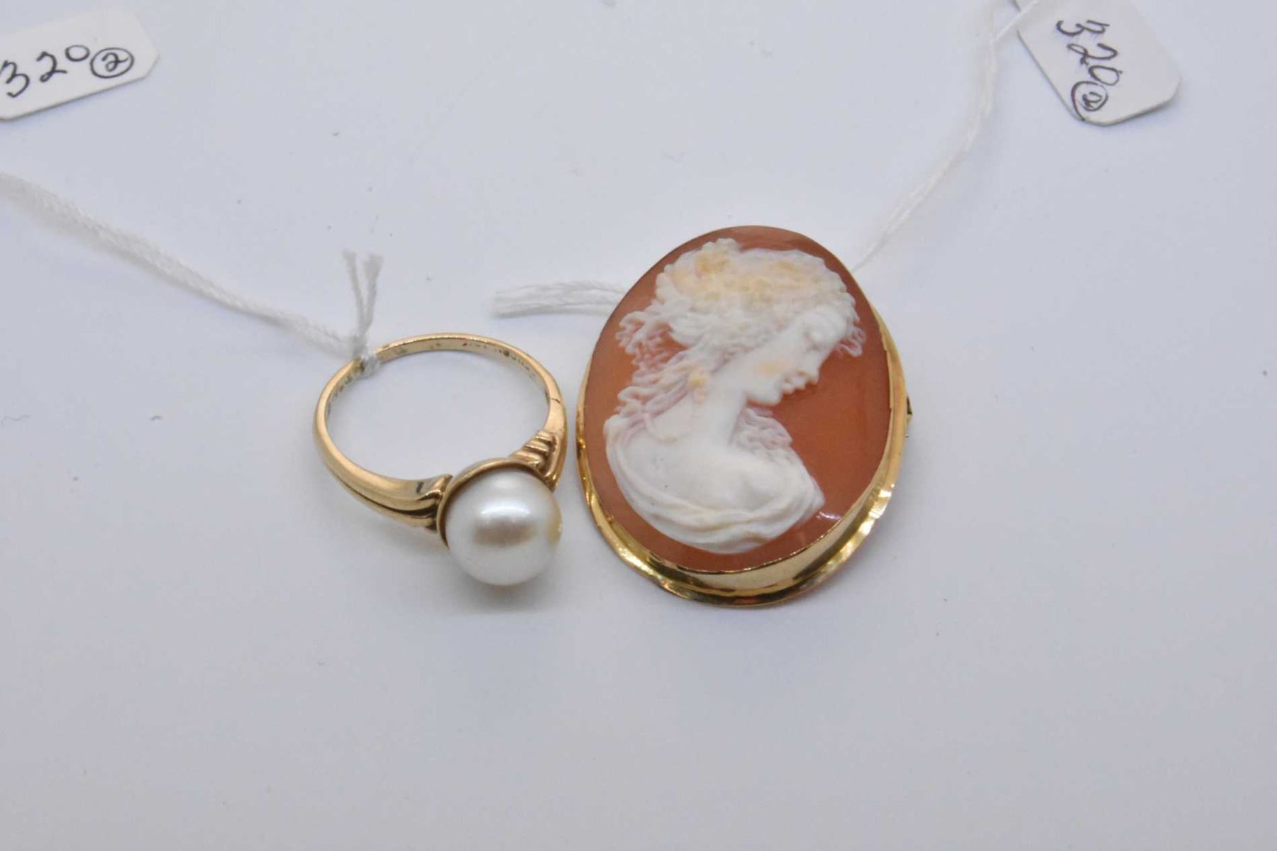 Vintage 18kt and carved cameo brooch / pendant and a 10kt yellow gold and genuine pearl ring