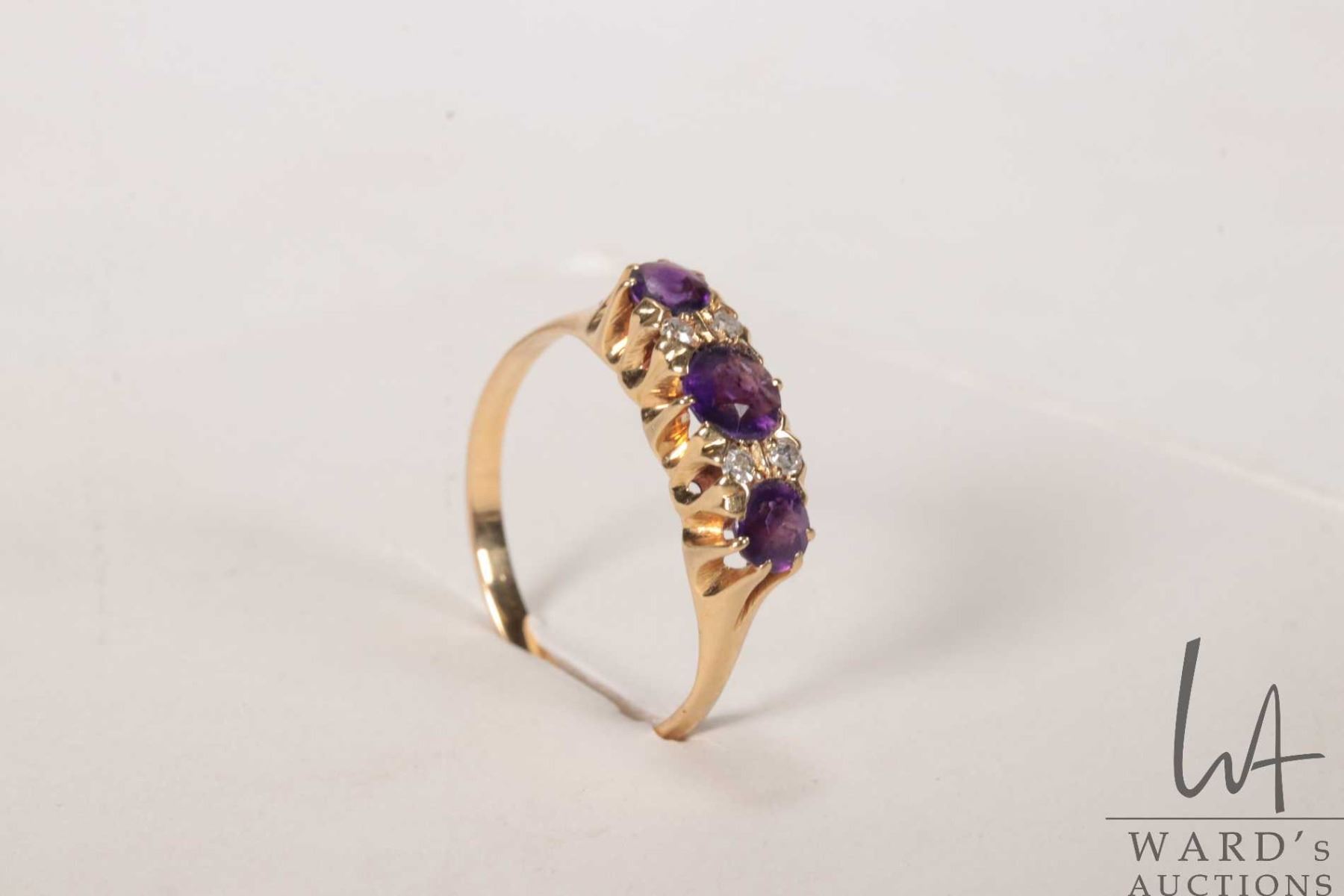 Vintage 18kt yellow gold ring set with three amethyst gemstones and four accent diamonds, size 6.25