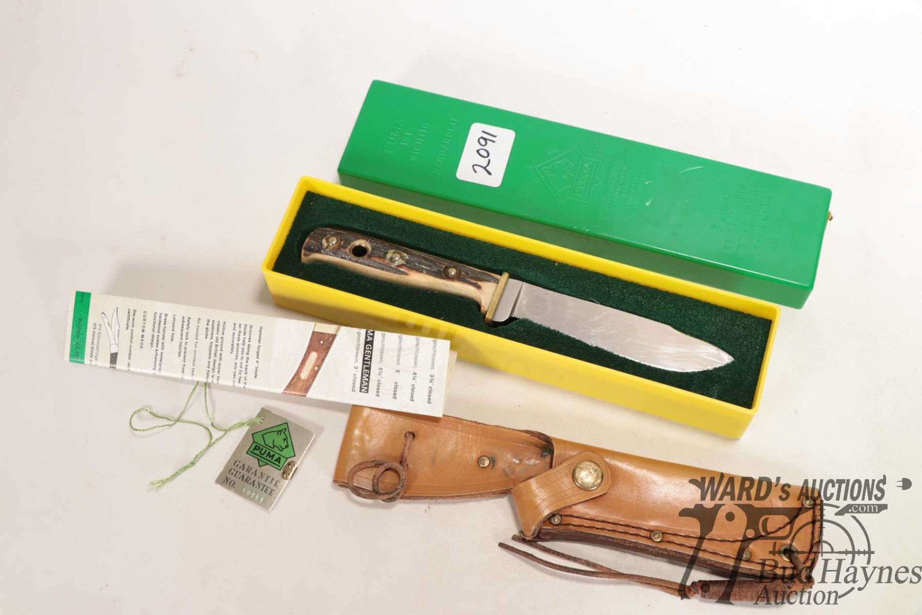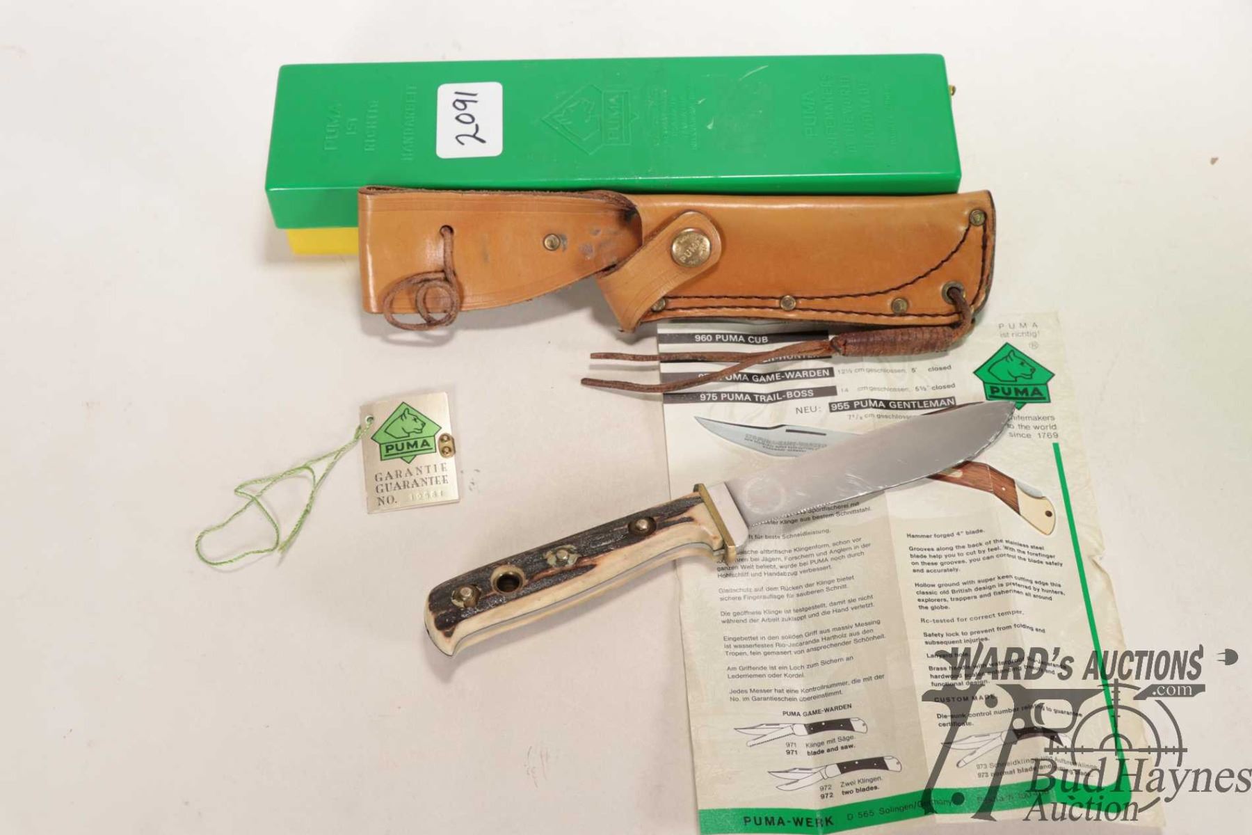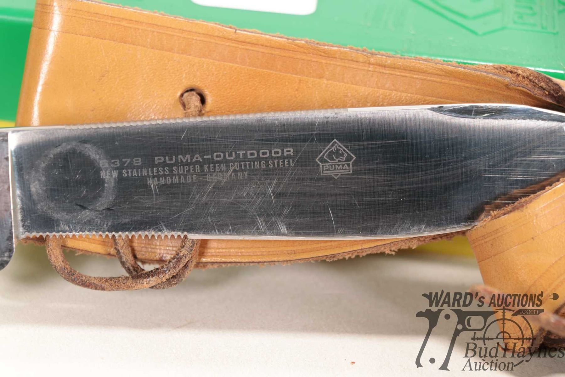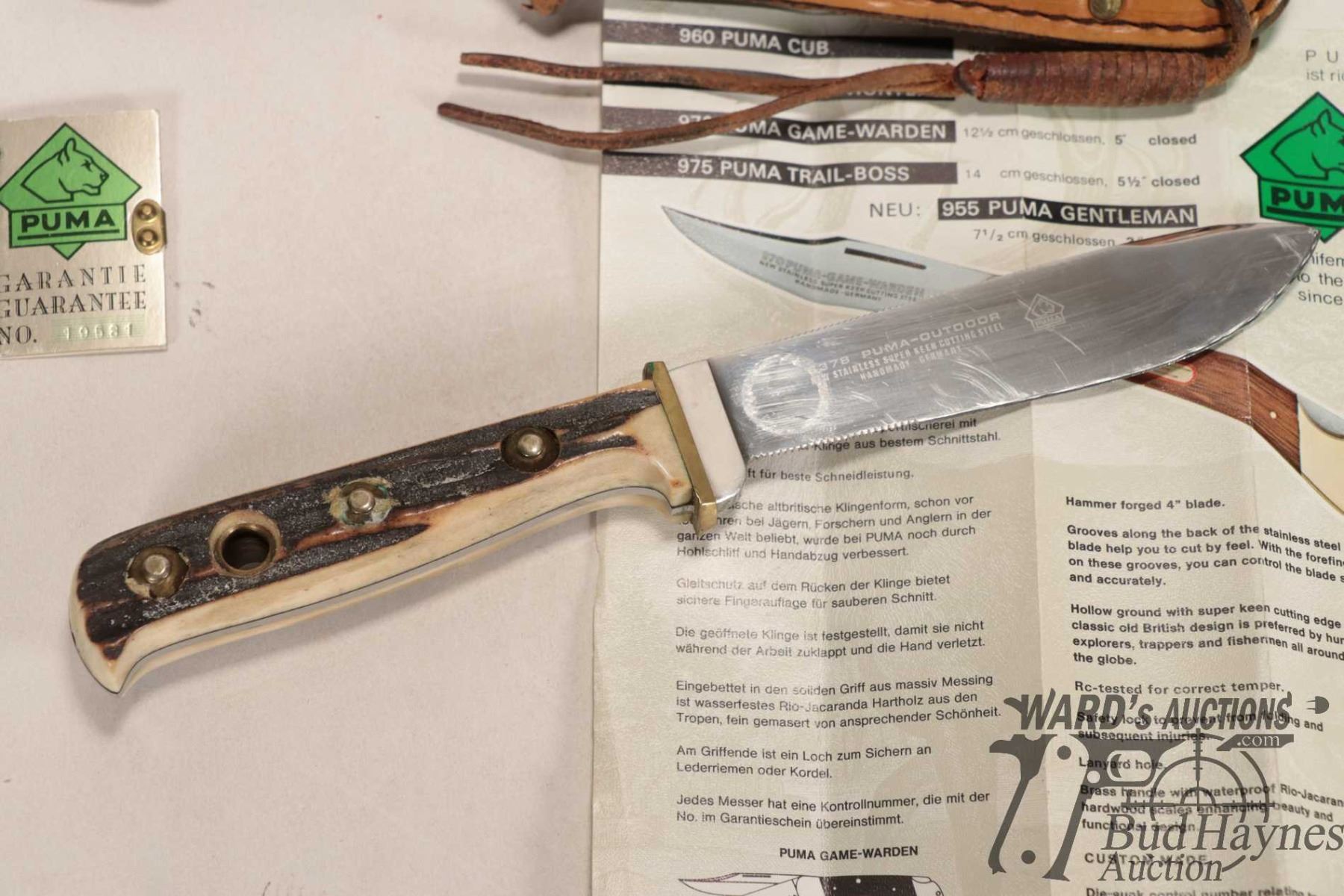 Vintage 1985 Puma II 6378 outdoor knife with original box, tag and pamphlet. Has 5" blade and antler handled plus original sheath