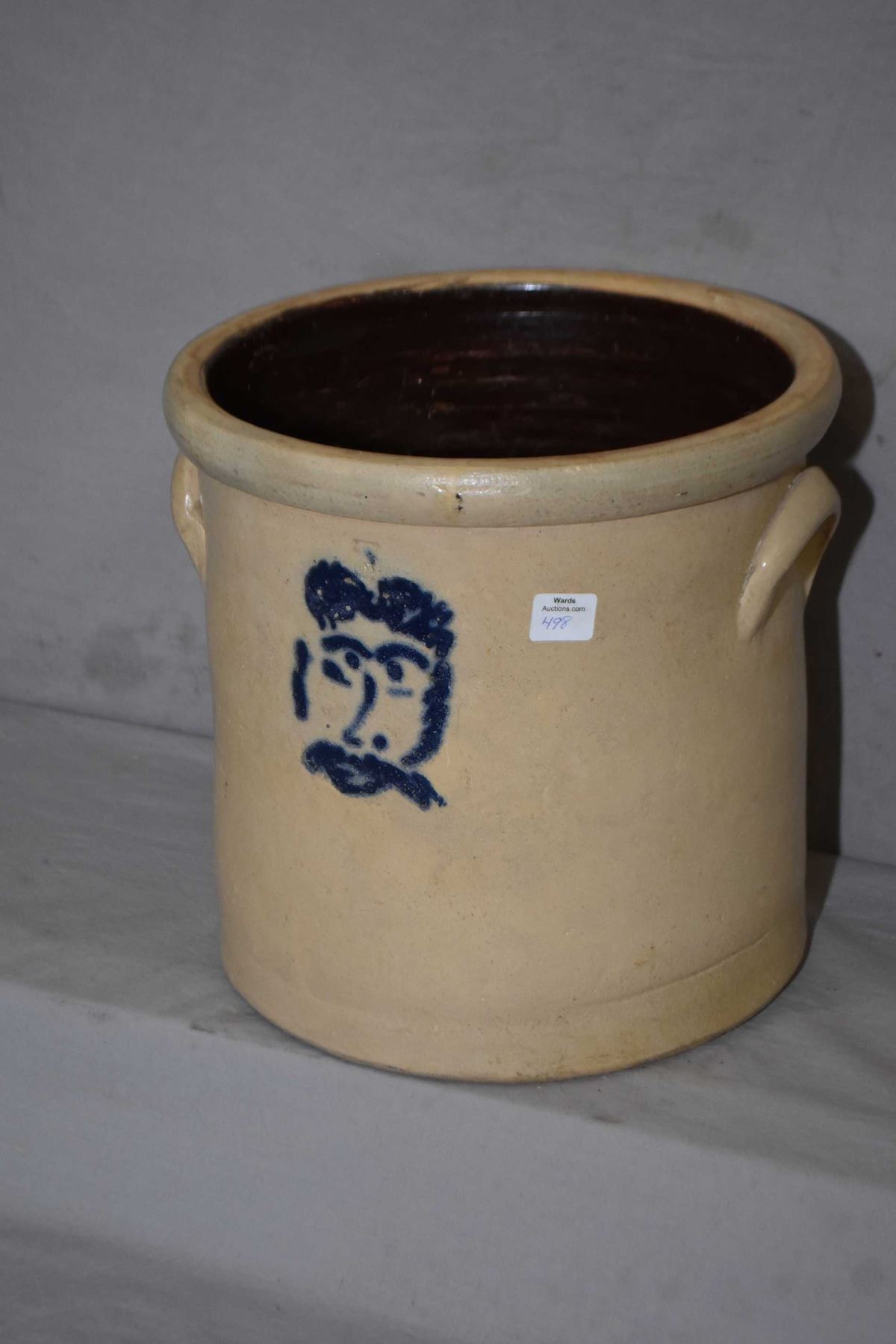 Vintage 3 gallon stoneware crock with cobalt blue handpainted face and brown glazed interior