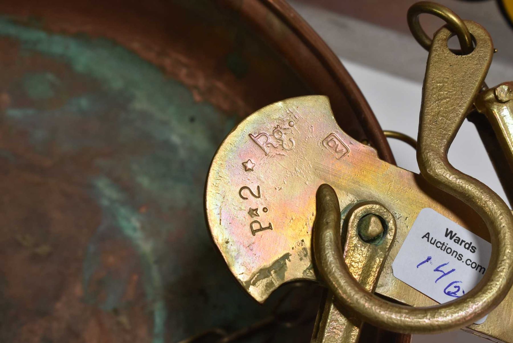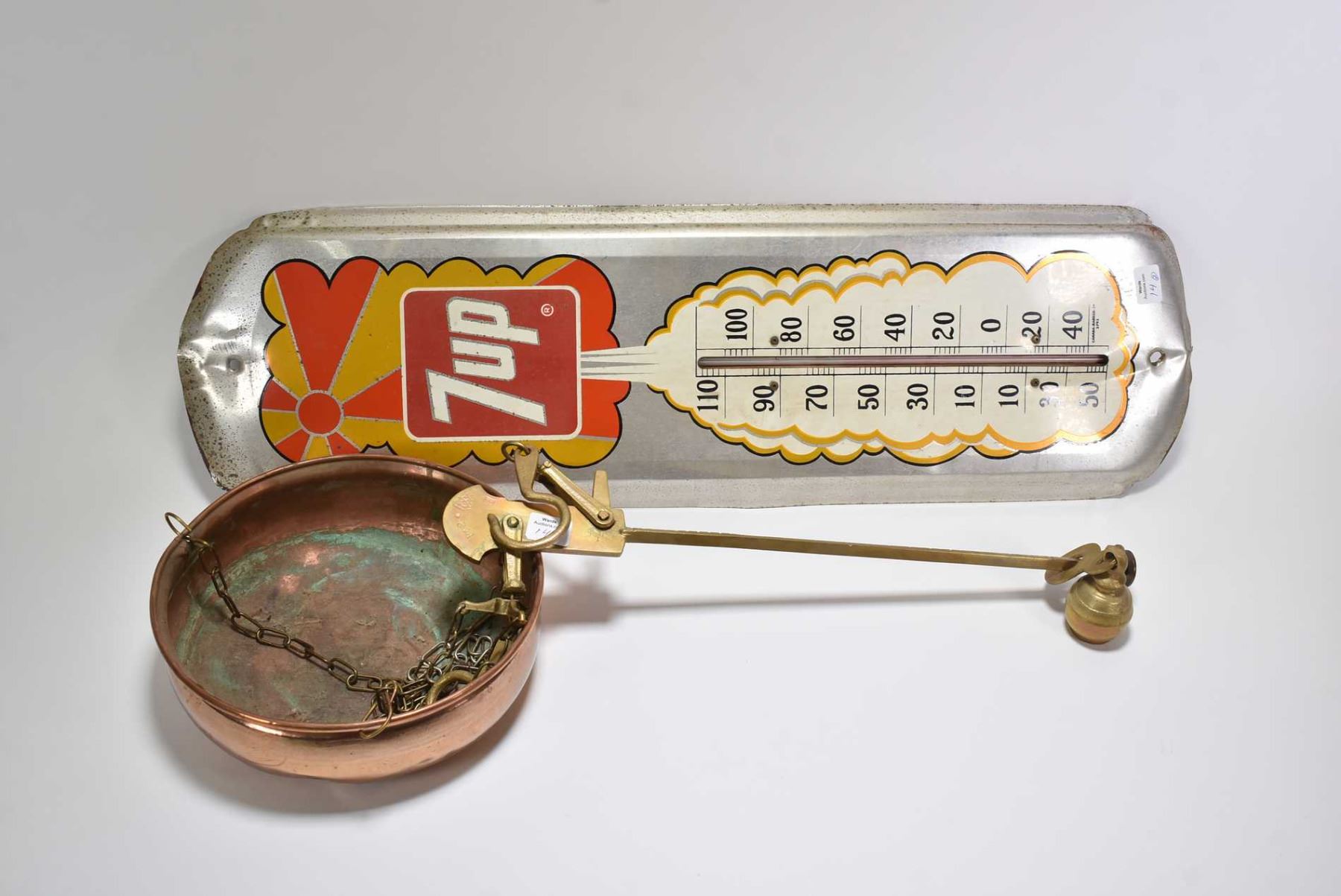 Vintage 7-UP metal wall thermometer made by Canada-Barker-74 no. 3793 and a single beam balance scale with copper pot