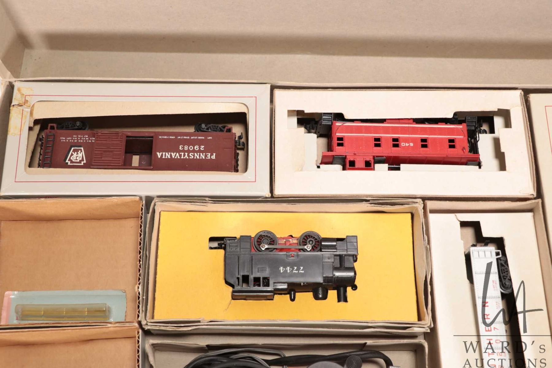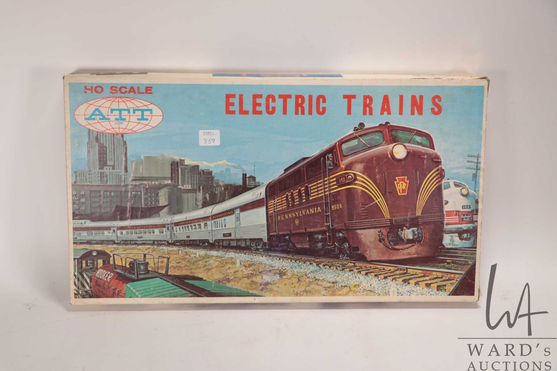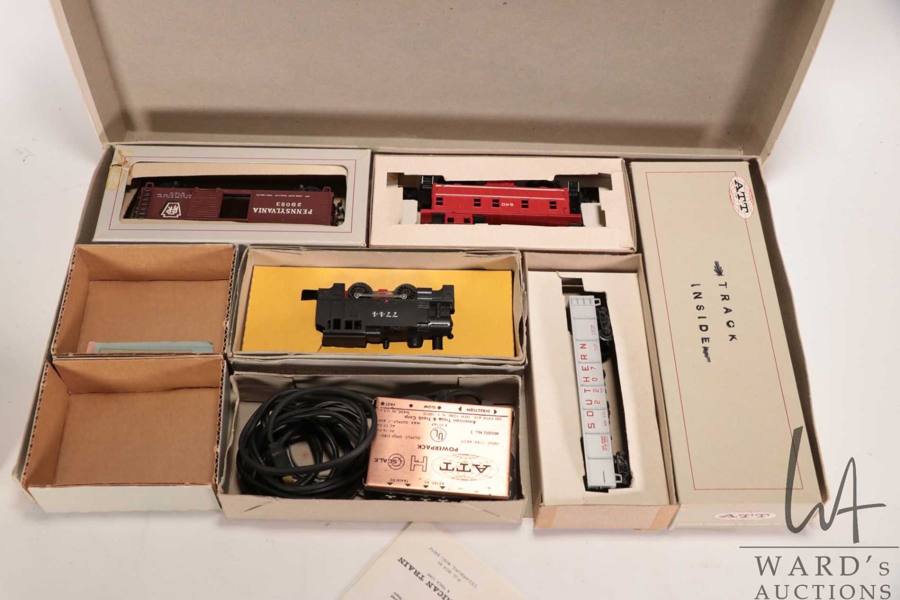 Vintage ATT H.O. scale model train set including power supply, engine, two pieces of rolling stock, caboose and selection of track, appears unused