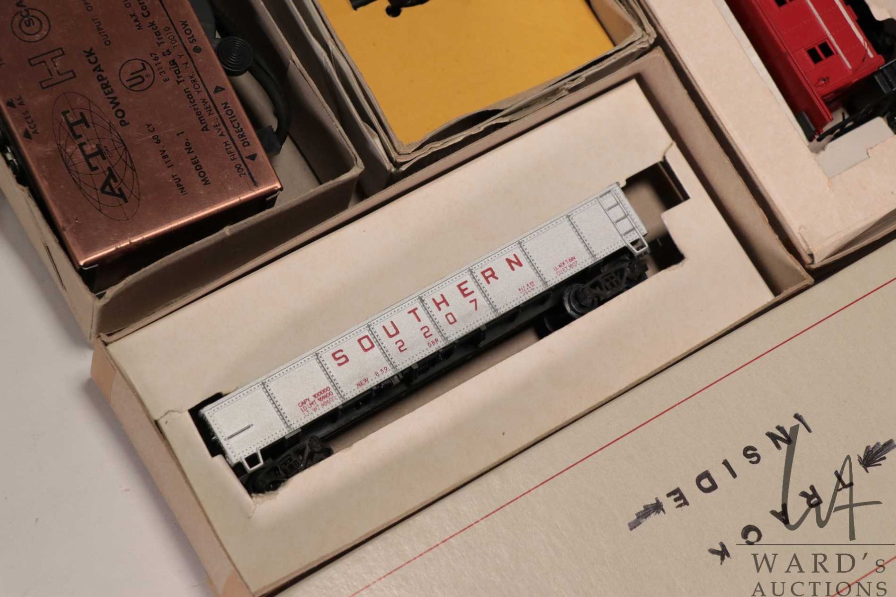 Vintage ATT H.O. scale model train set including power supply, engine, two pieces of rolling stock,