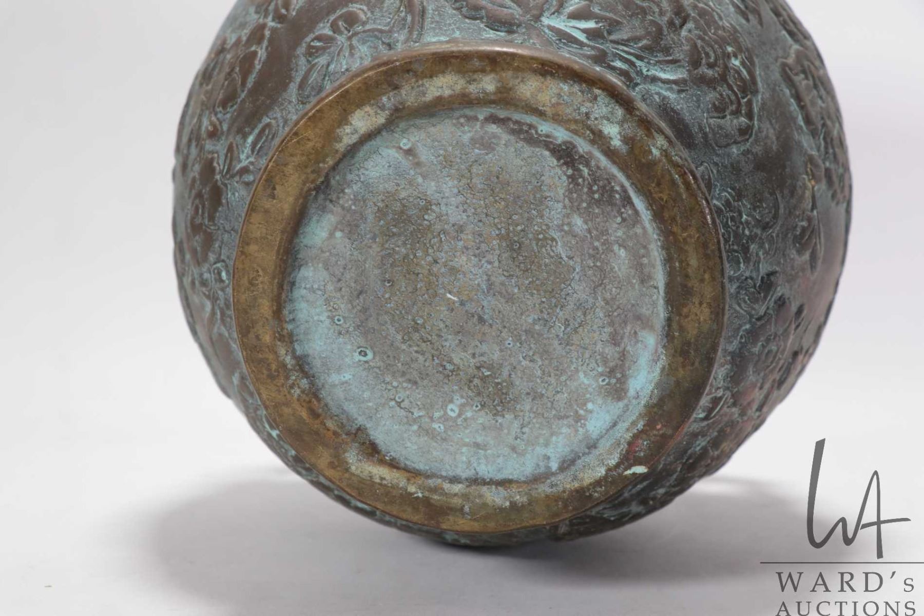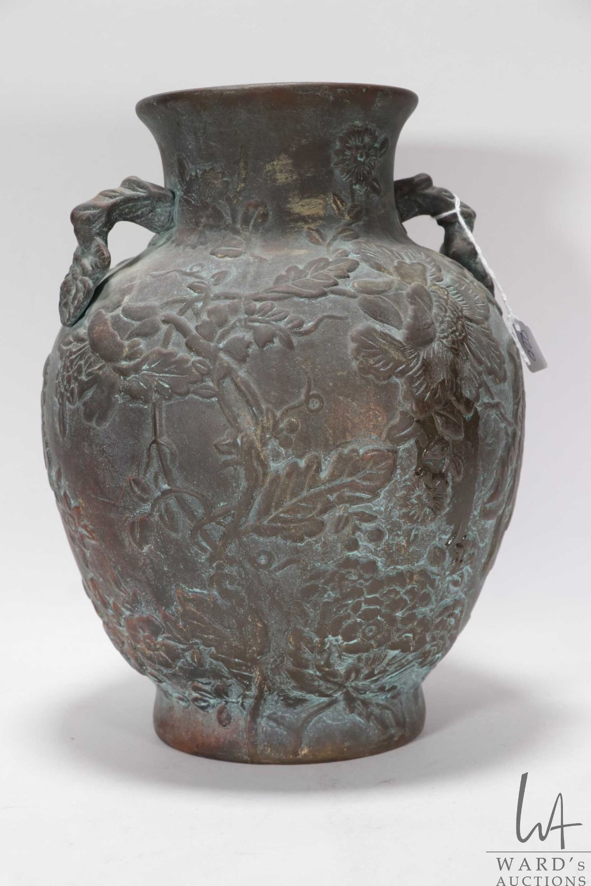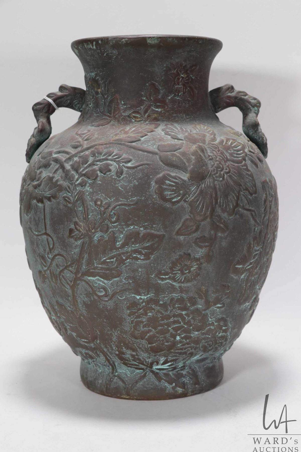 Vintage Asian bronze floral motif double handled vase, 12" in height