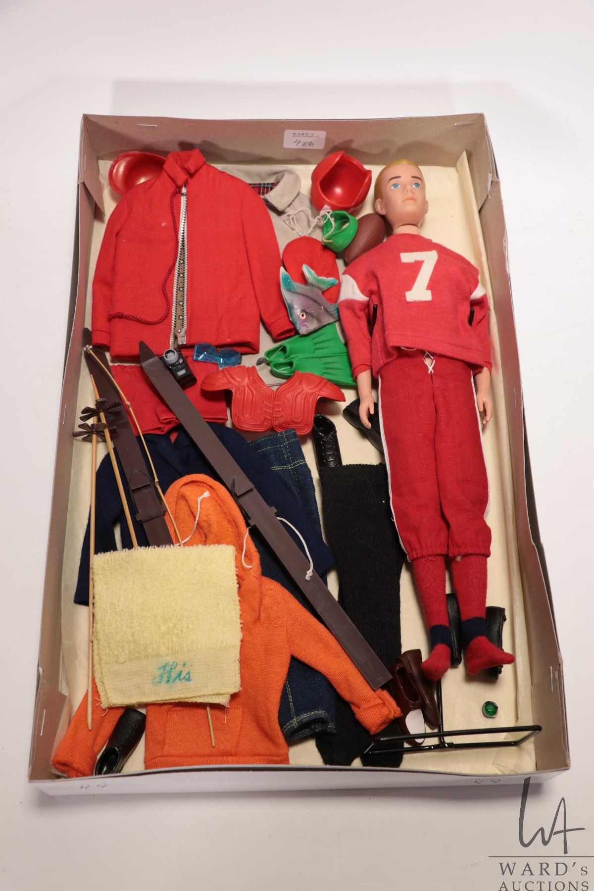 Vintage Barbie Ken doll with a selection of accessories and outfits including skis, football outfit