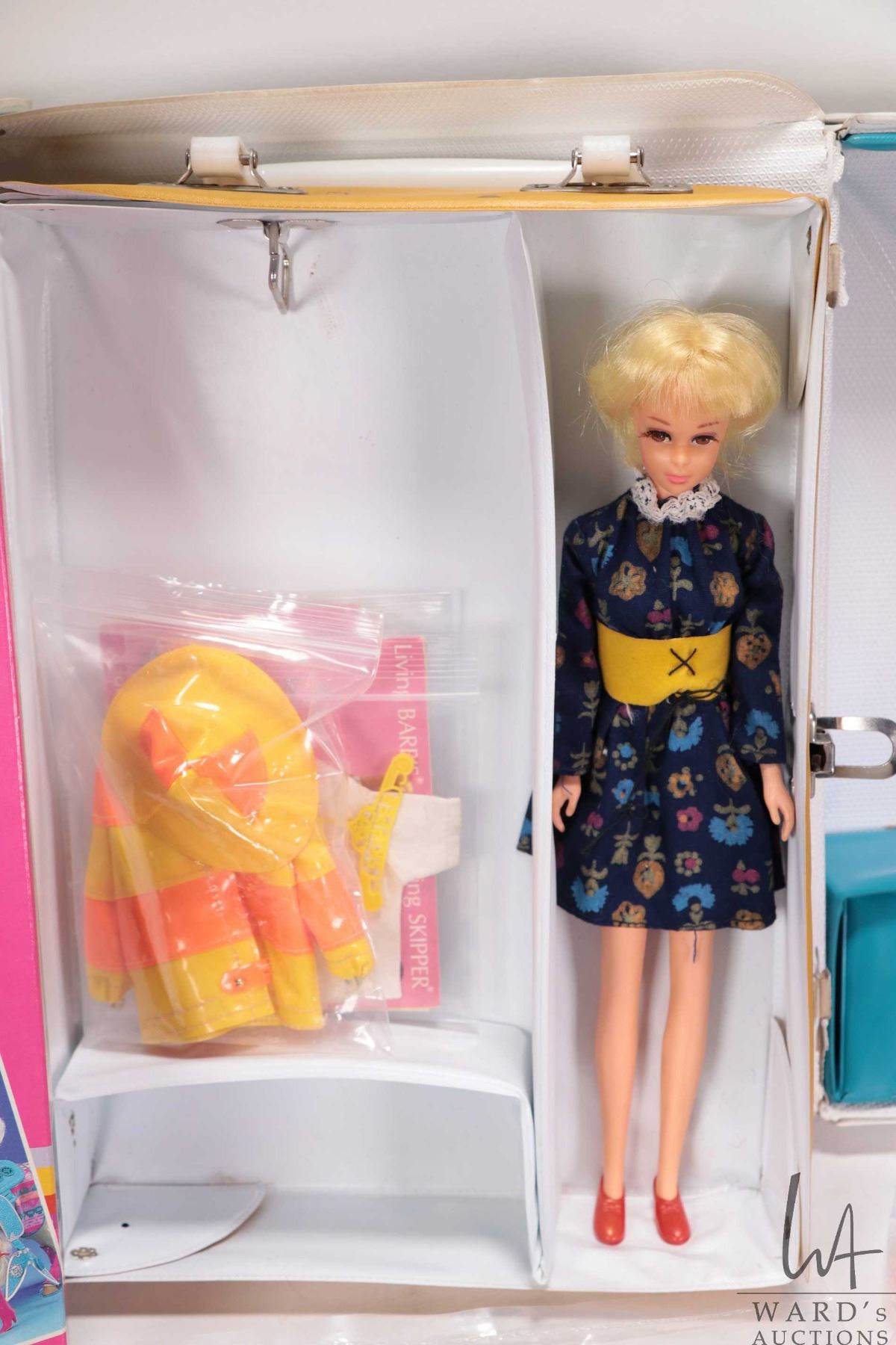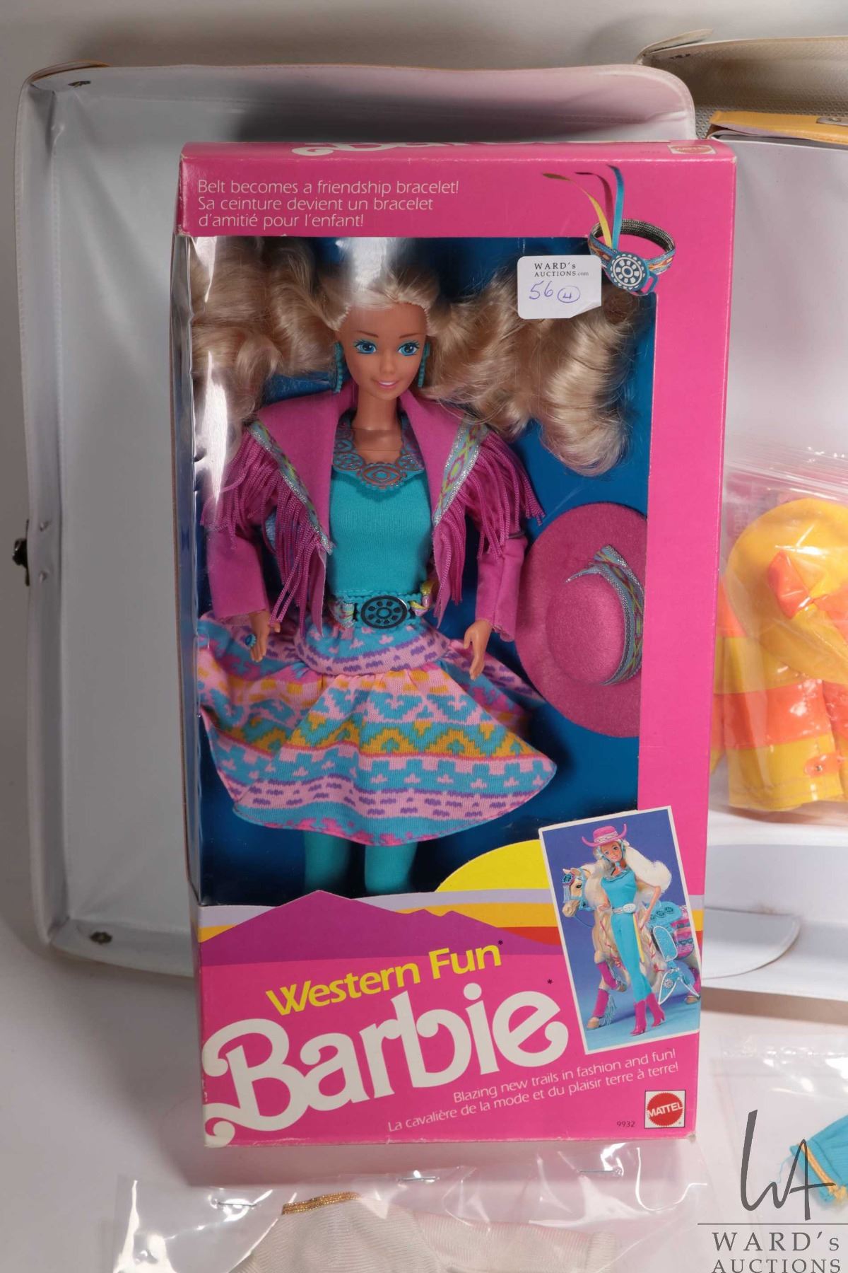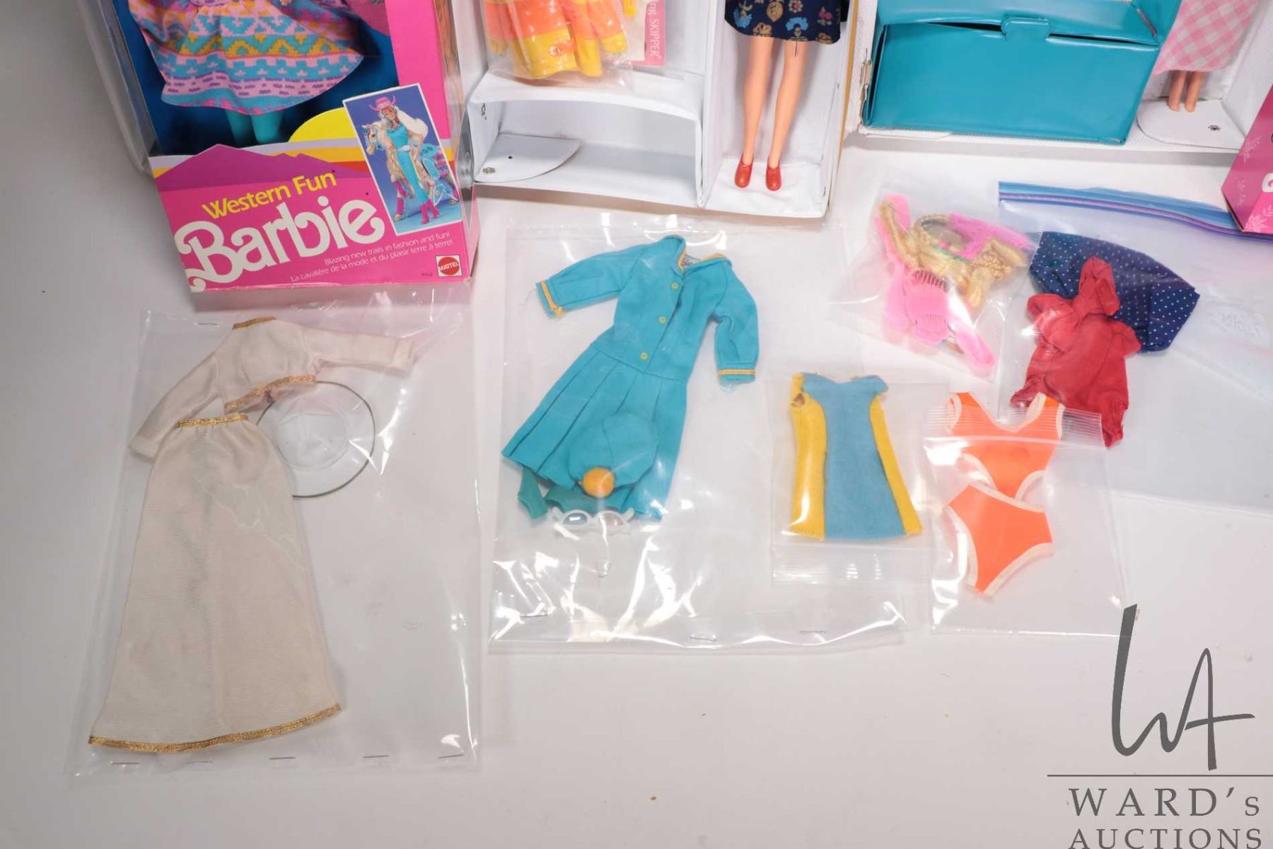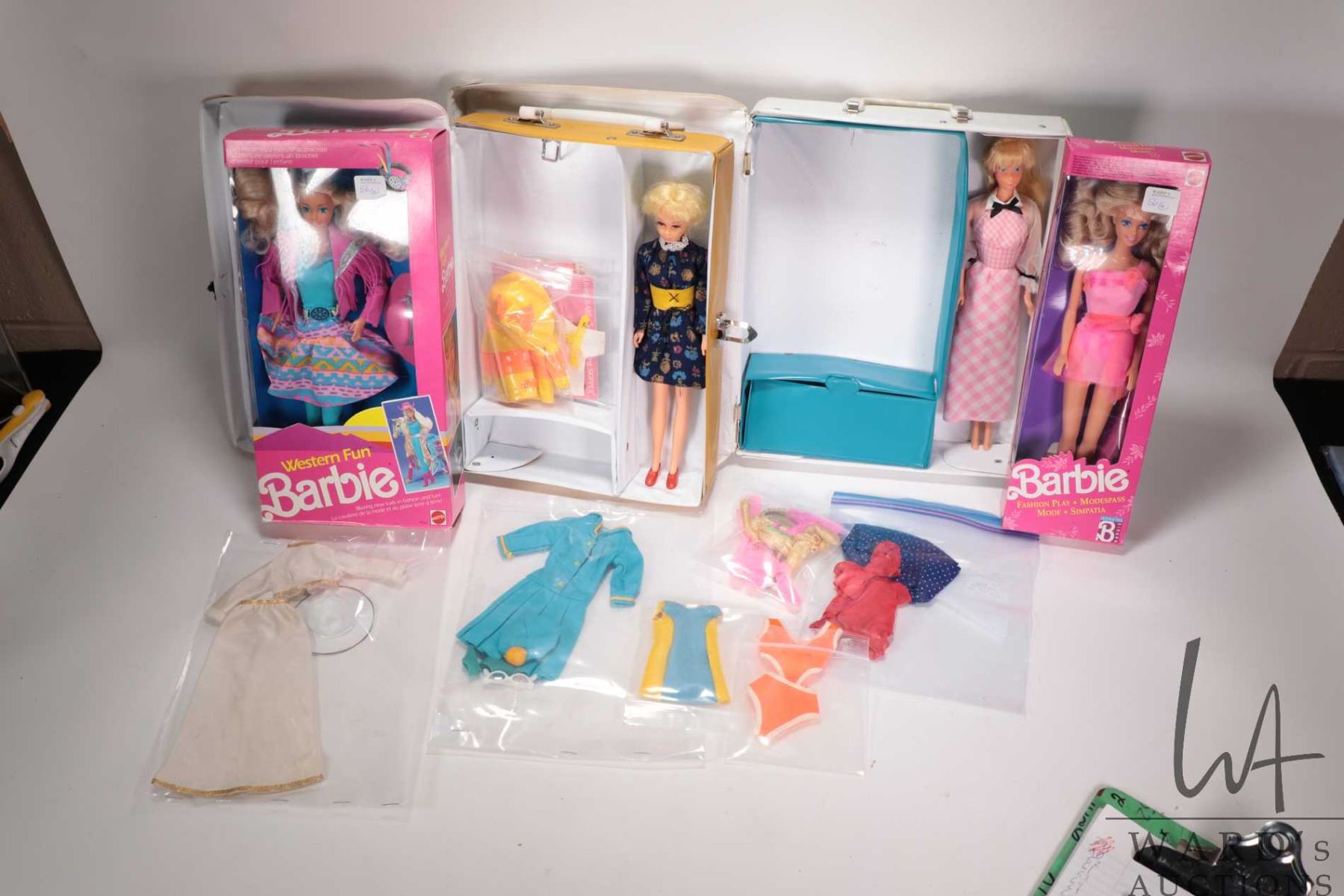 Vintage Barbie and Casey doll case with vintage Barbie and a selection of Barbie labeled outfits and accessories plus a My doll case with vintage MOD Barbie with rooted eyelashes and snap legs and a selection of labeled Francie /Barbie clothing etc. plus two Pink Box Barbie dolls including Barbie Fashion Play and Western Fun Barbie
