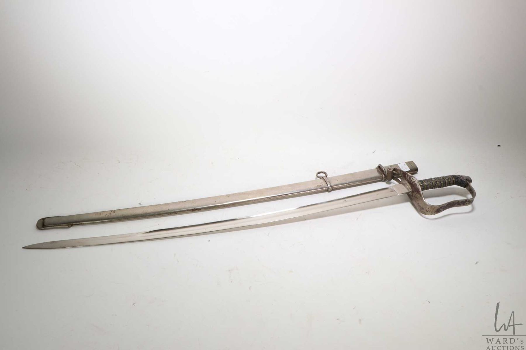 Vintage Calvary sword with scabbard, blade marked USN, no other markings seen, scabbard and hilt, appears to be nickel plated