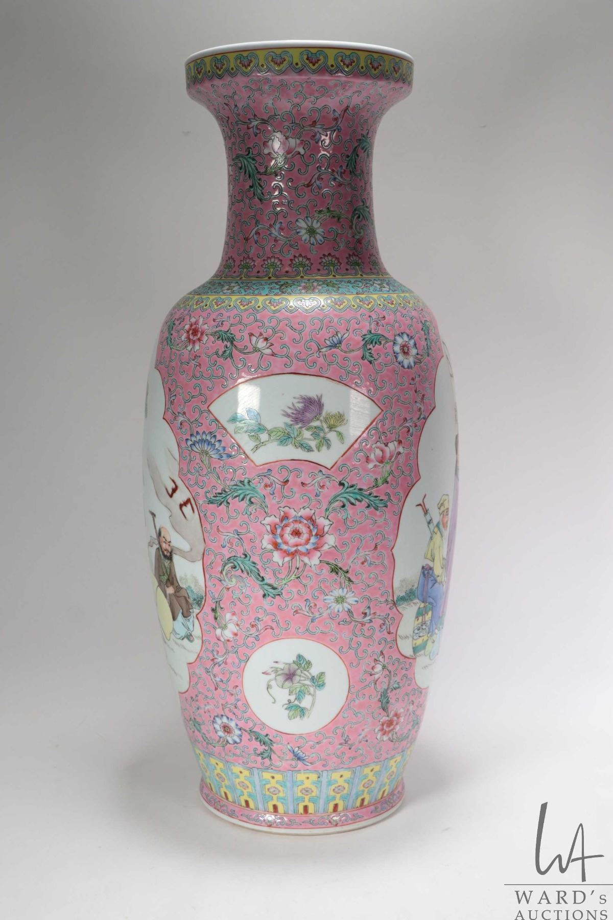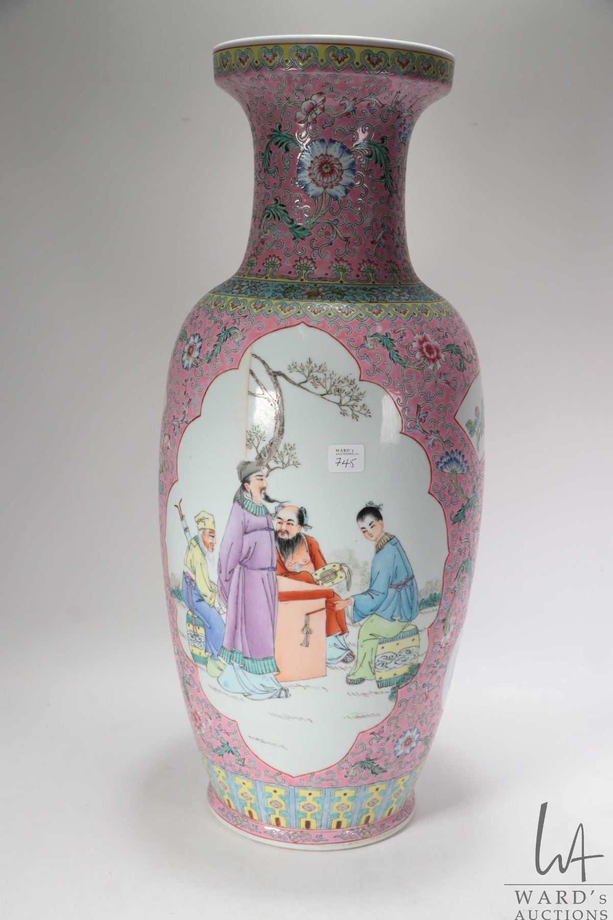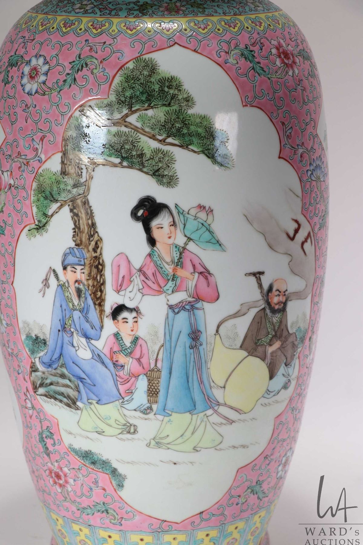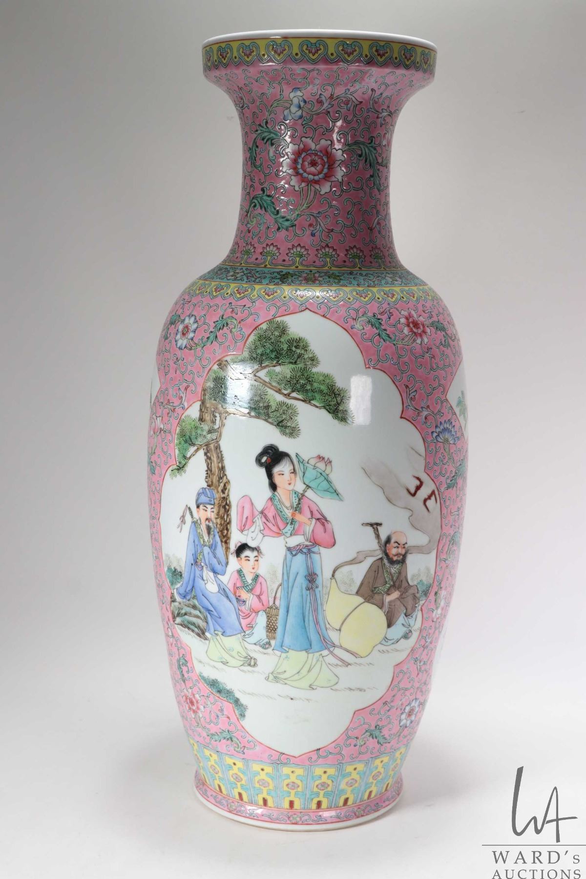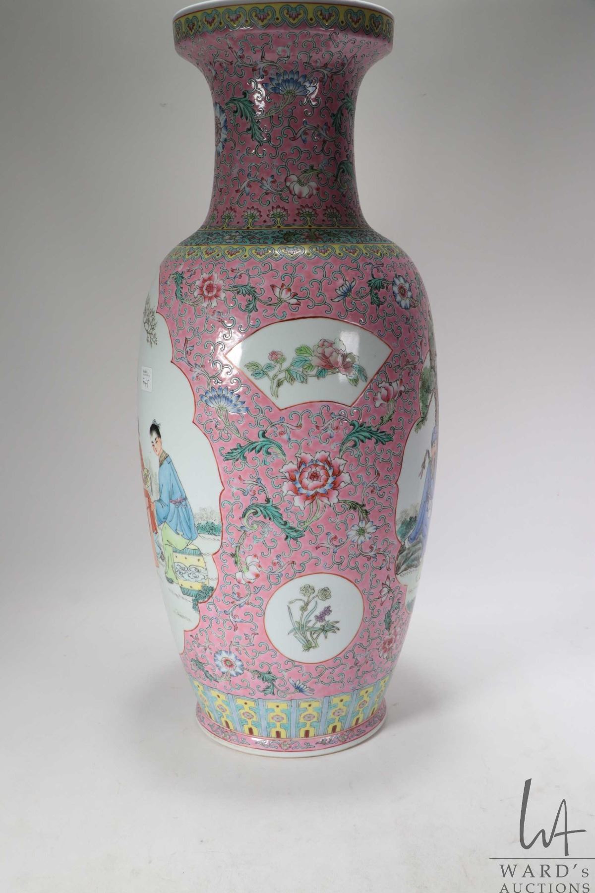 Vintage Chinese Famille rose hand painted floor vase with Geisha and Scholar cameos, 24" in height