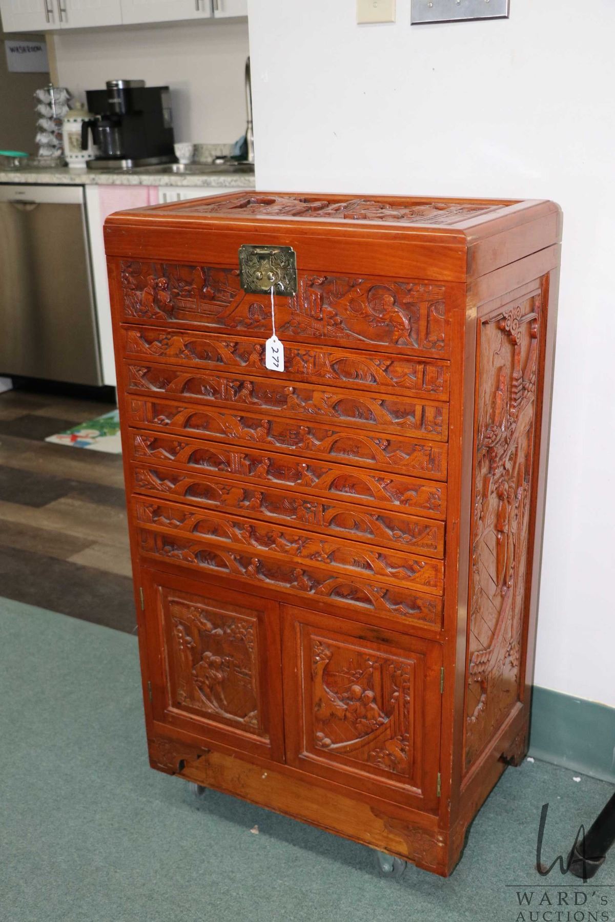 Vintage Chinese carved silver ware chest with two door cabinet, seven drawers and flip up top, note: closing lid on flip up locks the drawer. Non-original wheels, 49" H X 22" W X 14" D