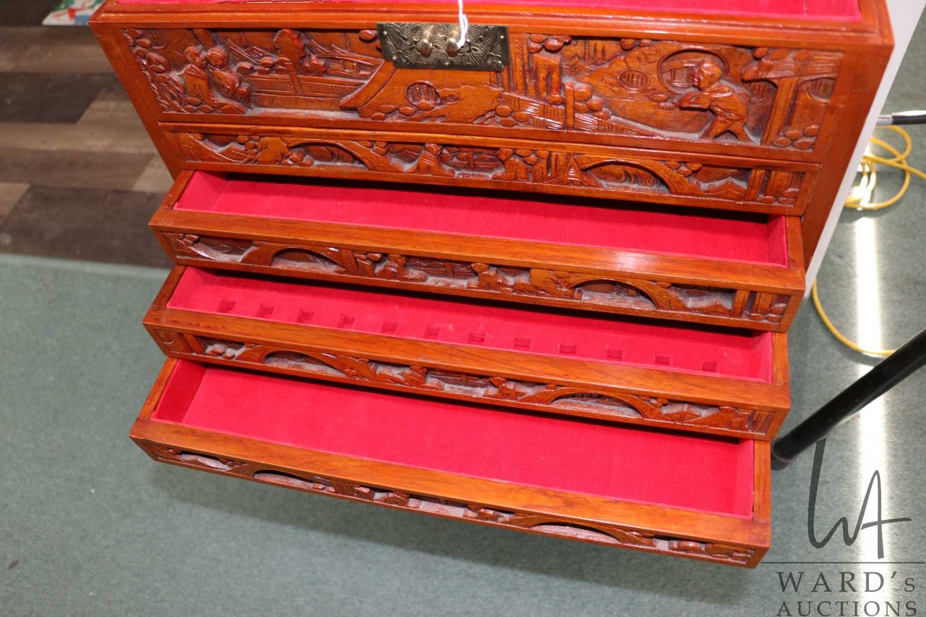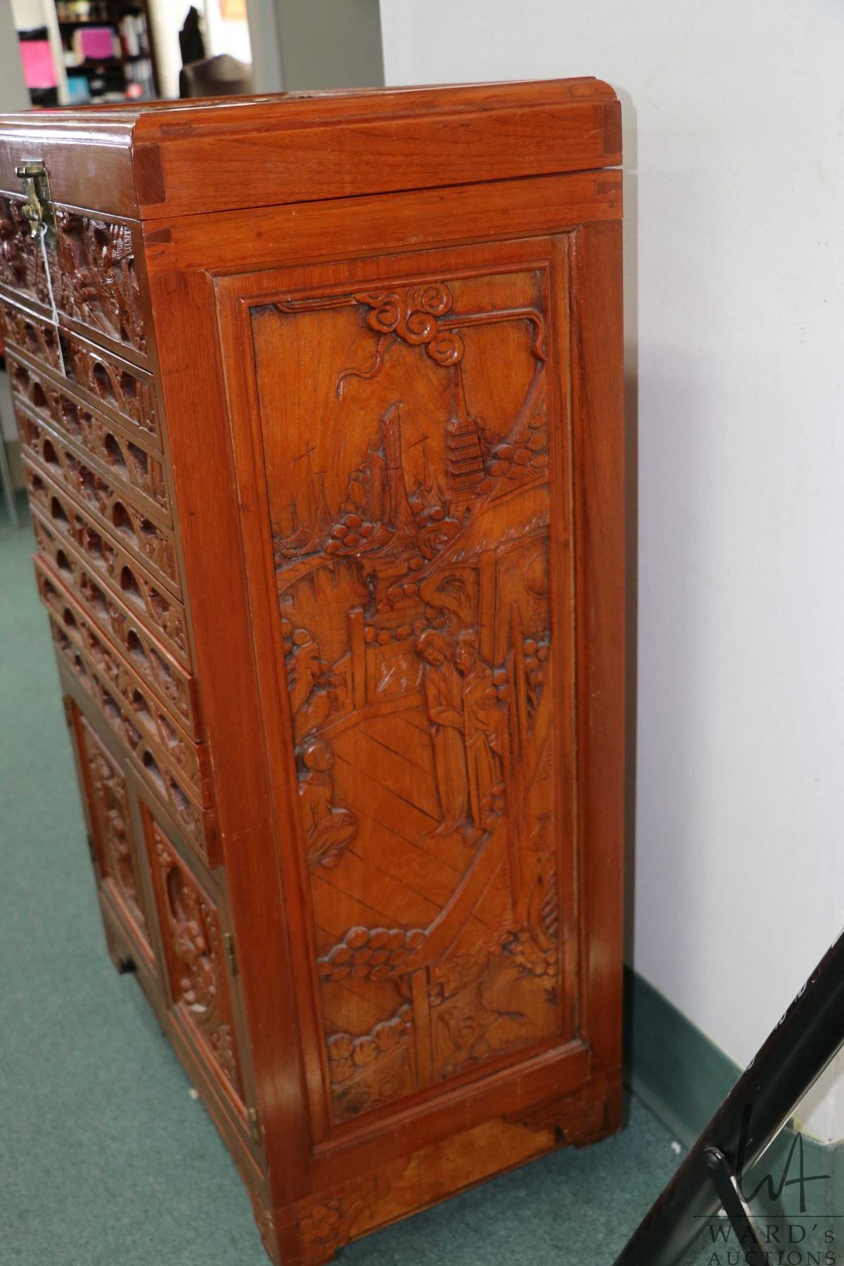 Vintage Chinese carved silver ware chest with two door cabinet, seven drawers and flip up top, note: