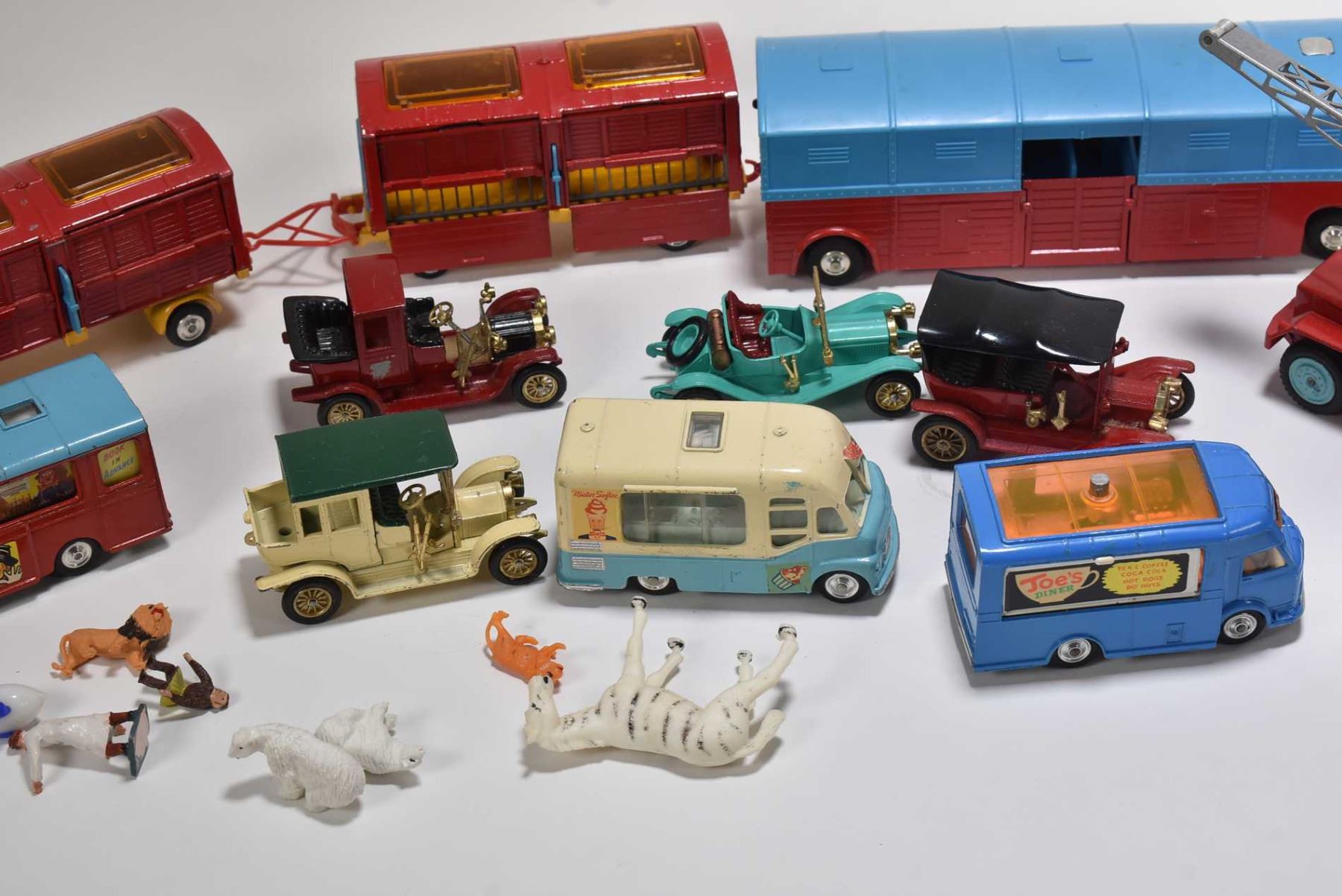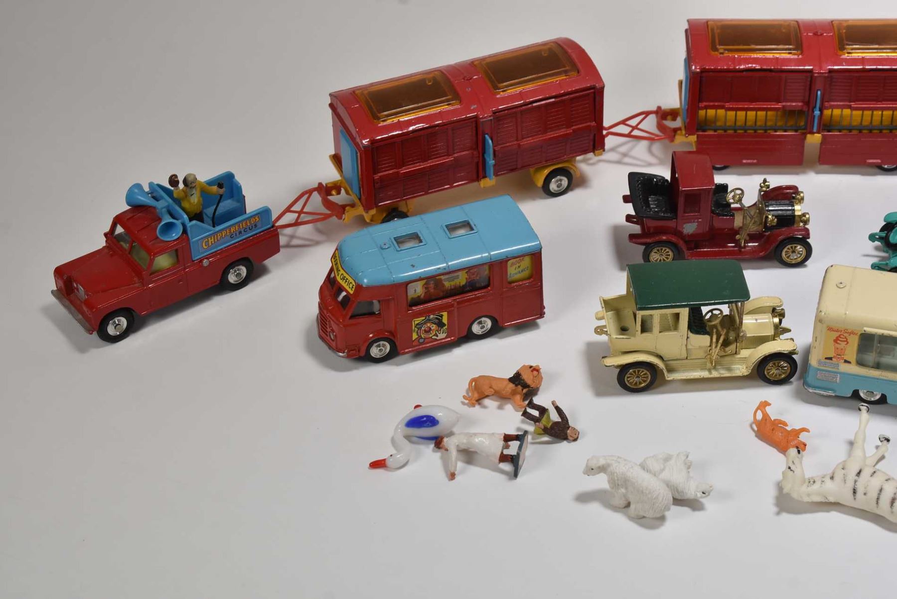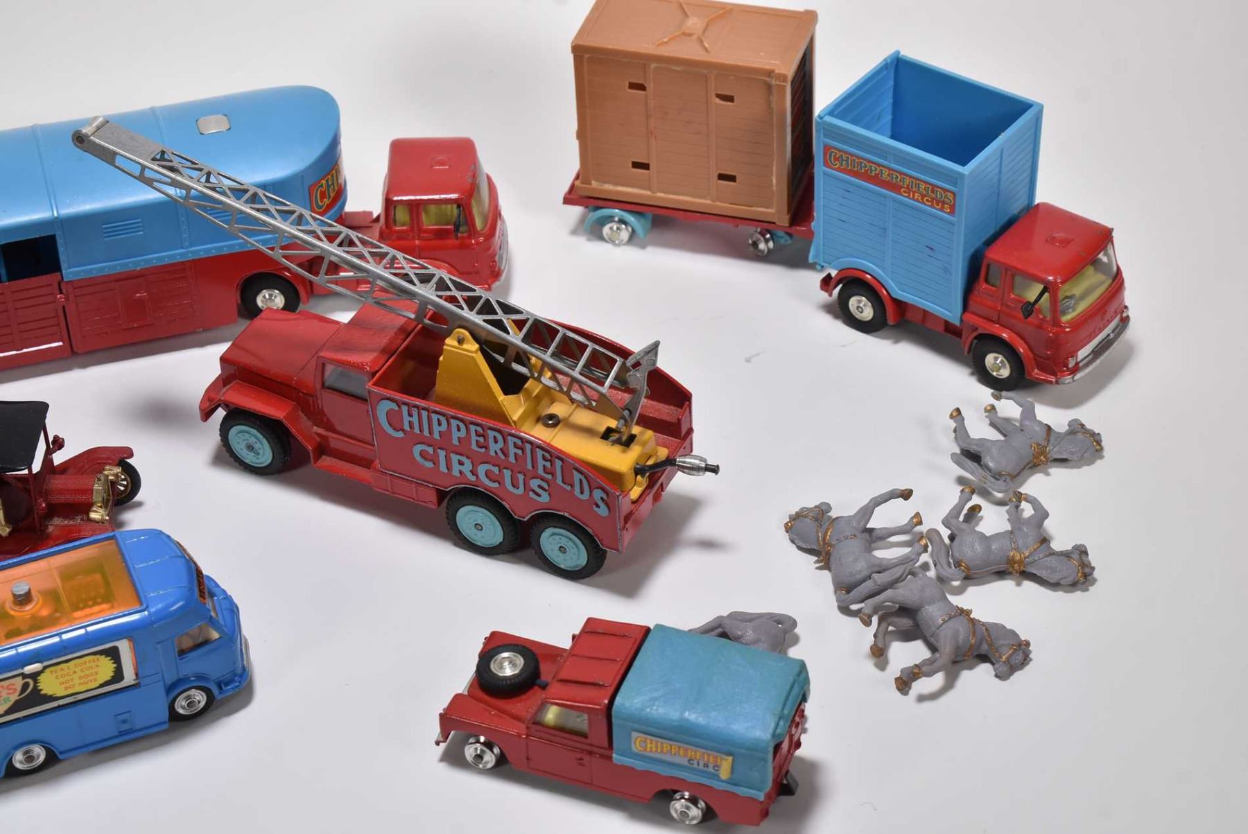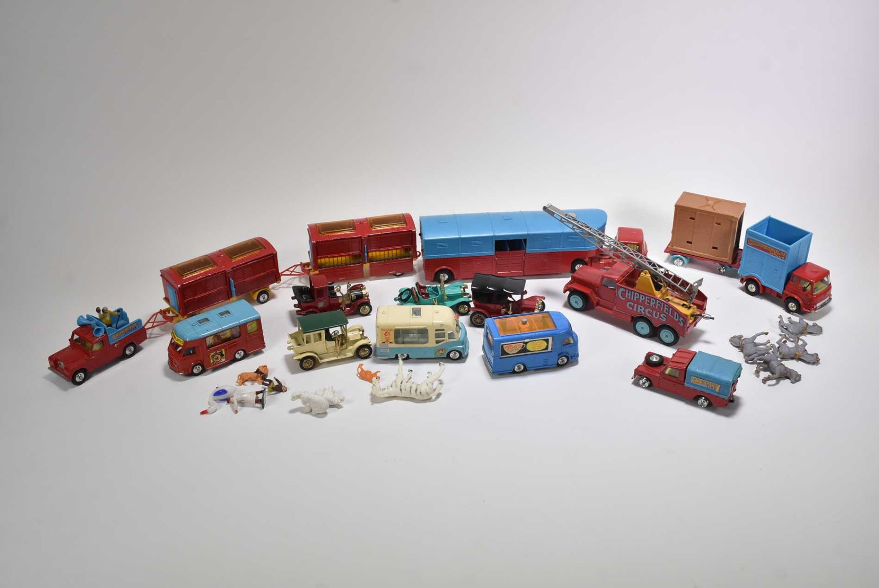 Vintage Corgi die cast "Chipperfields Circus" including semi trailer truck, truck with crane, two snack vehicles, one flat bed truck, one pick up truck with canopy top, one booking office vehicle, animal truck, two animal trailers, one loud speaker truck with clown, an animal box for trailer, assorted animals and a worker plus four Lesney vintage style cars, note some wheels missing
