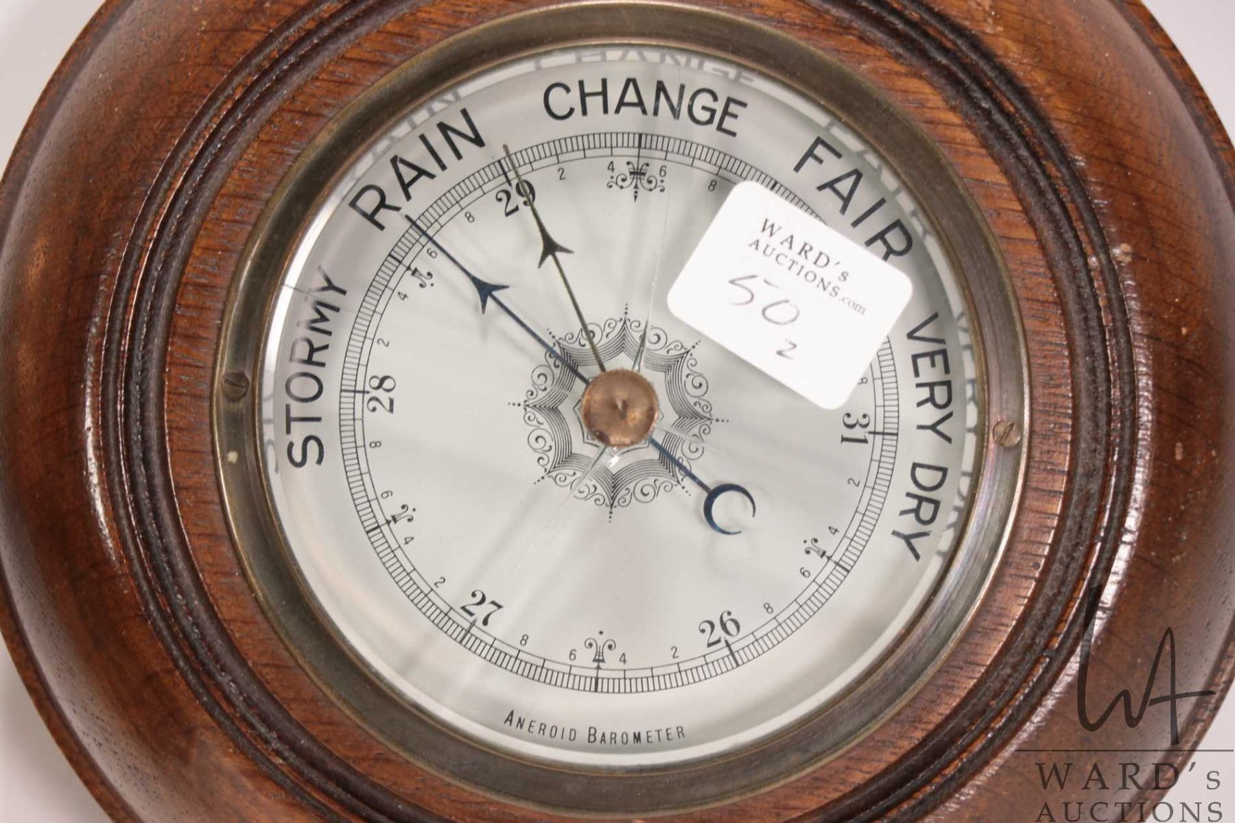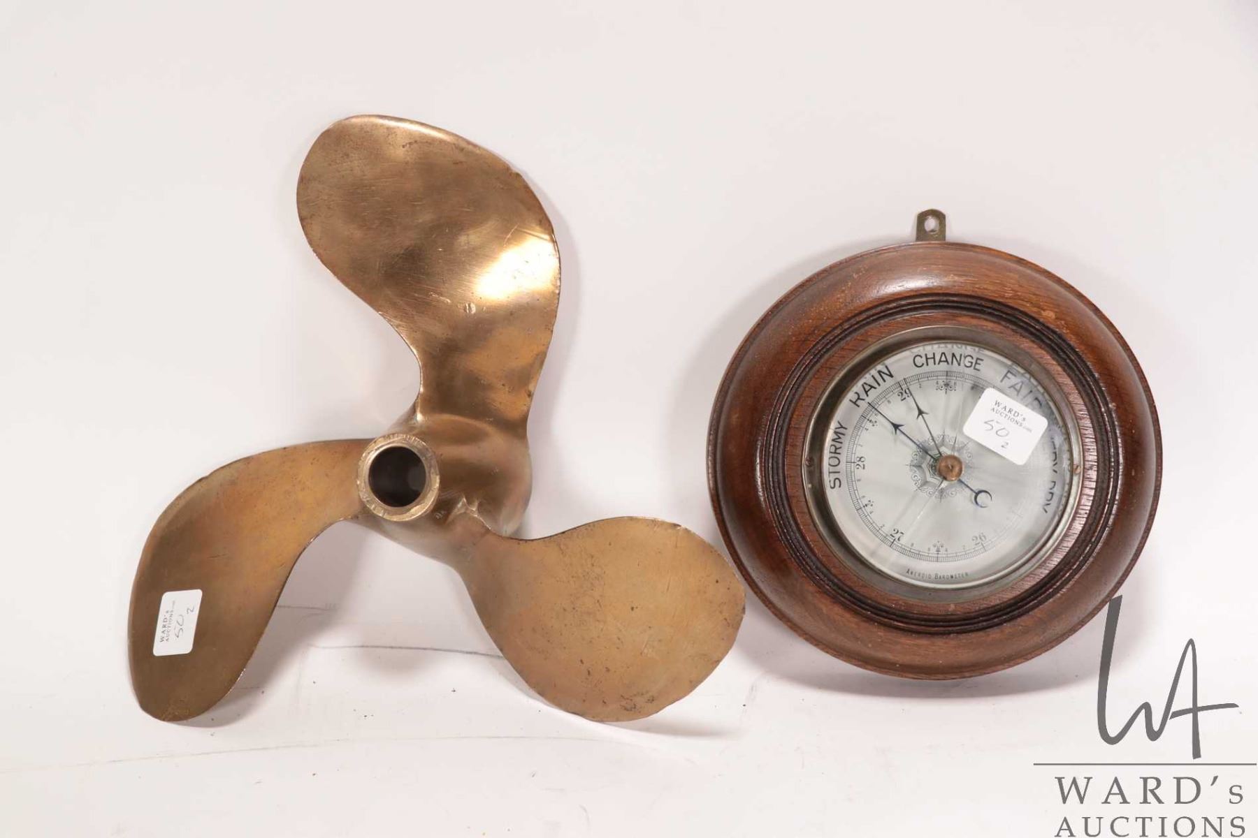 Vintage English made Aneroid barometer in oak mount, 6 1/2" in diameter, note: cracked glass and a brass boat propeller