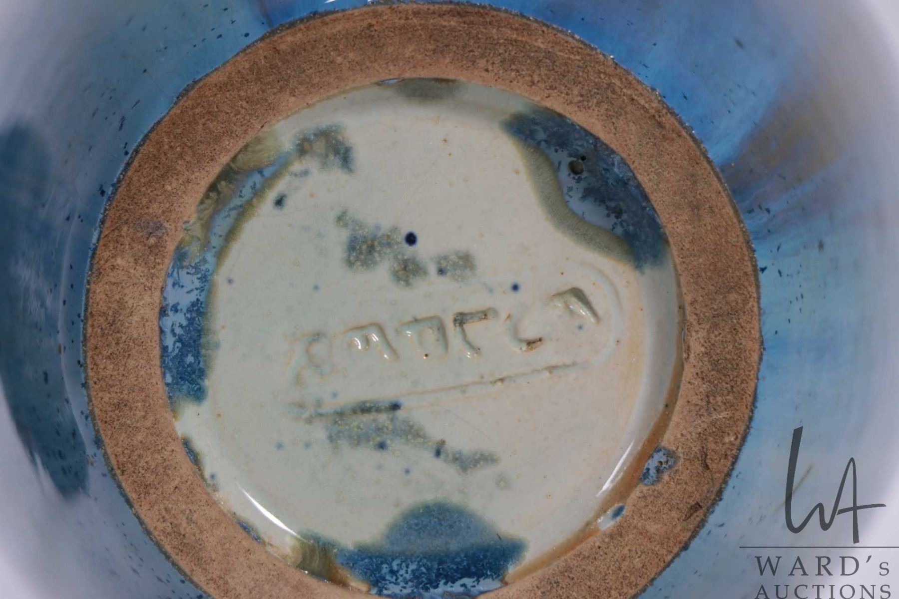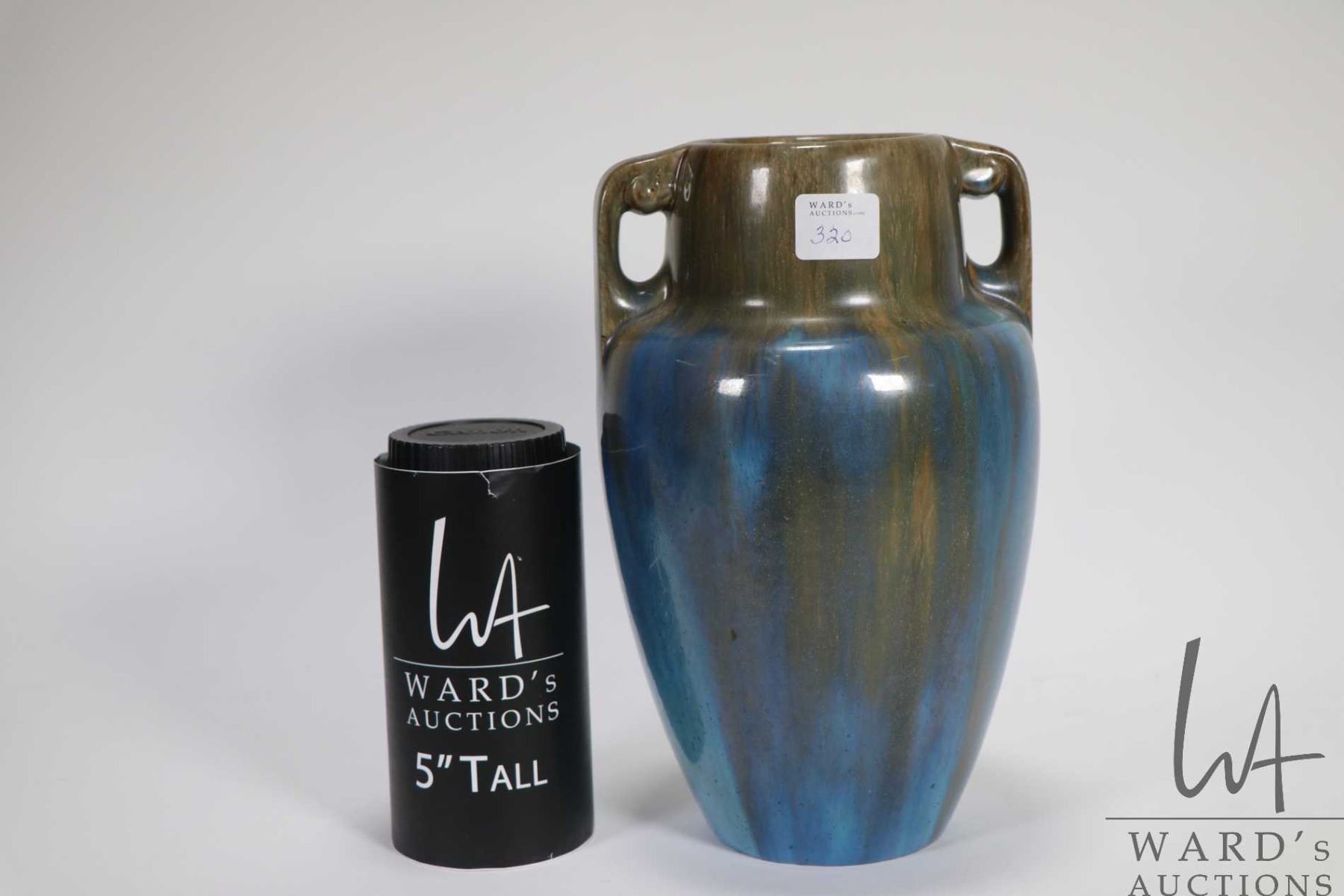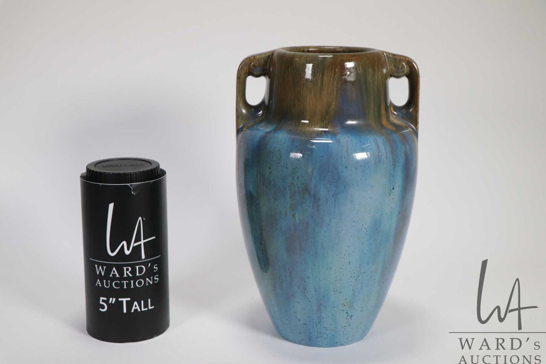 Vintage Fulper double handled, blue flambe pottery vase, 9" in height