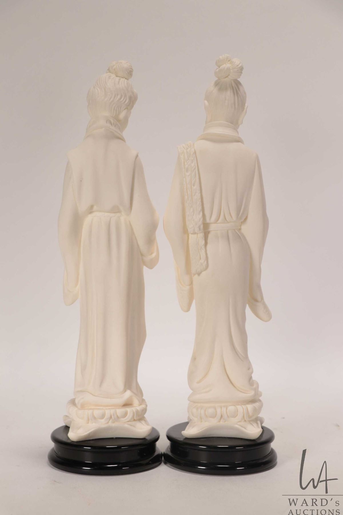 Vintage Golden Crown E&R Italy composition figures including geisha and wiseman, each approximately 10 1/2" in height