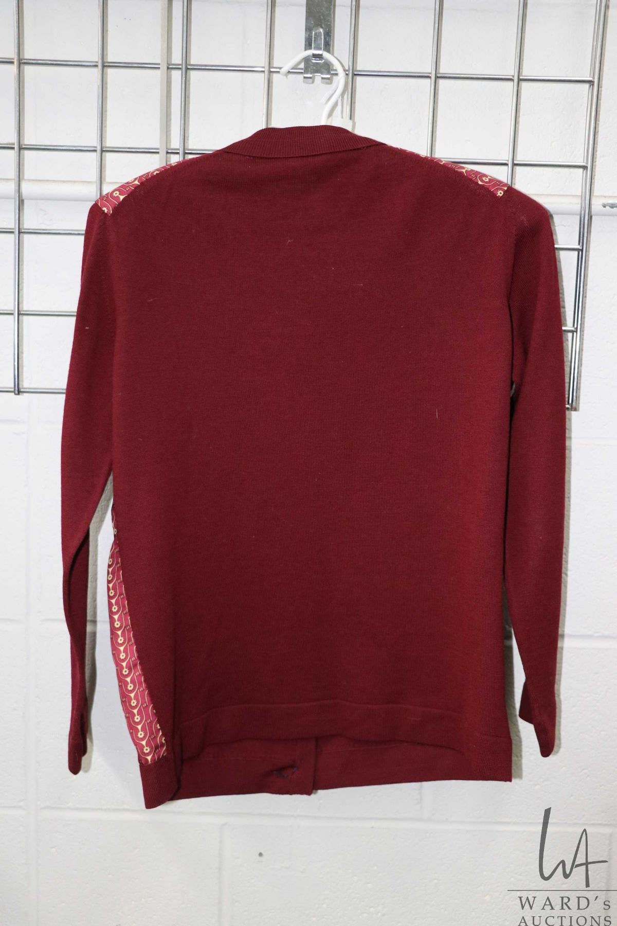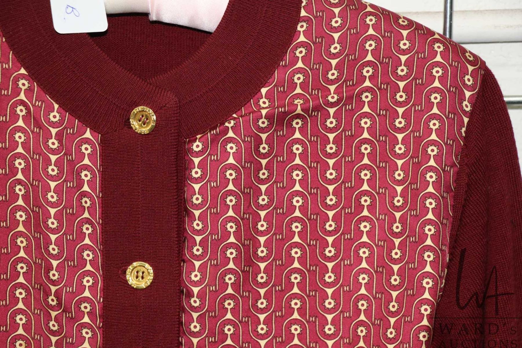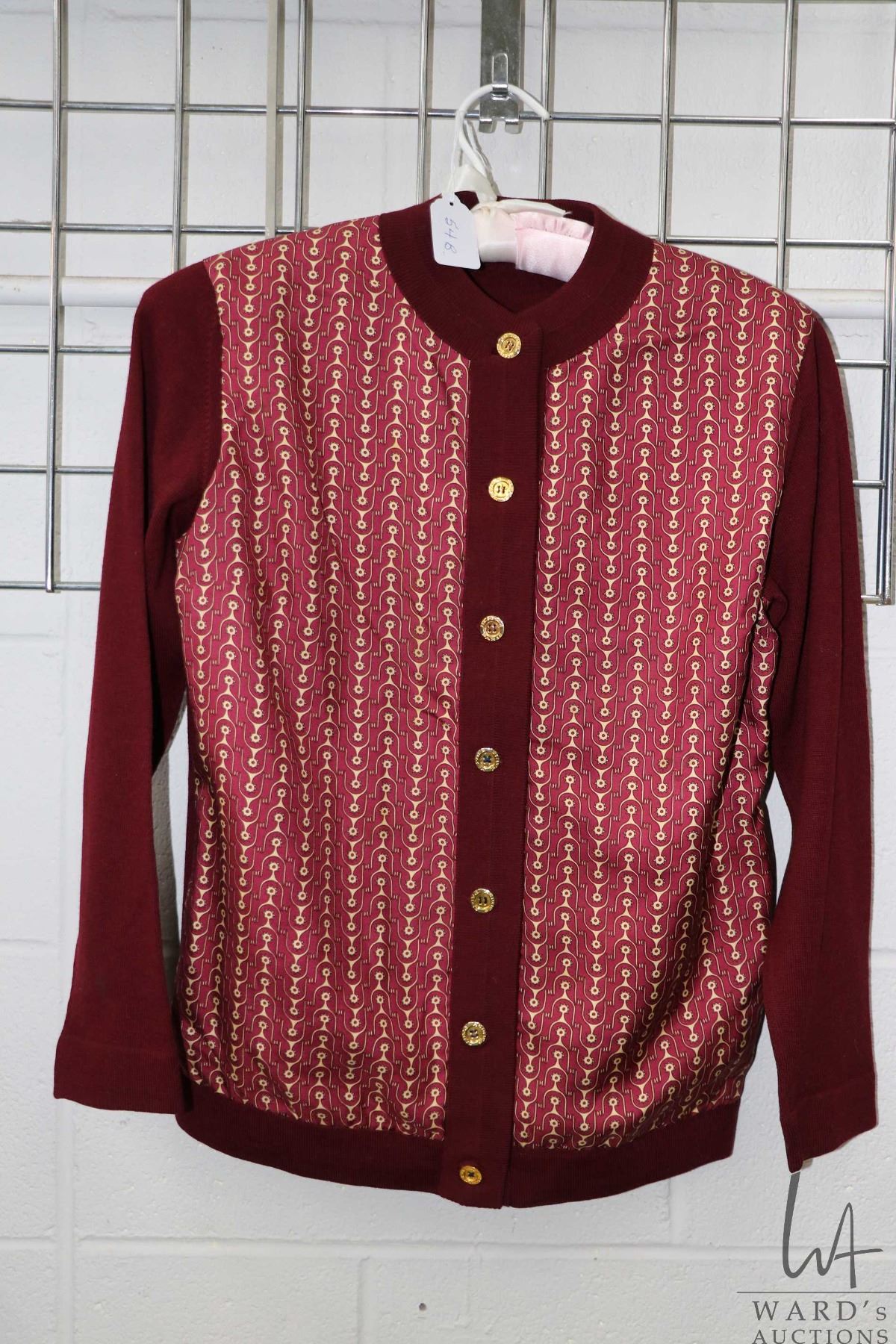 Vintage Hermes wool and stirrup printed silk cardigan, marked size 42 Note: buyers must satisfy themselves as to authenticity. Feel free to contact auction house regarding images that you require that may have been overlooked during original cataloguing and photography